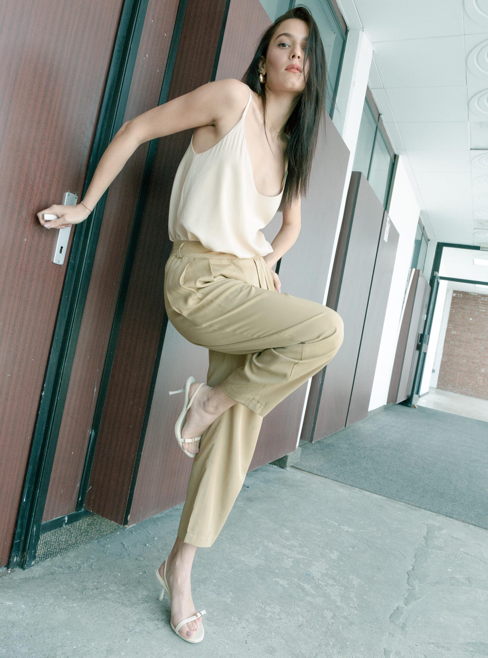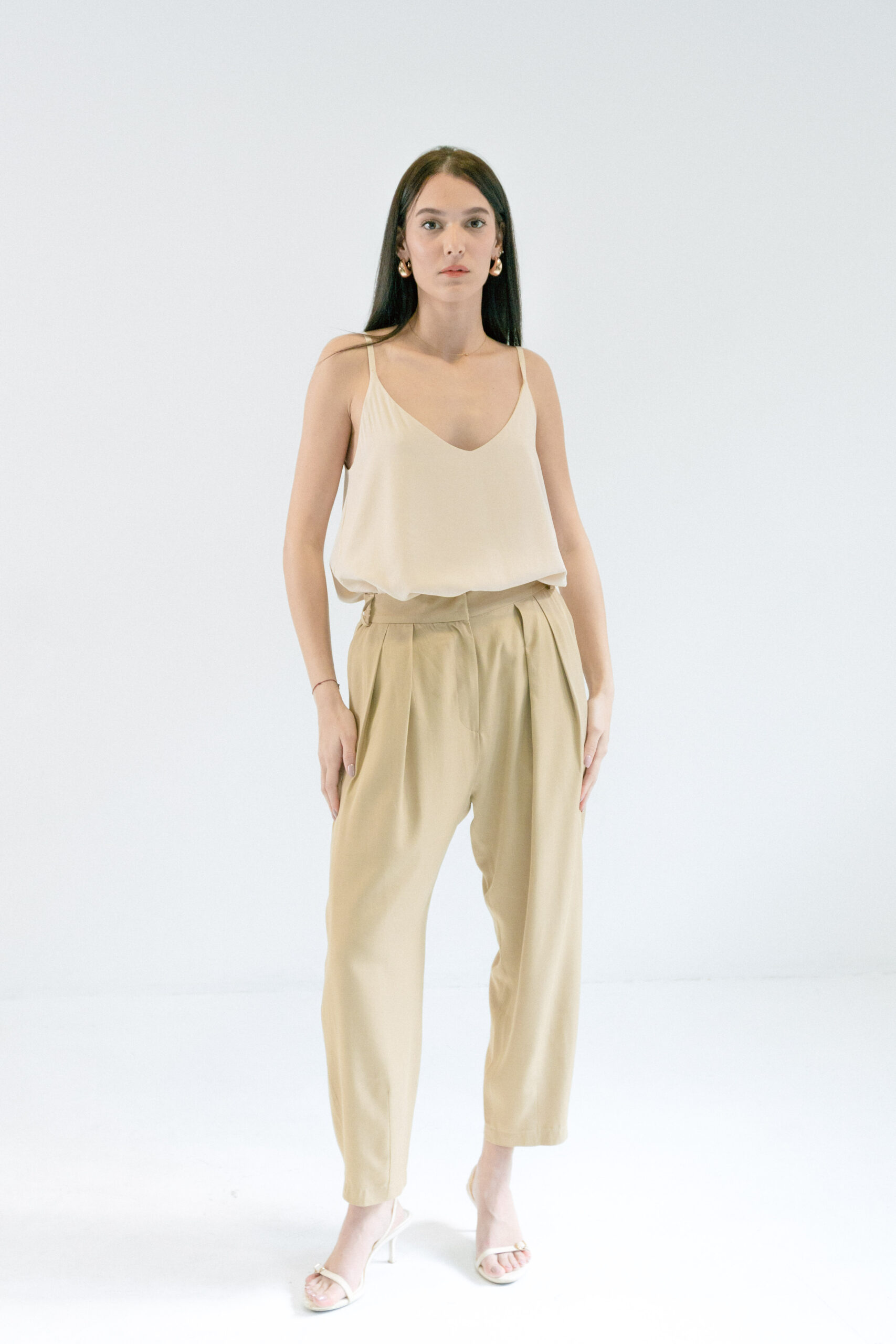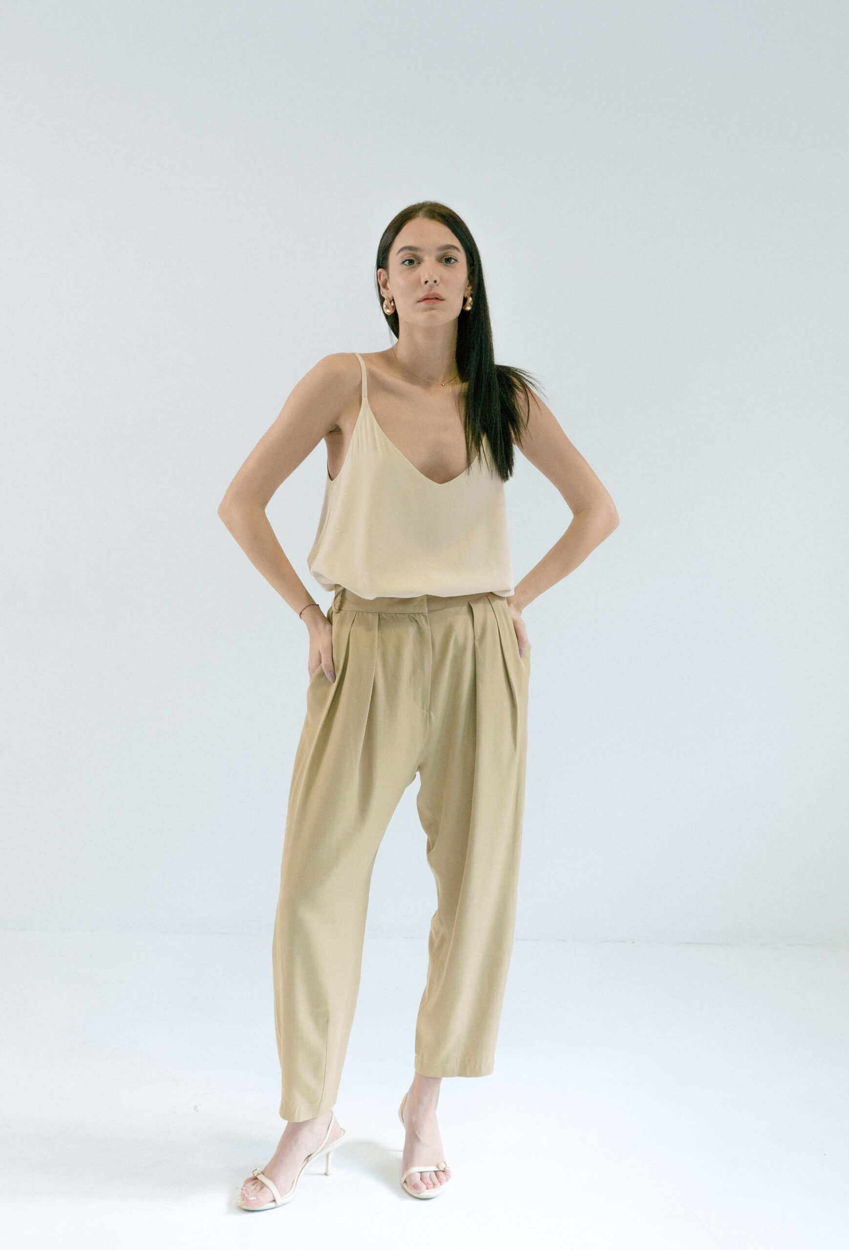 Lagane pantalone od 50% Lyocela (Tencel®) i 50% modala, predviđene dužine do malo iznad članaka, carrot kroja sa suptilnim faltama na prednjem delu, sa džepovima sa strane i skrivenim kopčanjem, idealne su za sve prilike i stilove. Savršeno stoje različitim tipovima građe.