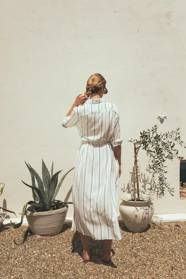 Predstavljamo Haljinu Kala, izuzetan dodatak našoj Slow kolekciji, koji spaja klasičnu eleganciju sa modernim detaljima. Ova košulja-haljina srednje dužine, sa prugastim dezenom visokokvalitetne viskoze, nudi idealnu kombinaciju udobnosti i stila. Bež dugmad i praktični džepovi sa strane dodaju funkcionalnost, dok pojas za vezivanje omogućava fino prilagođavanje siluete, ističući vašu figuru sa jednostavnošću.