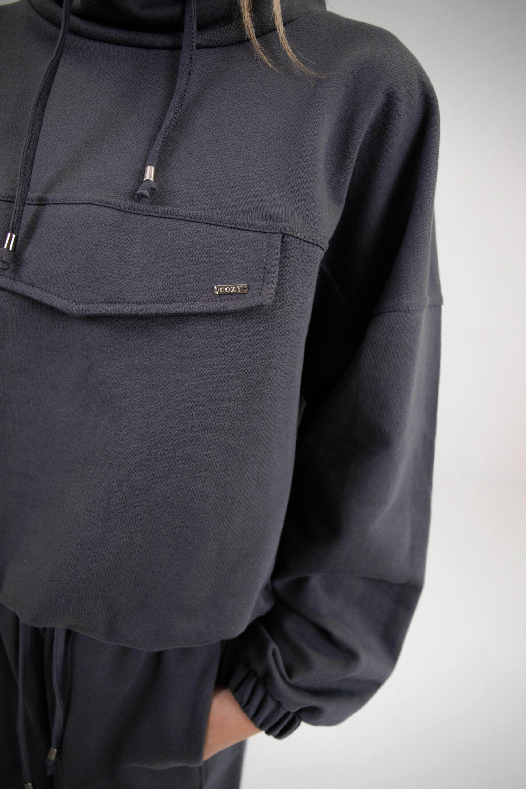 Duks Snugly u tamno sivoj boji osmišljen je kao spoj udobnosti i modernog dizajna. Kratak i širi kroj daje mu ležernu notu, dok visoka kragna sa učkurom i imitacija patne džepa dodaju poseban šmek. Lako se kombinuje u različitim prilikama i savršen je izbor za svakodnevni stil.
