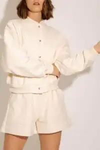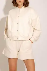 Bomber duks jakna od pamuka spaja udobnost i eleganciju na savršen način. Pamučni materijal pruža prijatan osećaj na koži, dok neutralna boja i opušteni kroj čine ovu jaknu izuzetno prilagodljivom za različite prilike. Ova klasična jakna može se nositi kao lagani dodatak preko trenerke za sportski izgled ili uparena s formalnijim komadima za sofisticiraniji stil.