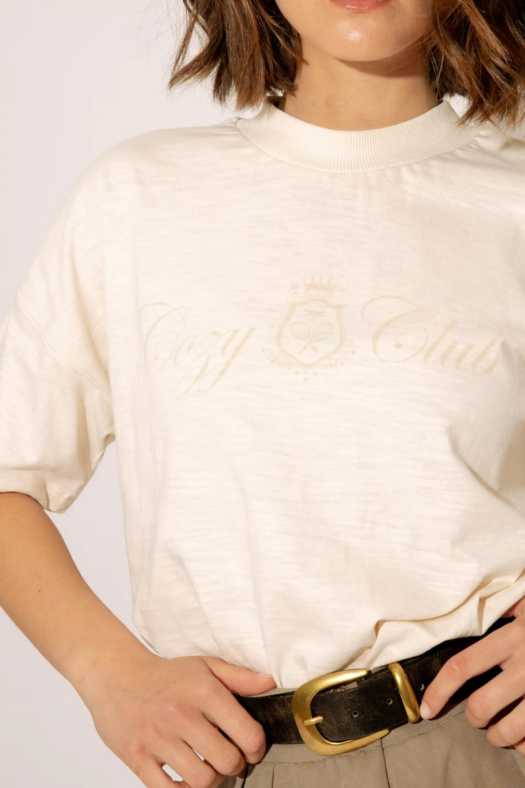 Oversized Cozy Club majica od 100% pamuka pruža udobnost na potpuno novom nivou. Pamučni materijal omogućava koži da diše, dok opušteni kroj i rukavi do laktova omogućavaju slobodno kretanje. Dodatak rendera oko vrata dodaje notu sofisticiranosti, čineći ovu majicu idealnim izborom za opuštene, ali chic izglede.