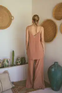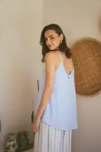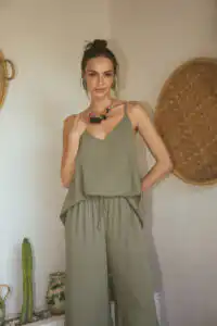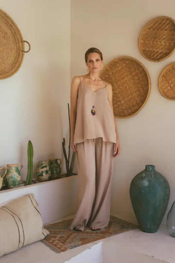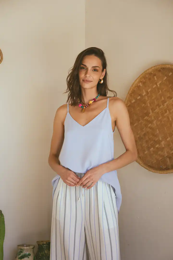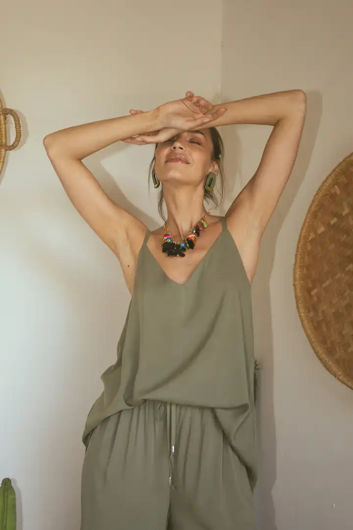 Majica na bretele Laganini predstavlja savršeni letnji dodatak koji elegantno prelazi iz dnevnih u večernje kombinacije. Dostupna u bojama Clay, Olive, Sand, Black, i Blue, ova majica je savršen izbor za kreiranje raznovrsnih stajlinga. Nosite je uz Laganini pantalone za opušteni dnevni izgled ili dodajte sloj poput Laganini kimona za večernje prilike koje zahtevaju dodatnu sofisticiranost.