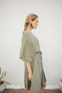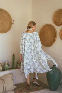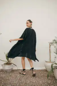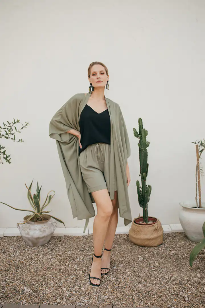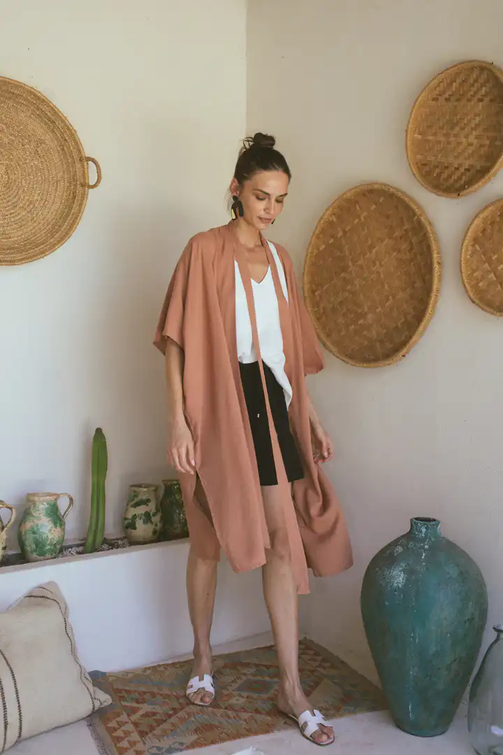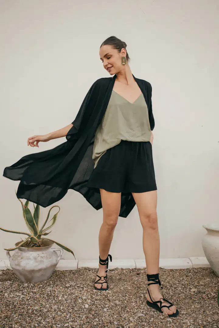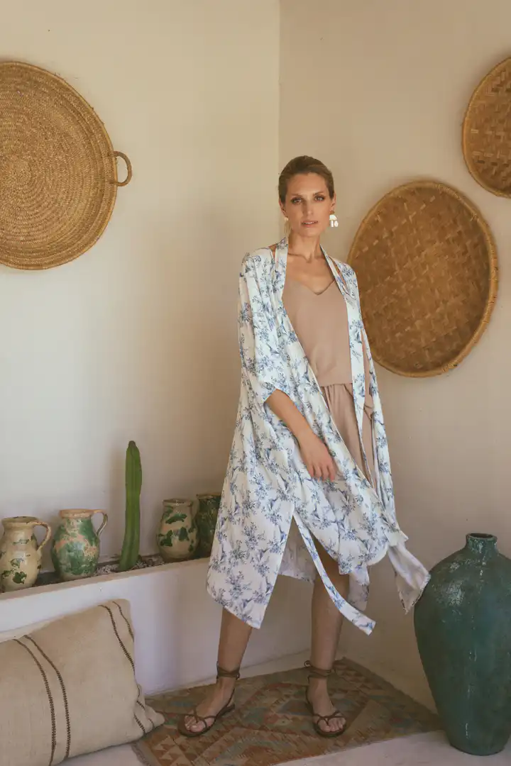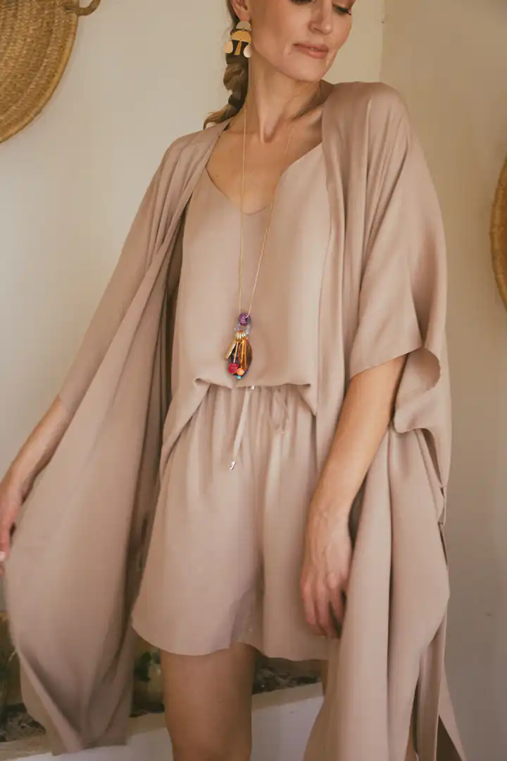 Otkrijte Kimono Laganini, višenamenski komad koji će postati vaš omiljeni saputnik tokom toplih letnjih dana. Dolazi u varijantama Clay, Black, Sand, Olive, i zaniljivi romanični dezen ovaj kimono možete nazvati kako želite – bademantil, kućna haljina, ili jednostavno kimono. Njegova svestranost omogućava da ga nosite na plaži, uz džins, šorts ili haljinu, pružajući besprekornu kombinaciju stila i udobnosti.