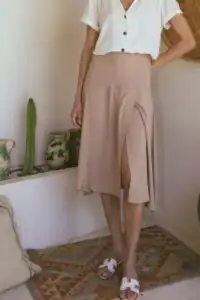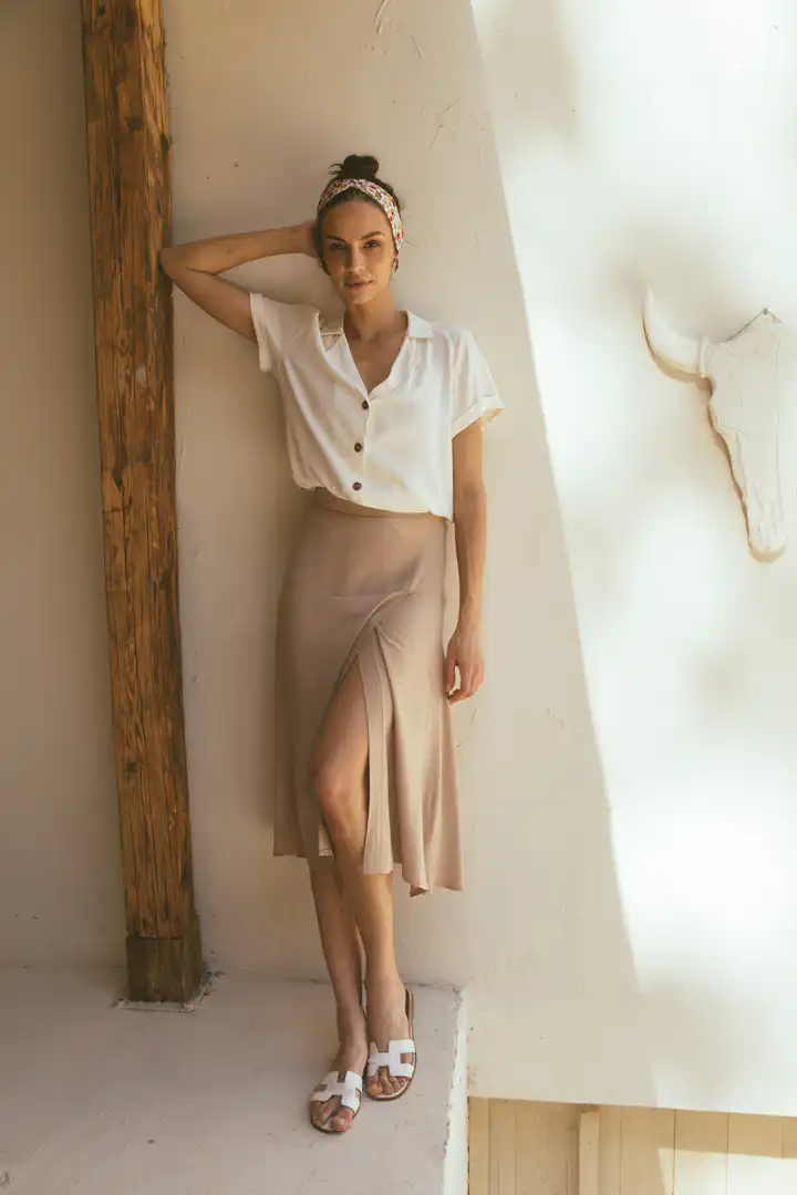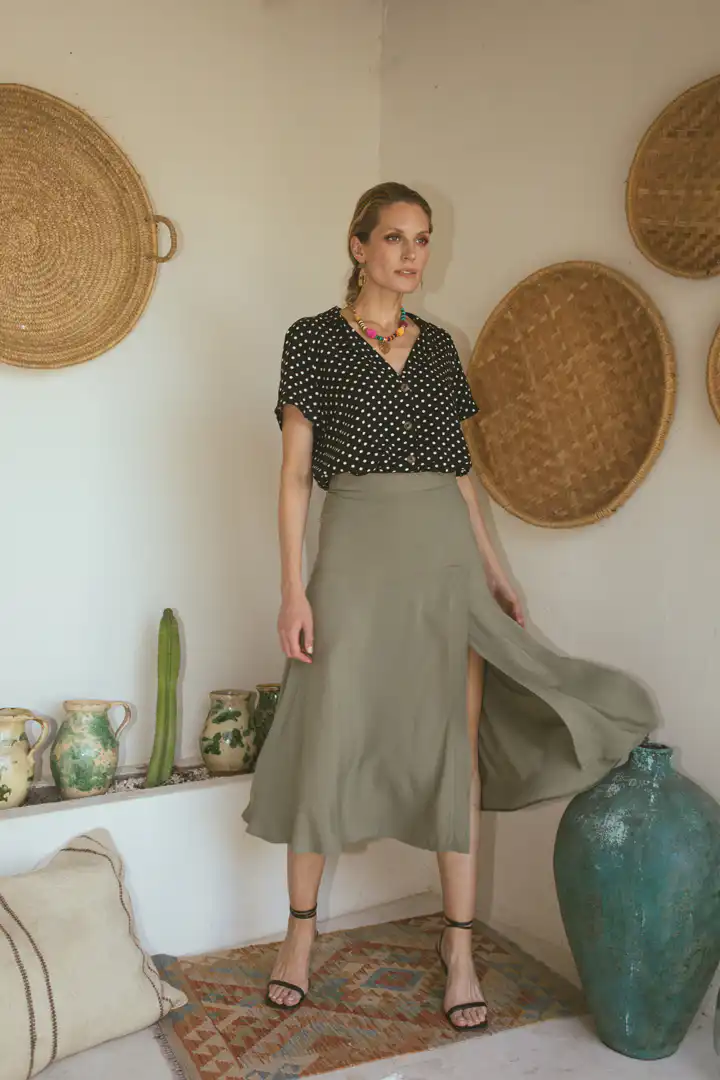 Dopunjujući našu liniju ležernih ali elegantnih komada, predstavljamo vam suknju Laganini. Dostupna u bojama Sand, Clay, Olive, i Black, ova suknja se ističe svojim šlicem sa strane i skrivenim rajsferšlusom, pružajući sofisticiran, ali pristupačan izgled. Izrađena od kvalitetne dezenirane viskoze, suknja Laganini je idealna za tople, sunčane dane, pružajući stil bez kompromisa na udobnost.