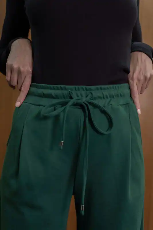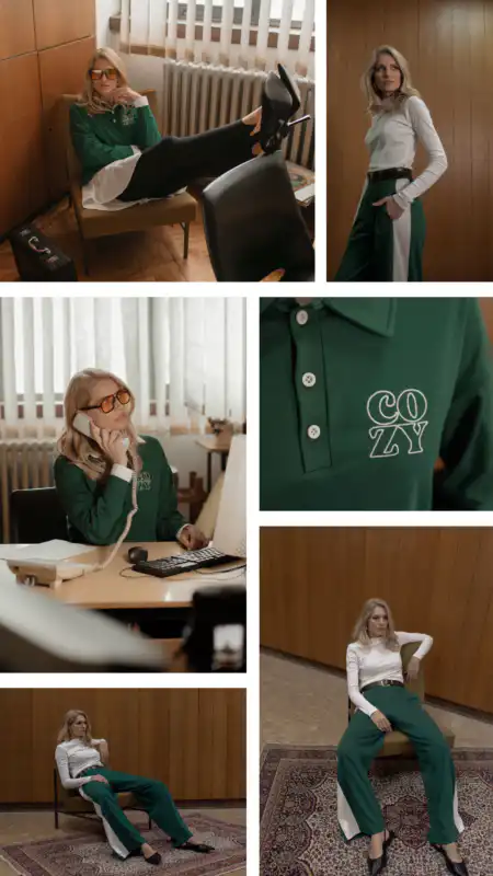 Iz naše STUDIO kolekcije izdvajamo majicu Polo Cozy Club, pantalone Marianne i trenerku Pallazo. Za sva tri modela izabrali smo mekani interlok od 100% pamuka koji savršeno prijanja uz telo pružajući osećaj komfora i udobnosti. Osim sastava, naš green trio karakteriše spoj elegancije i ležernosti, suptilan prelaz od biznis ka casual look-u.