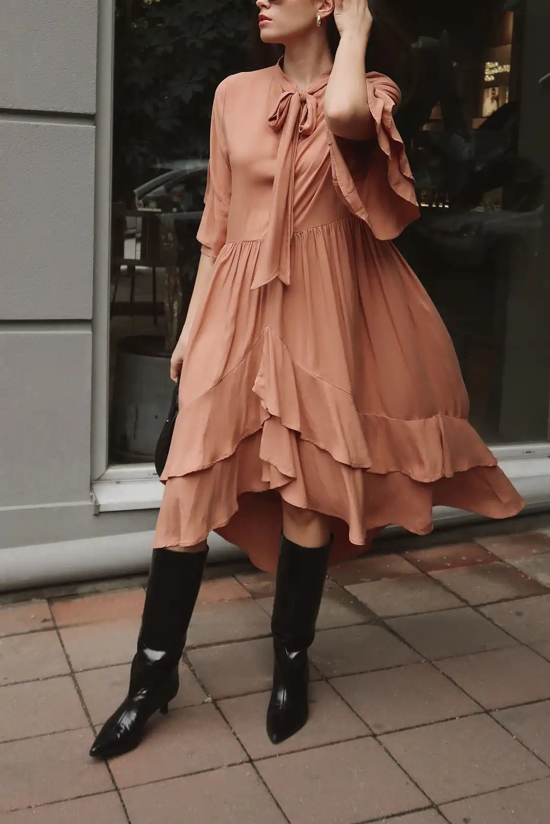 Devojka na fotografiji je visoka 172cm i nosi veličinu 36/38 – za pomoć u odabiru veličina pogledajte dimenzije proizvoda.