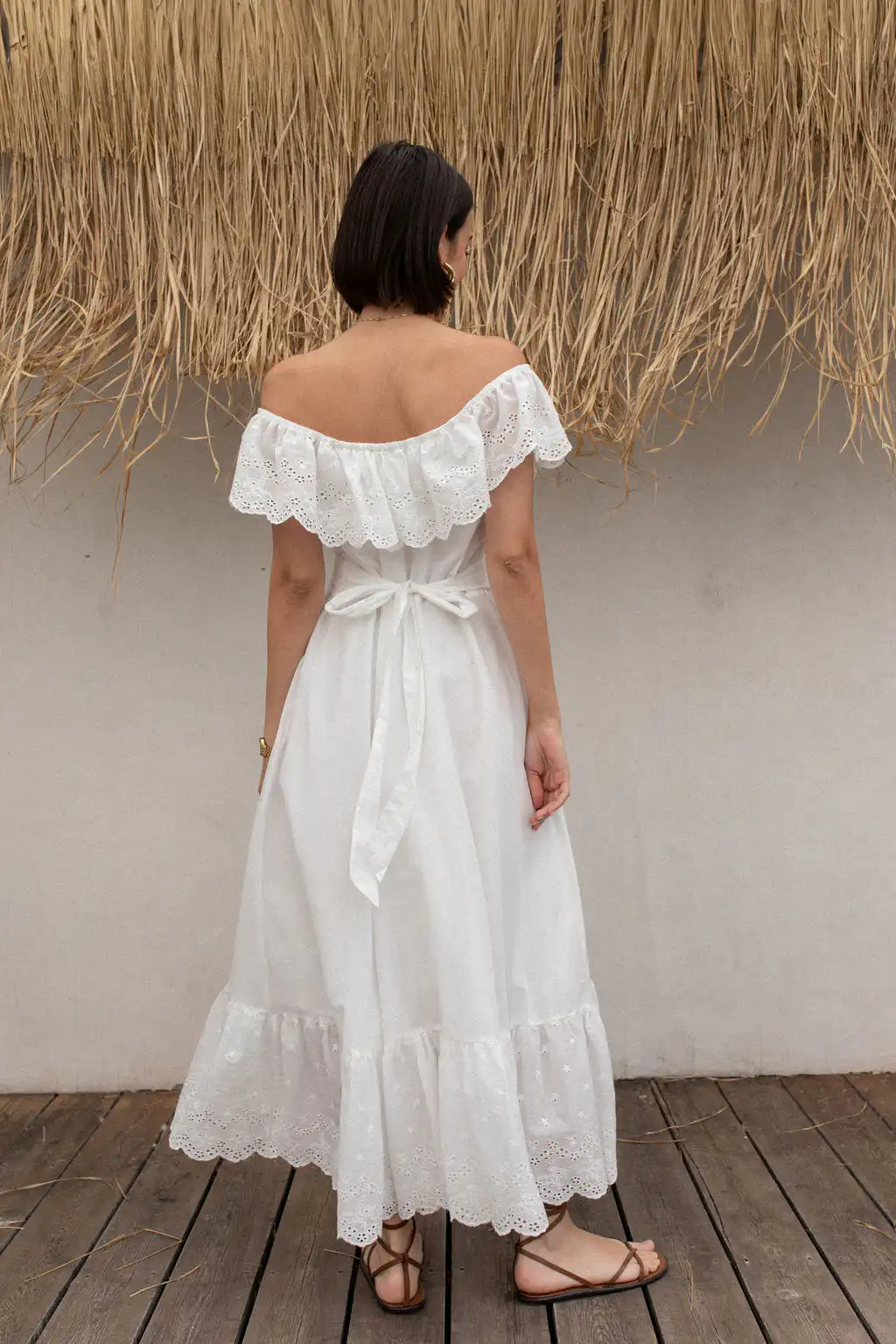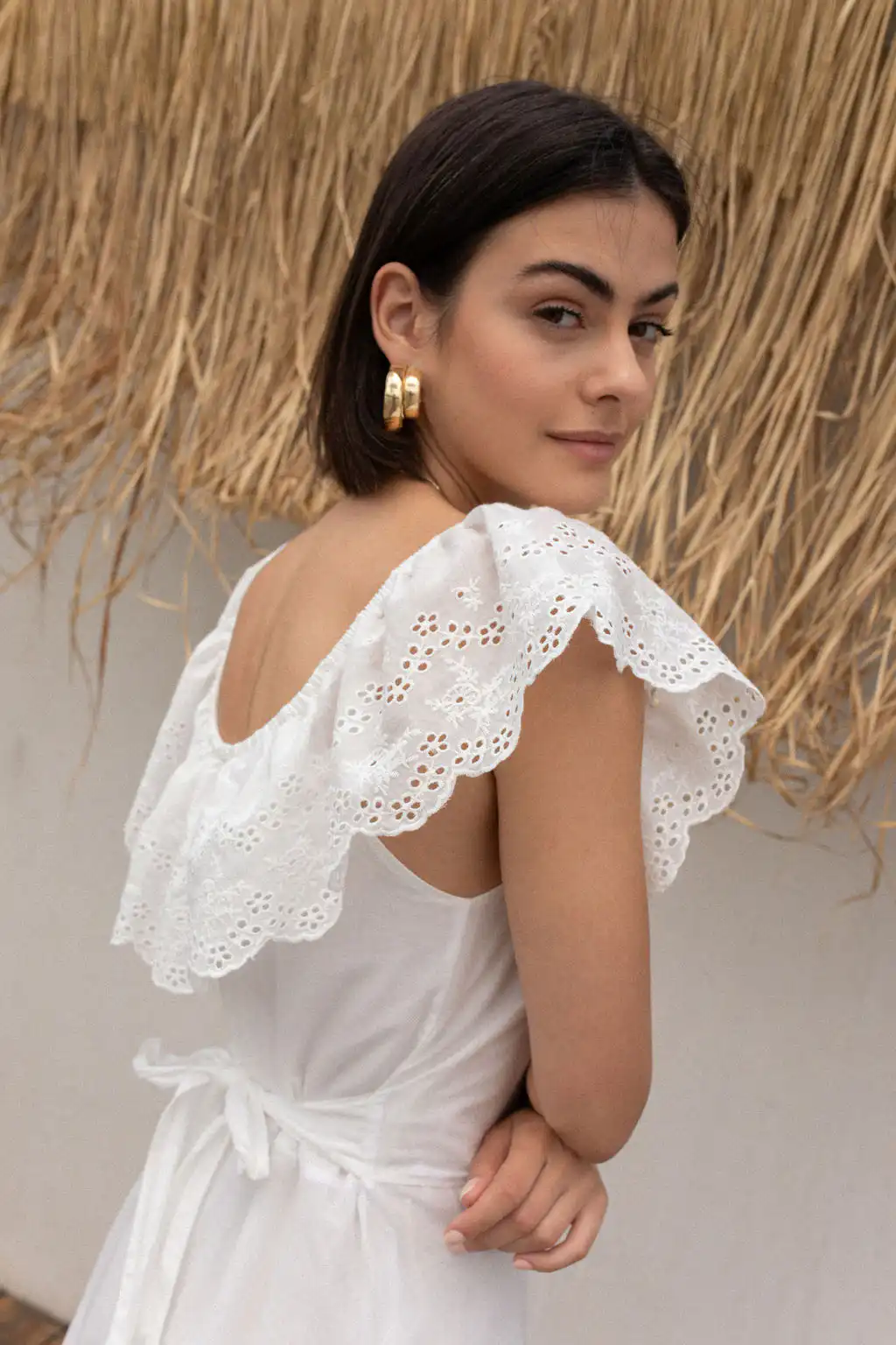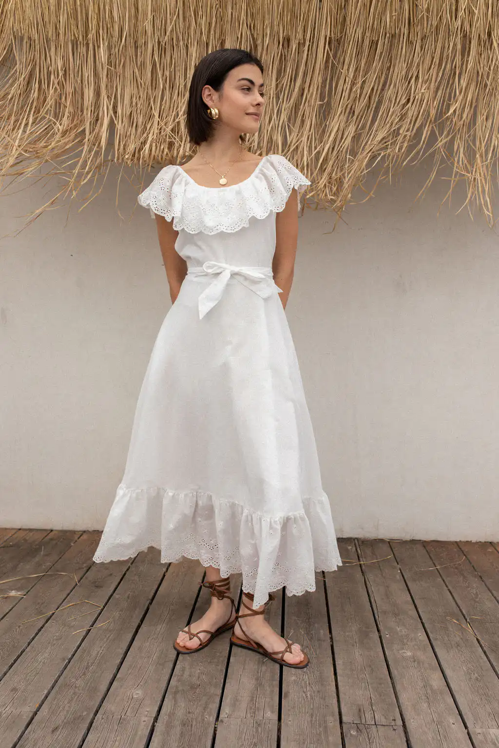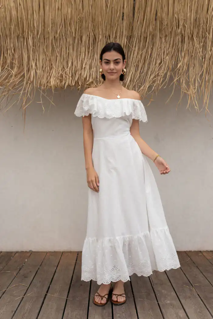 Haljina Bianca odiše romantičnom elegancijom i prirodnom lepršavošću. Napravljena od najfinijeg pamuka sa prelepim vezom, donosi osećaj lakoće i autentičnosti u svakom koraku. Dizajn omogućava da se nosi sa spuštenim ili podignutim ramenima – kako god ti tog dana više prija.