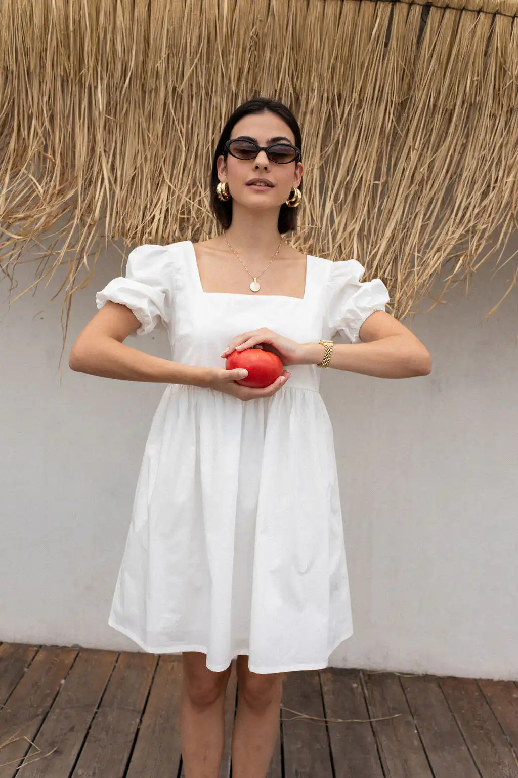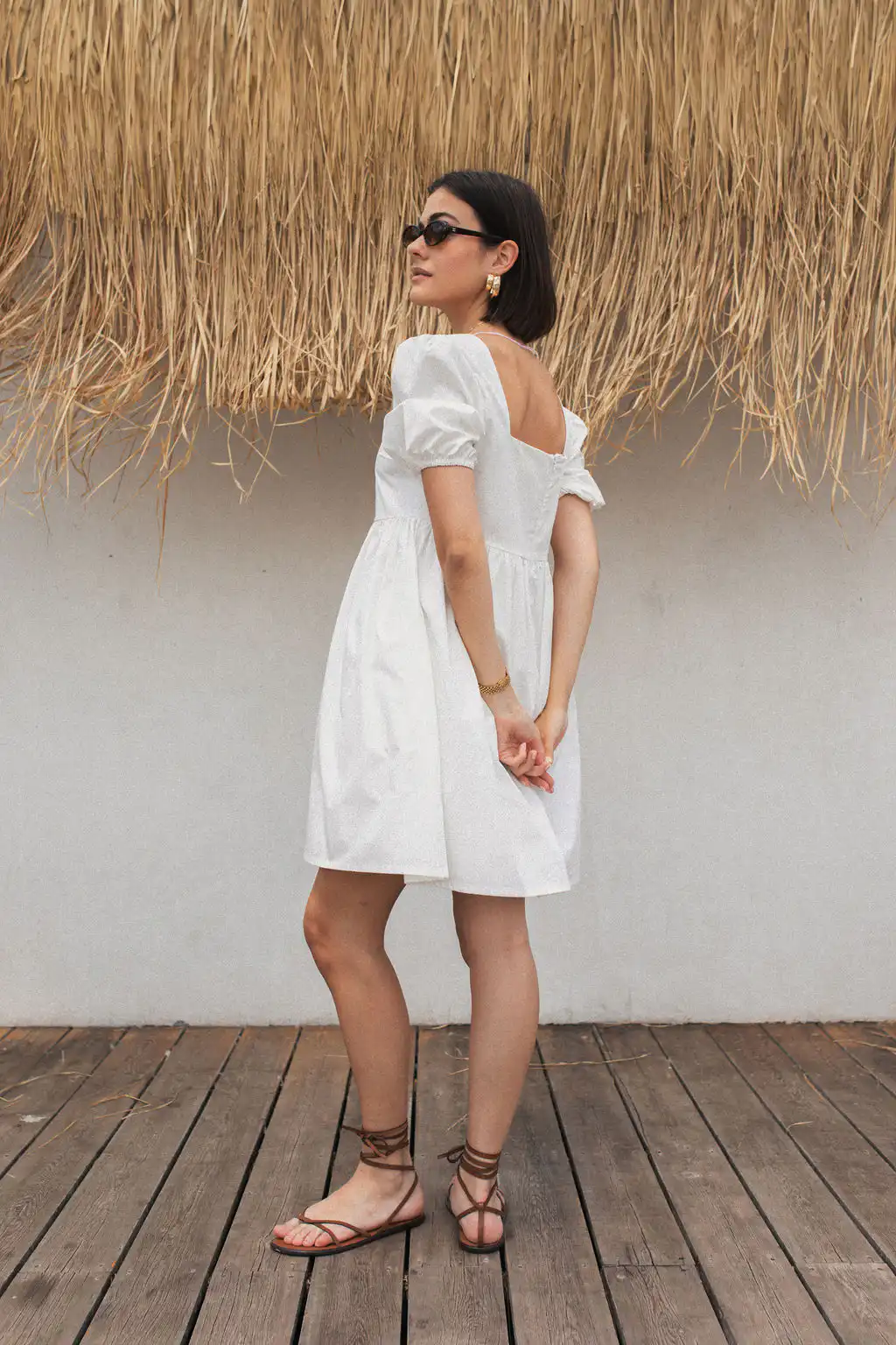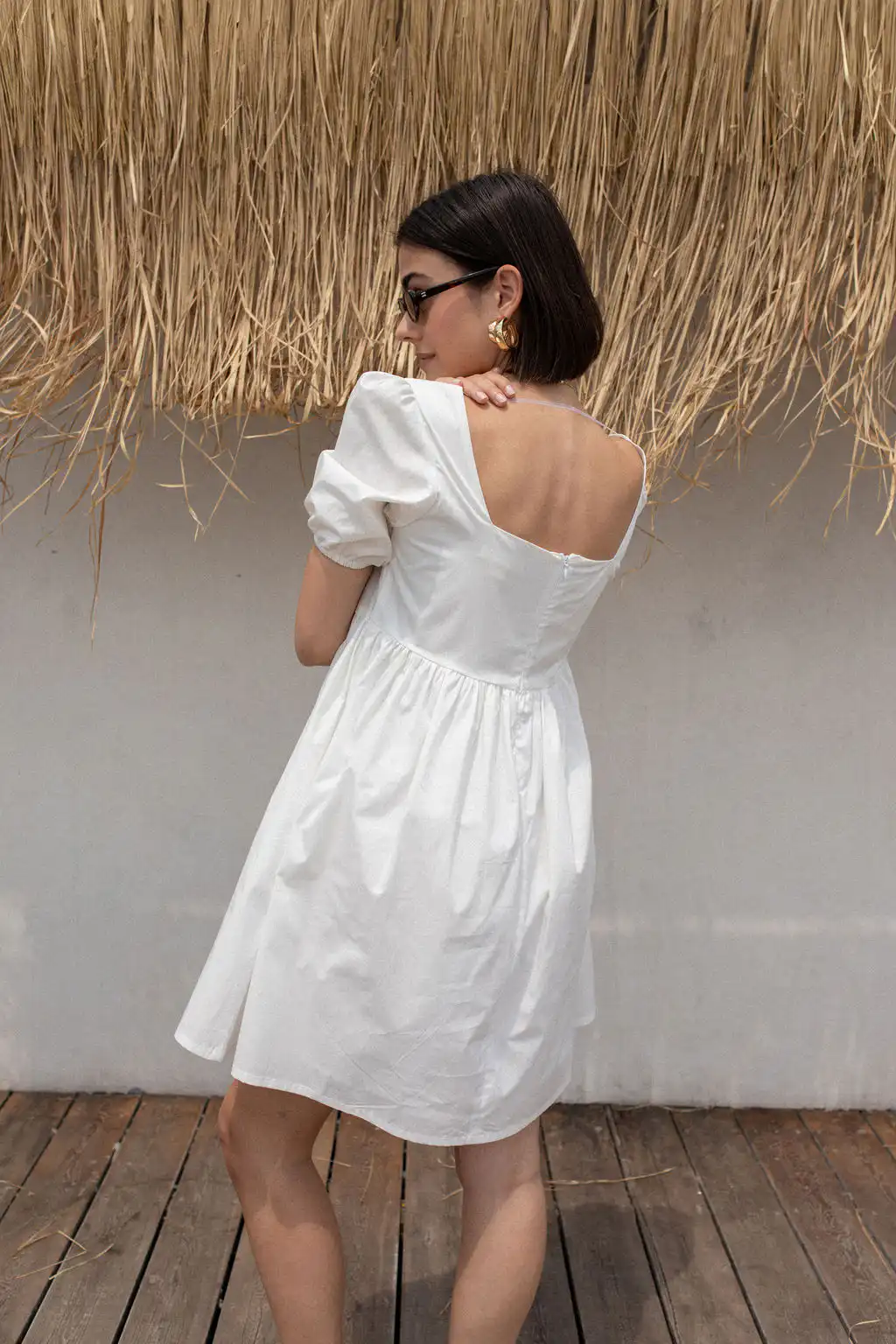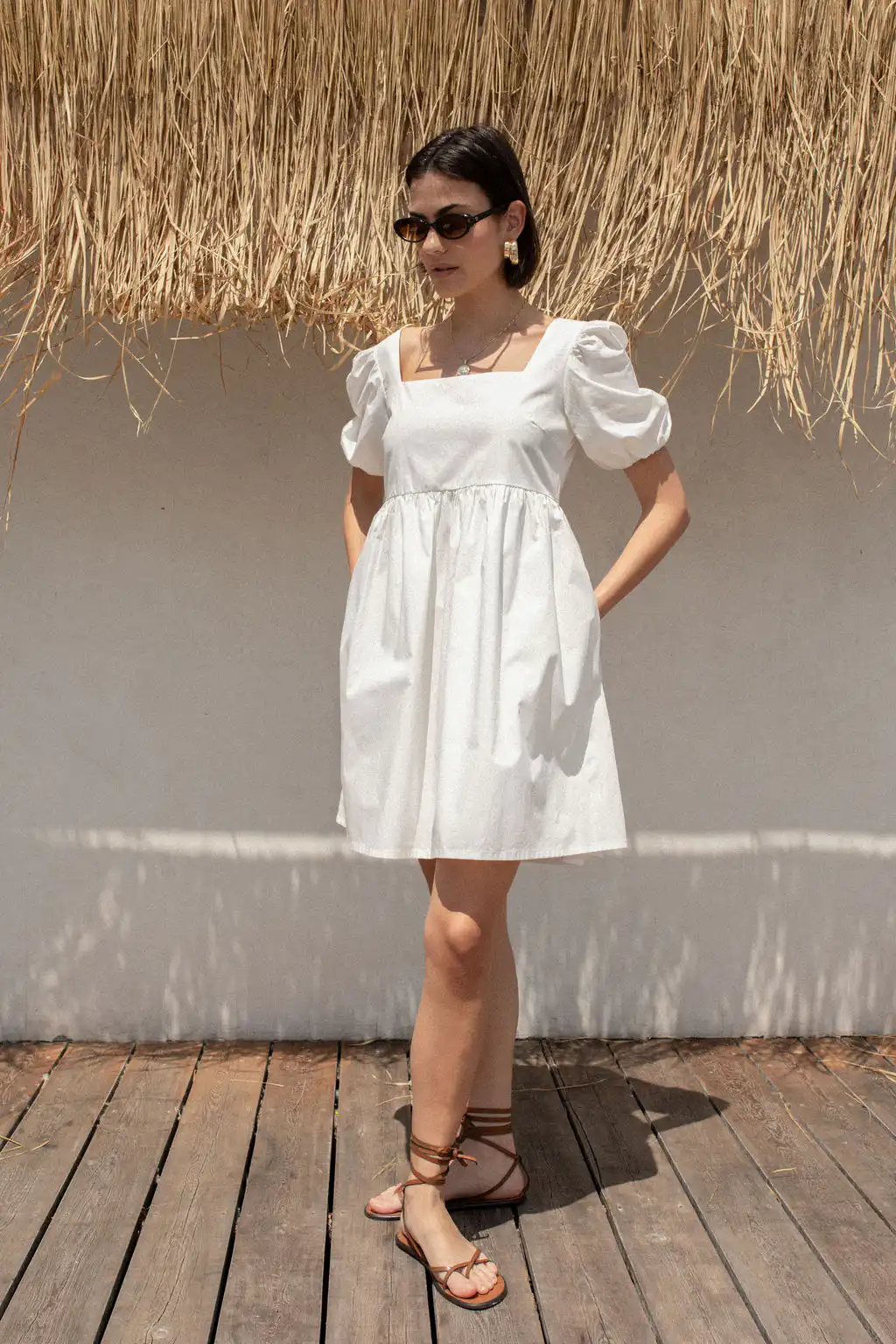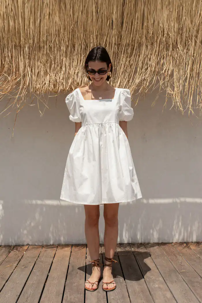 Romantična, kratka, bela haljina Bubble, sa kvadratnim izrezom i puf rukavima donosi dozu ženstvenosti i retro šarma. Izrađena od 100% pamuka, lagana je i prozračna, idealna za letnje dane, gradske šetnje ili opuštene večeri. Sa skrivenim rajsferšlusom i praktičnim džepovima, kombinuje udobnost i eleganciju u jednom.
