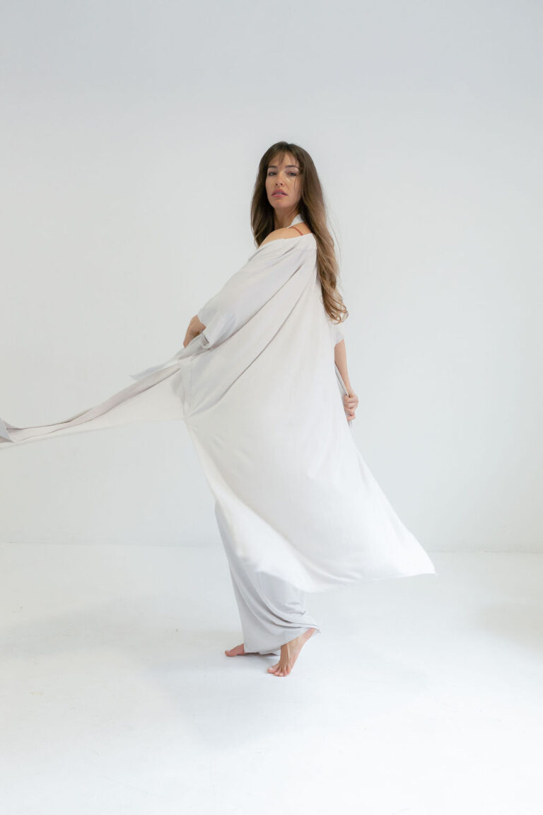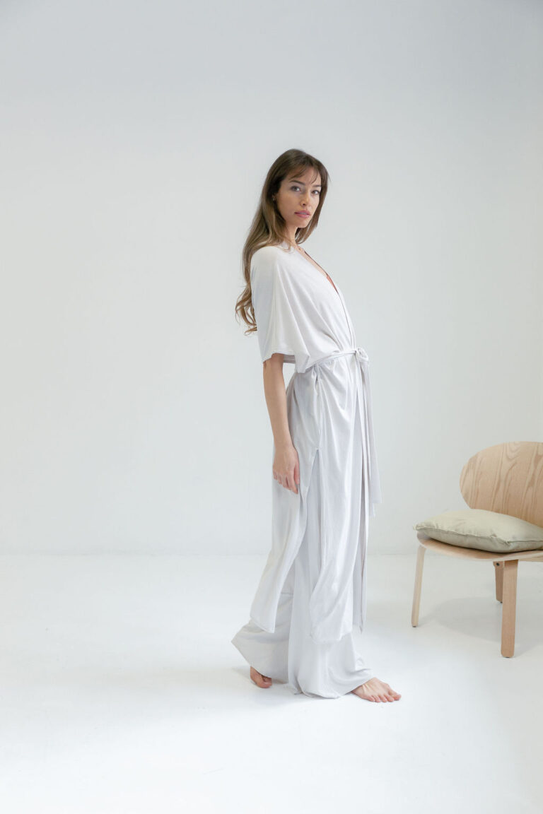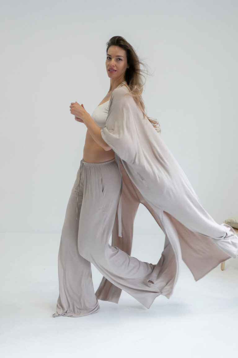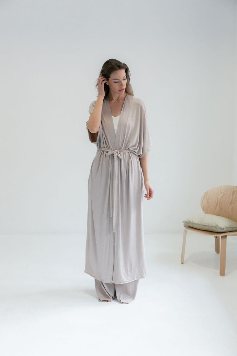 Kimono je praktičan odevni komad koji zadovoljava brojne modne potrebe dama sa stilom. Naš kimono izrađen je od 100% viskoze, izuzetno je prijatan za nošenje i lepršav baš kao da nemate ništa od odeće na sebi. Namenjen je za plažu, odlazak na kafu, brze izlaske do radnje ili najudobniji boravak u kući, baš za sve situacije. Dostupan je u crnoj, bež i maslinastoj boji. Lagani slojevi prilagođavaju se svim figurama i stilovima i čine praktičan izbor za svaki dan i za svaku damu. Izrađeni su u duhu održive mode i svesnog izbora i namenjeni za dame koje biraju sa stilom, ali i sa svrhom.