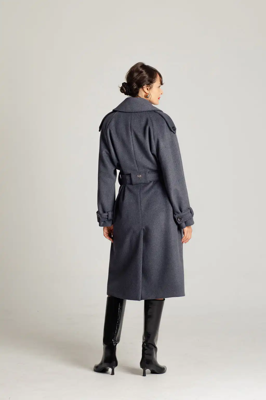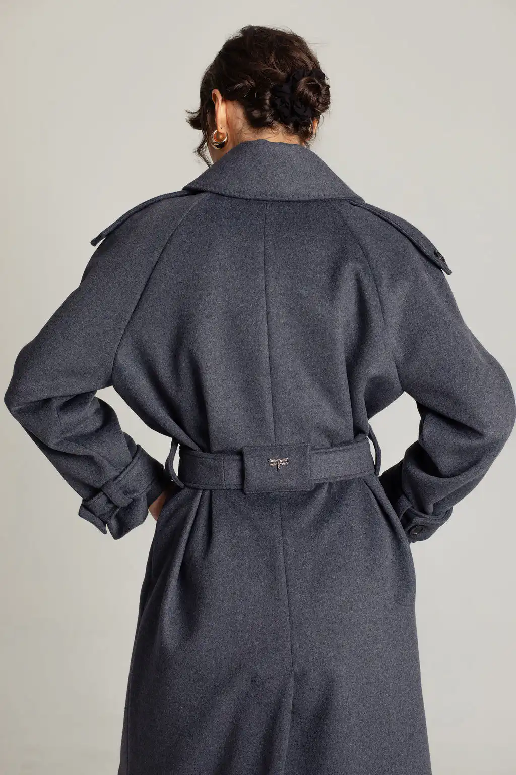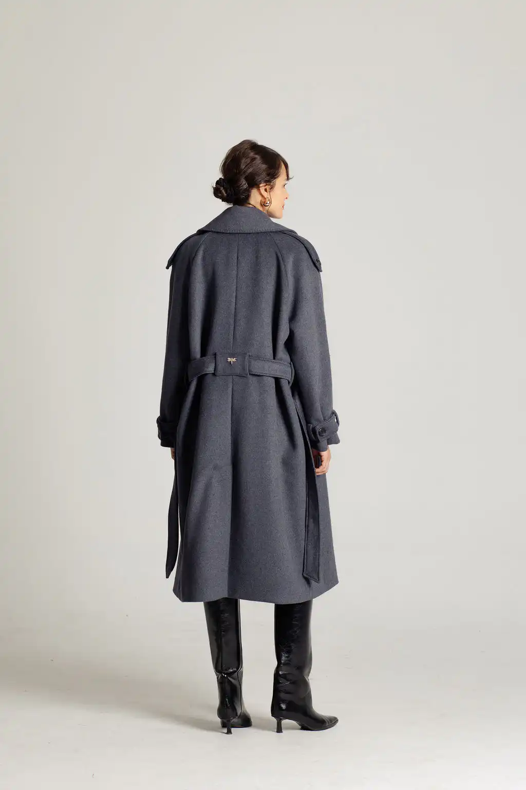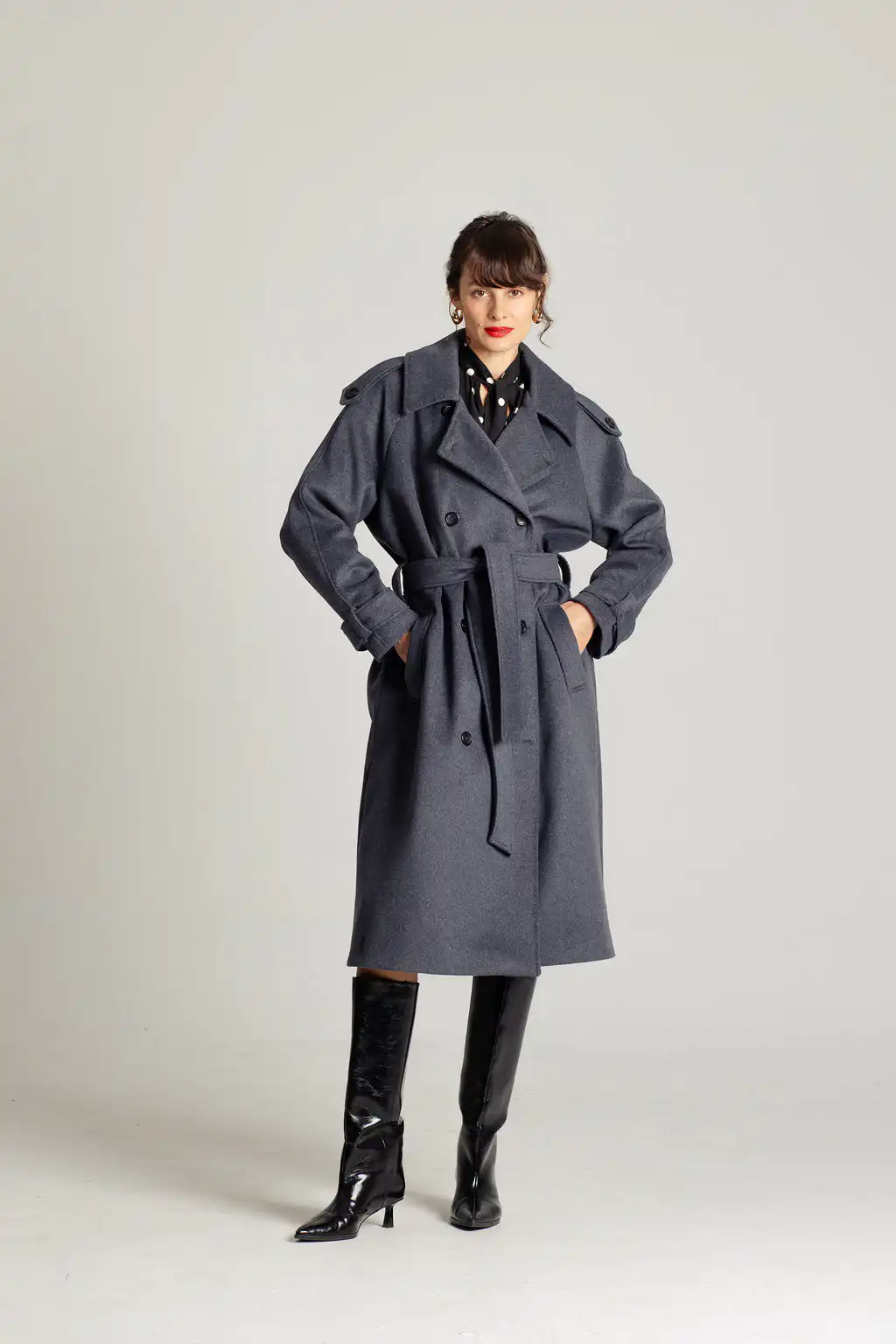 Tamno sivi vuneni kaput sa pojasom u struku i duplim kopčanjem. Bezvremenski dizajn i savršena toplina za hladne dane.