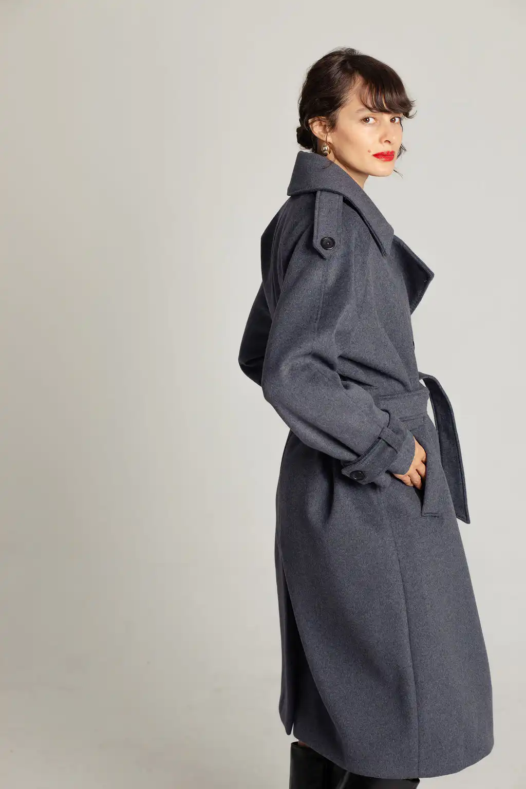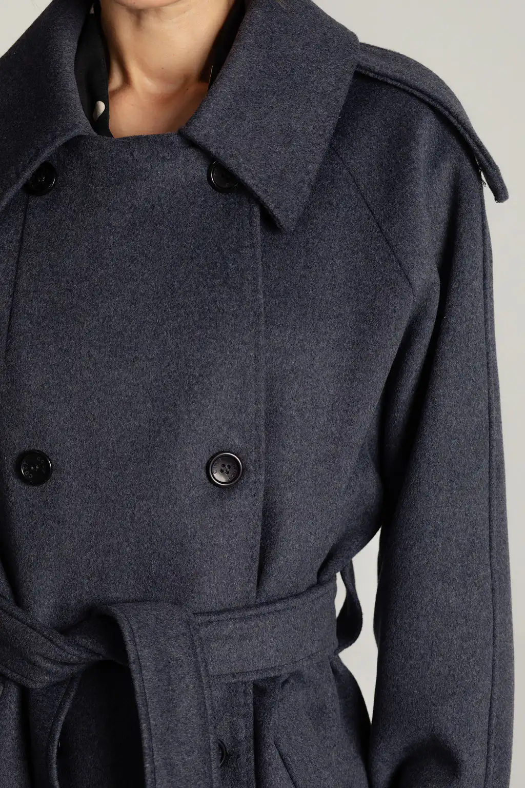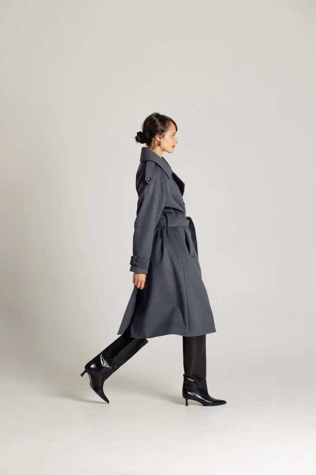 Tamno sivi vuneni kaput sa pojasom u struku i duplim kopčanjem. Bezvremenski dizajn i savršena toplina za hladne dane.