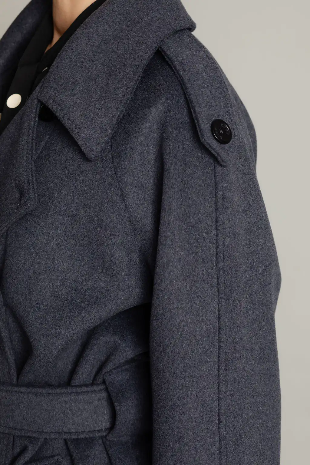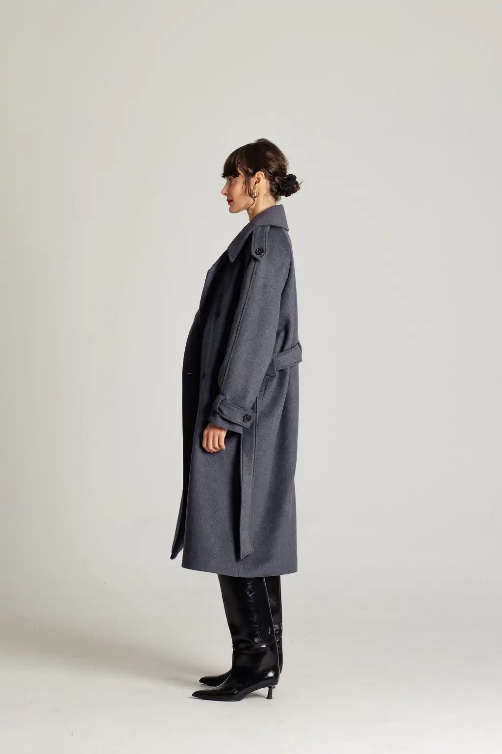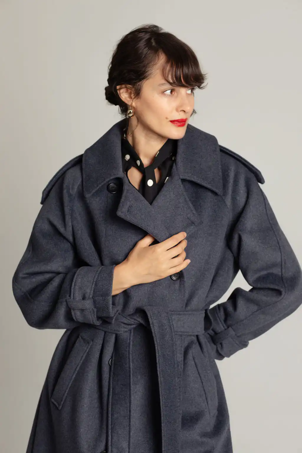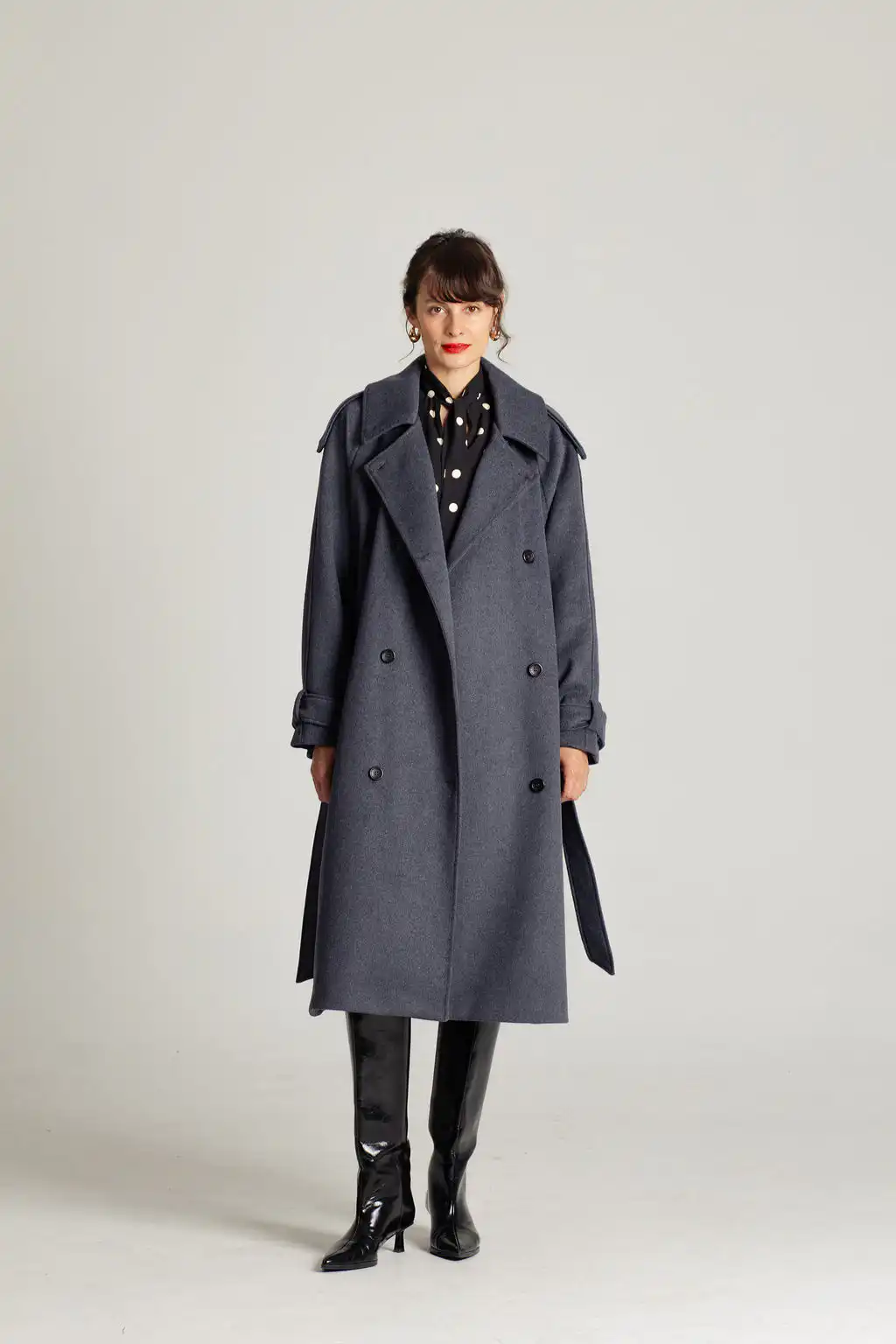 Tamno sivi vuneni kaput sa pojasom u struku i duplim kopčanjem. Bezvremenski dizajn i savršena toplina za hladne dane.