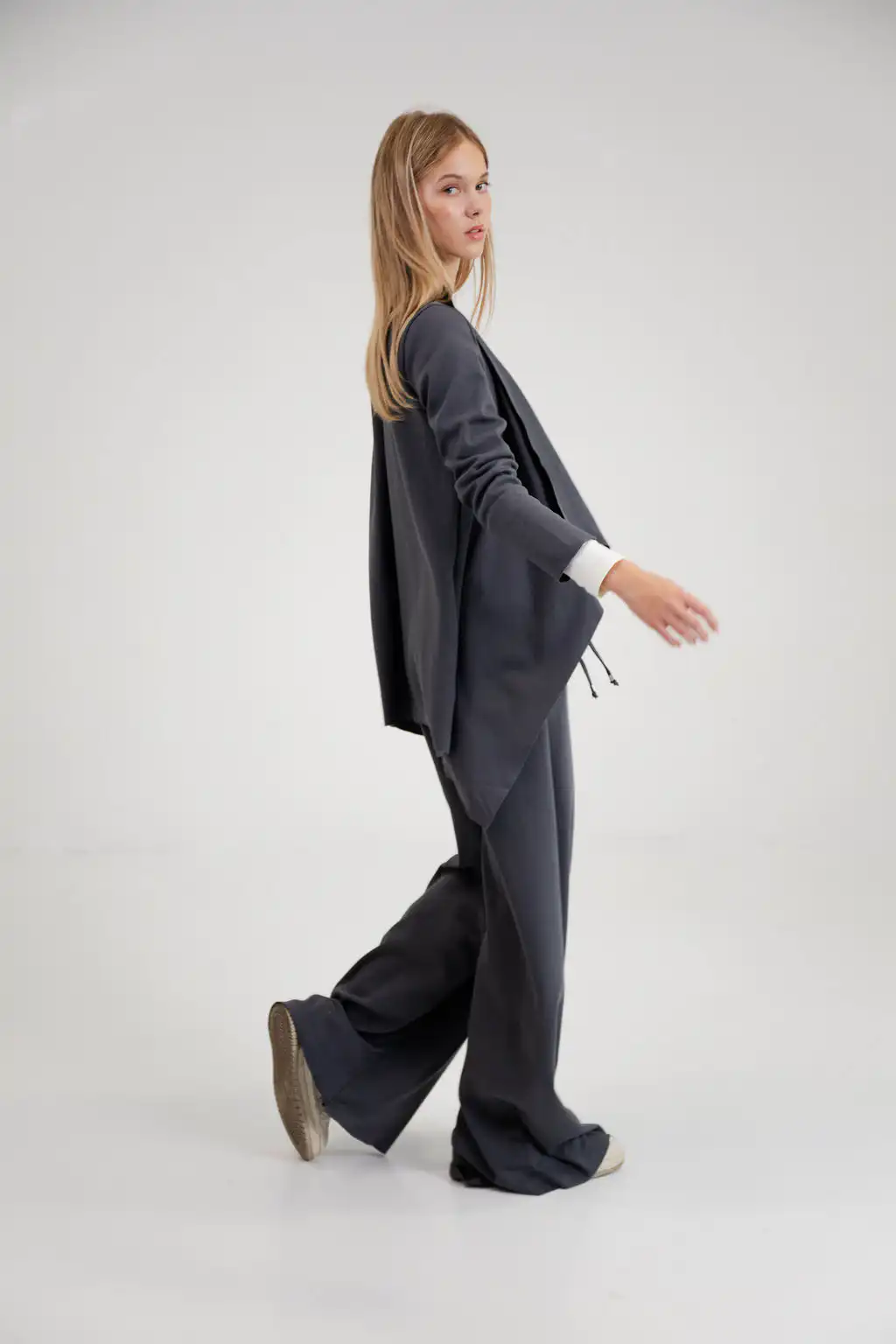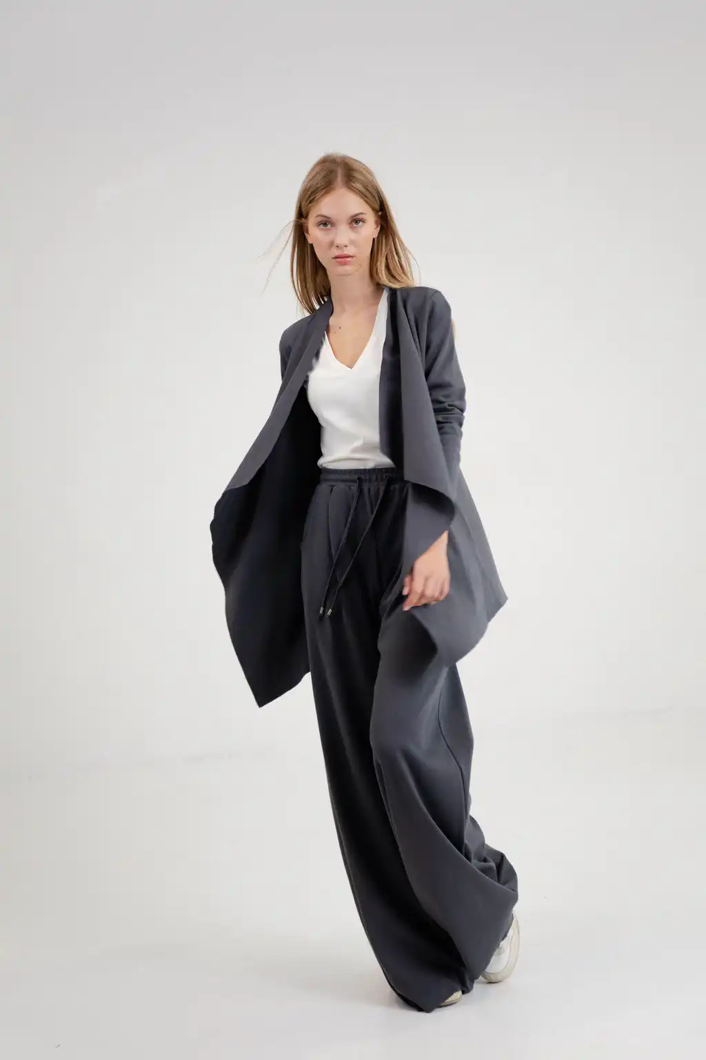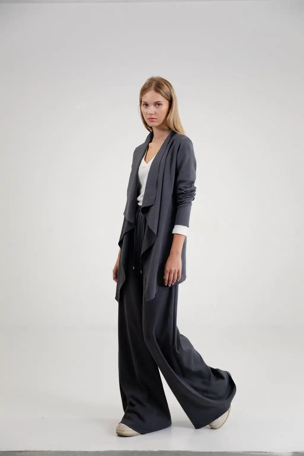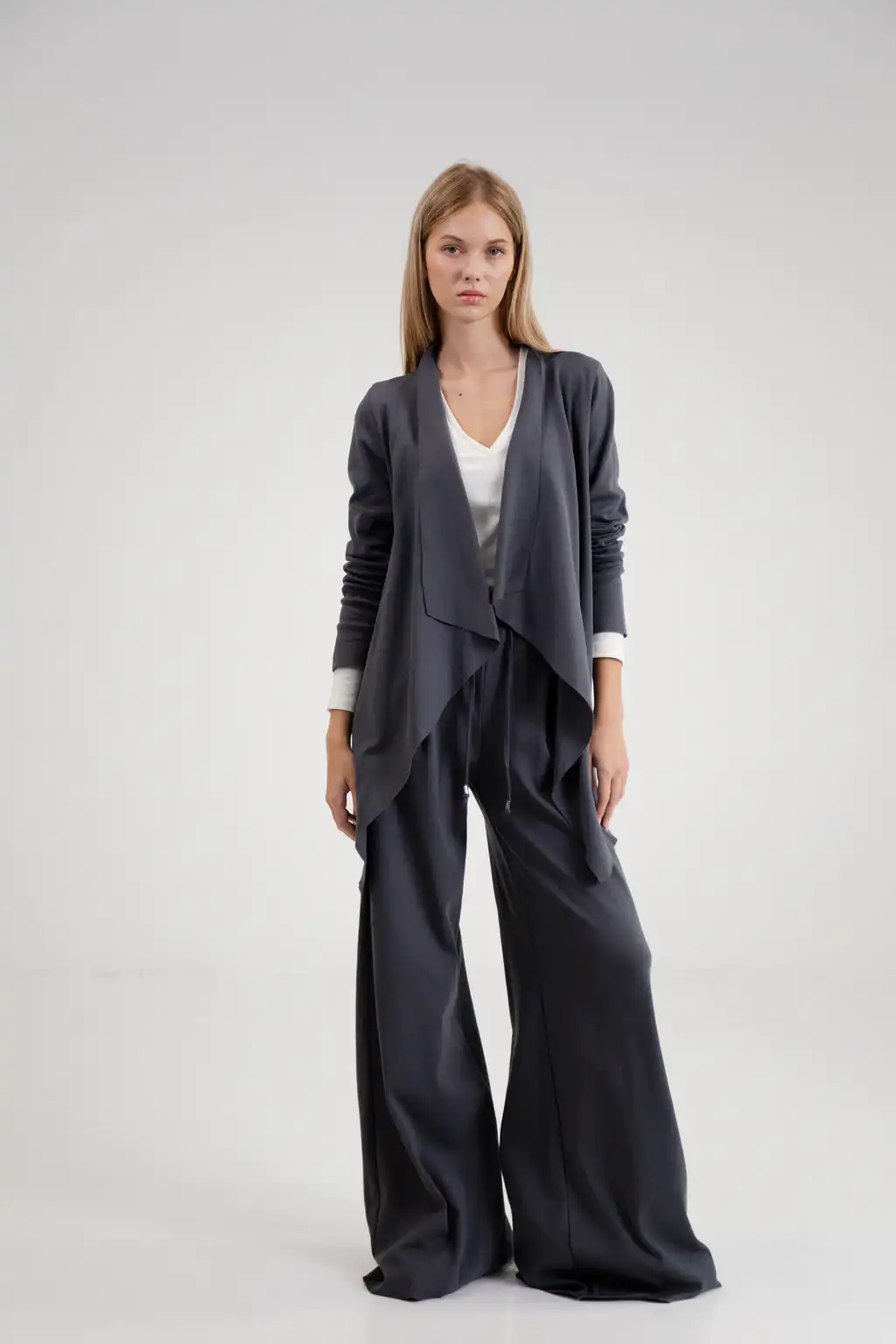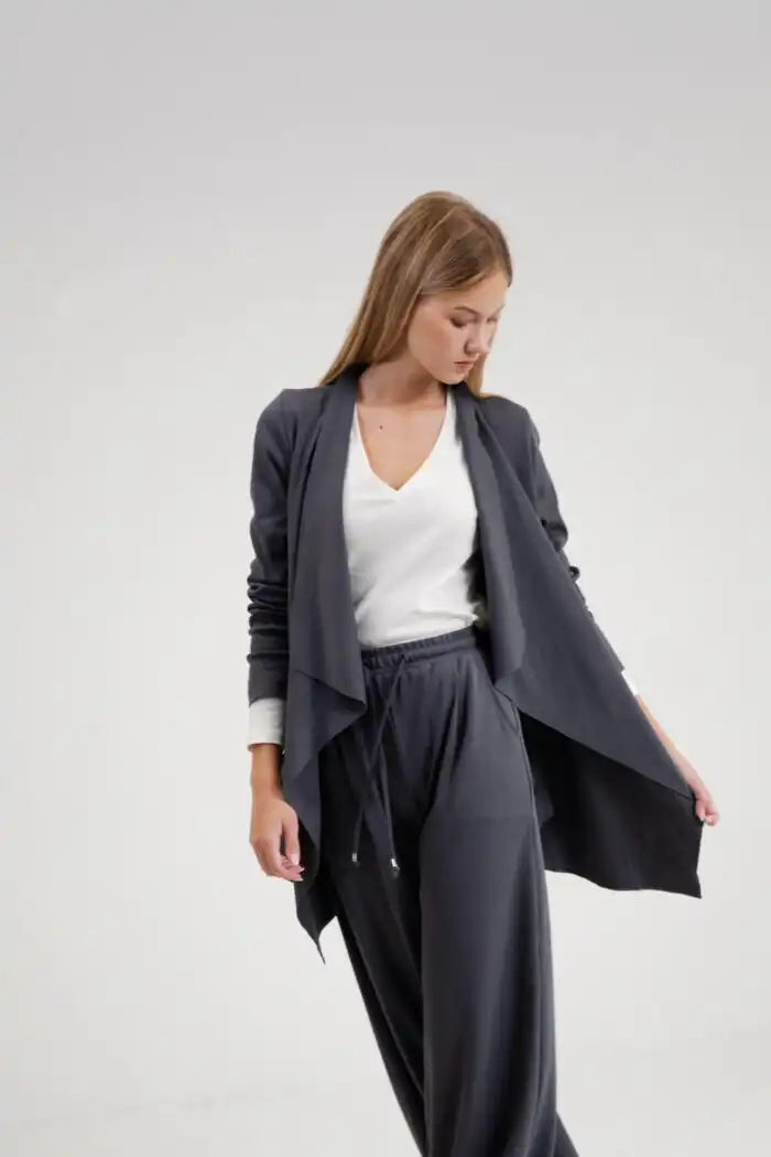Kardigan Kris je ležerna i elegantna zamena za klasičan sako. Izrađen od 100% pamuka, sa asimetričnim krojem i prednjim naborima, donosi udobnost i sofisticiranost tokom cele godine.