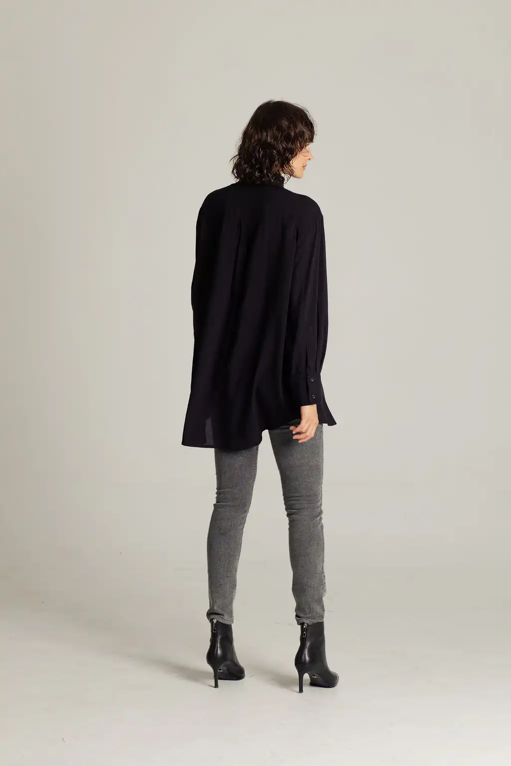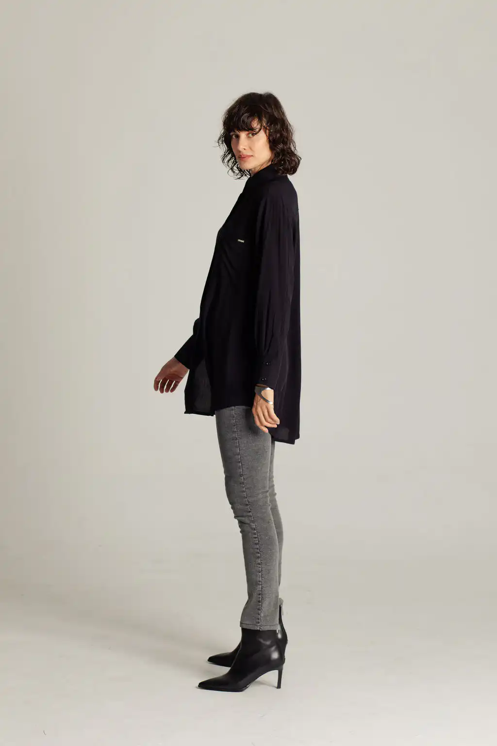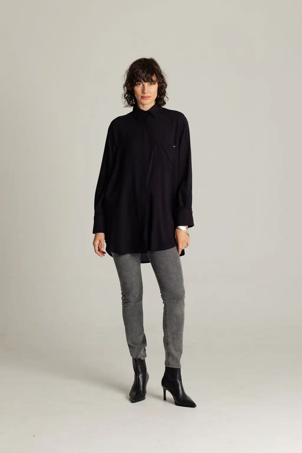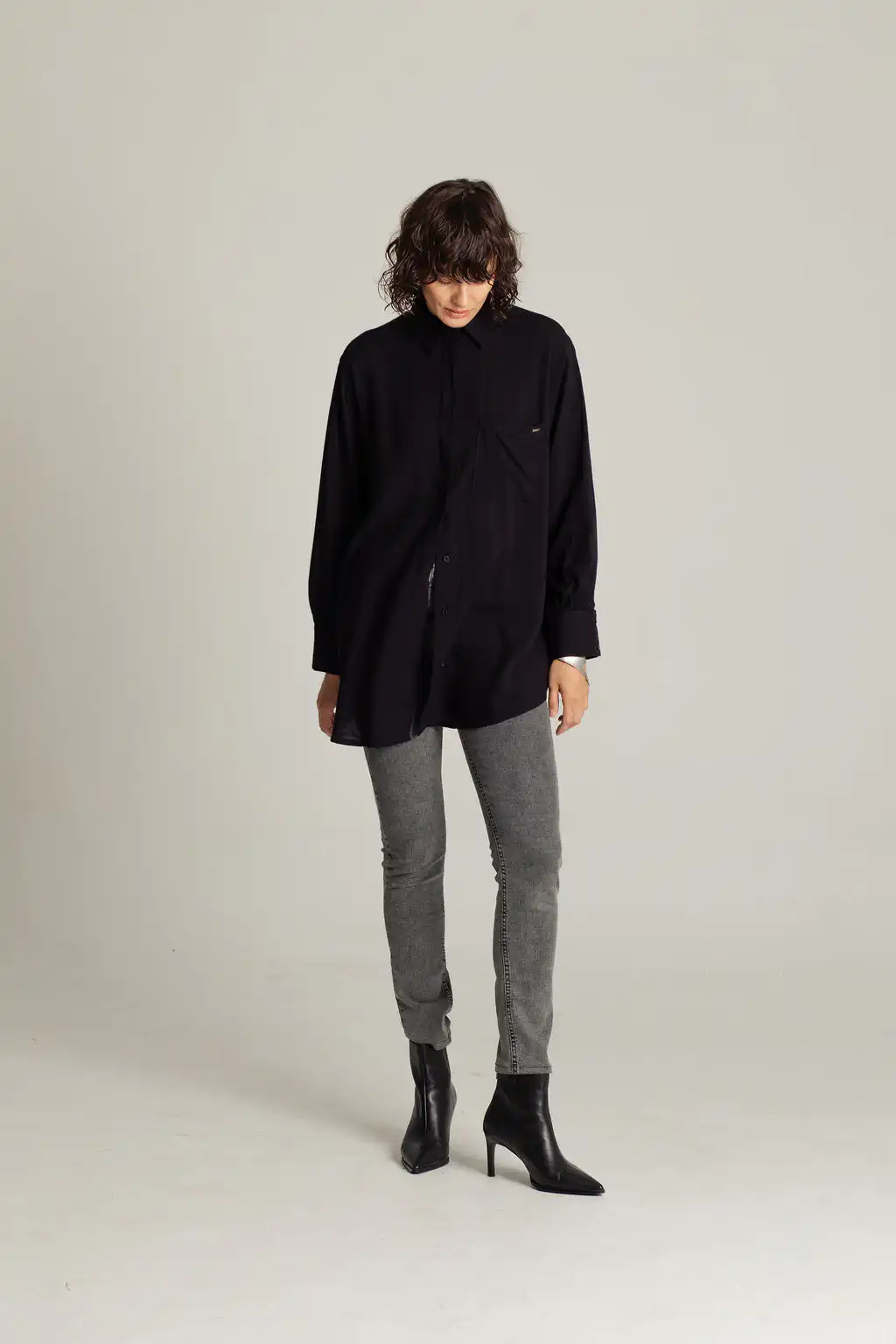 Oversized i dugačka košulja sa špicastom kragnom, kopčanjem skroz do gore, velikim džepom na prednjem delu i lajsnom duž linije dugmića koja joj daje elegantniji i sveden izgled. Ramena su spuštena, i rukavi su dugački.