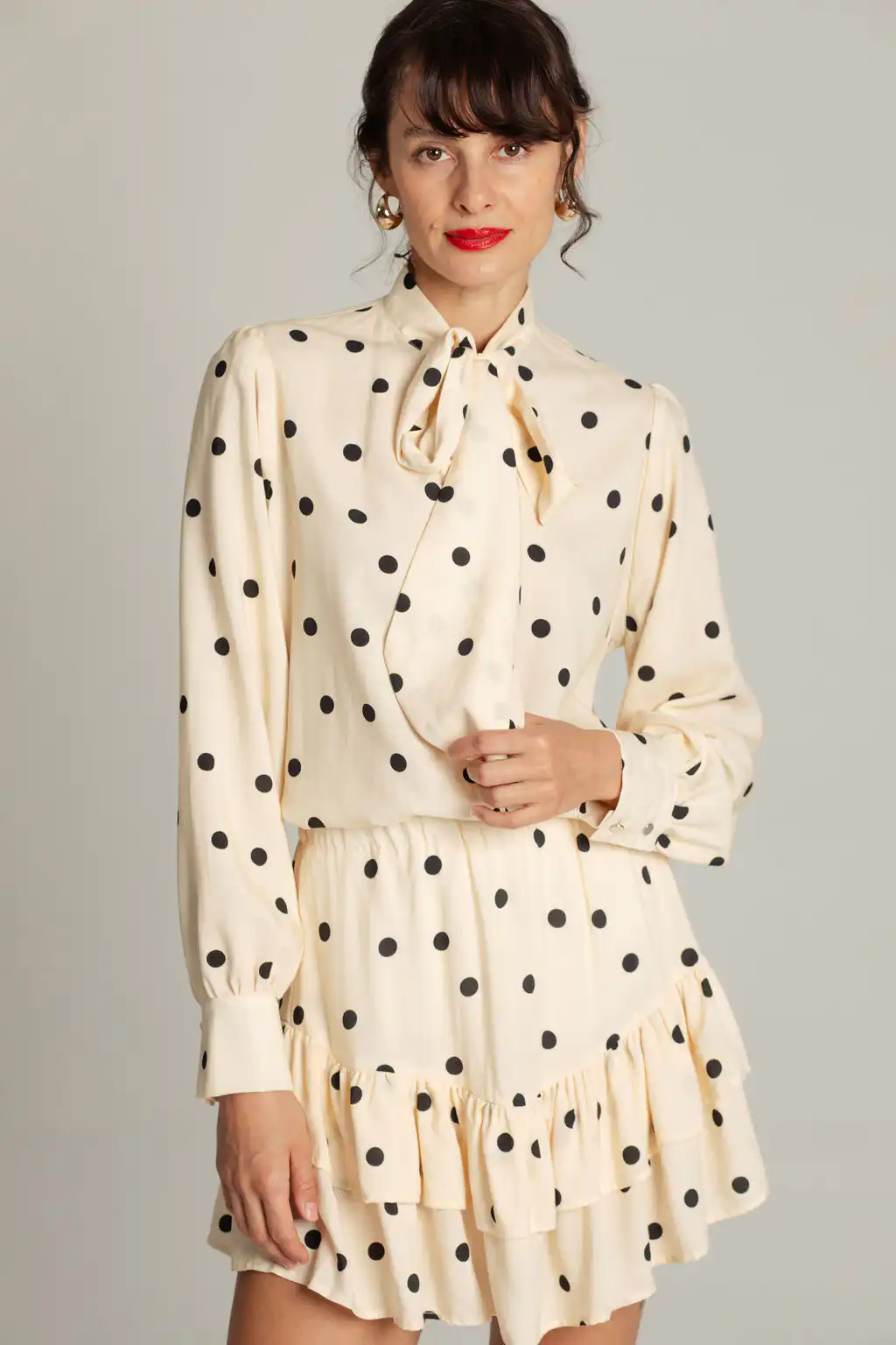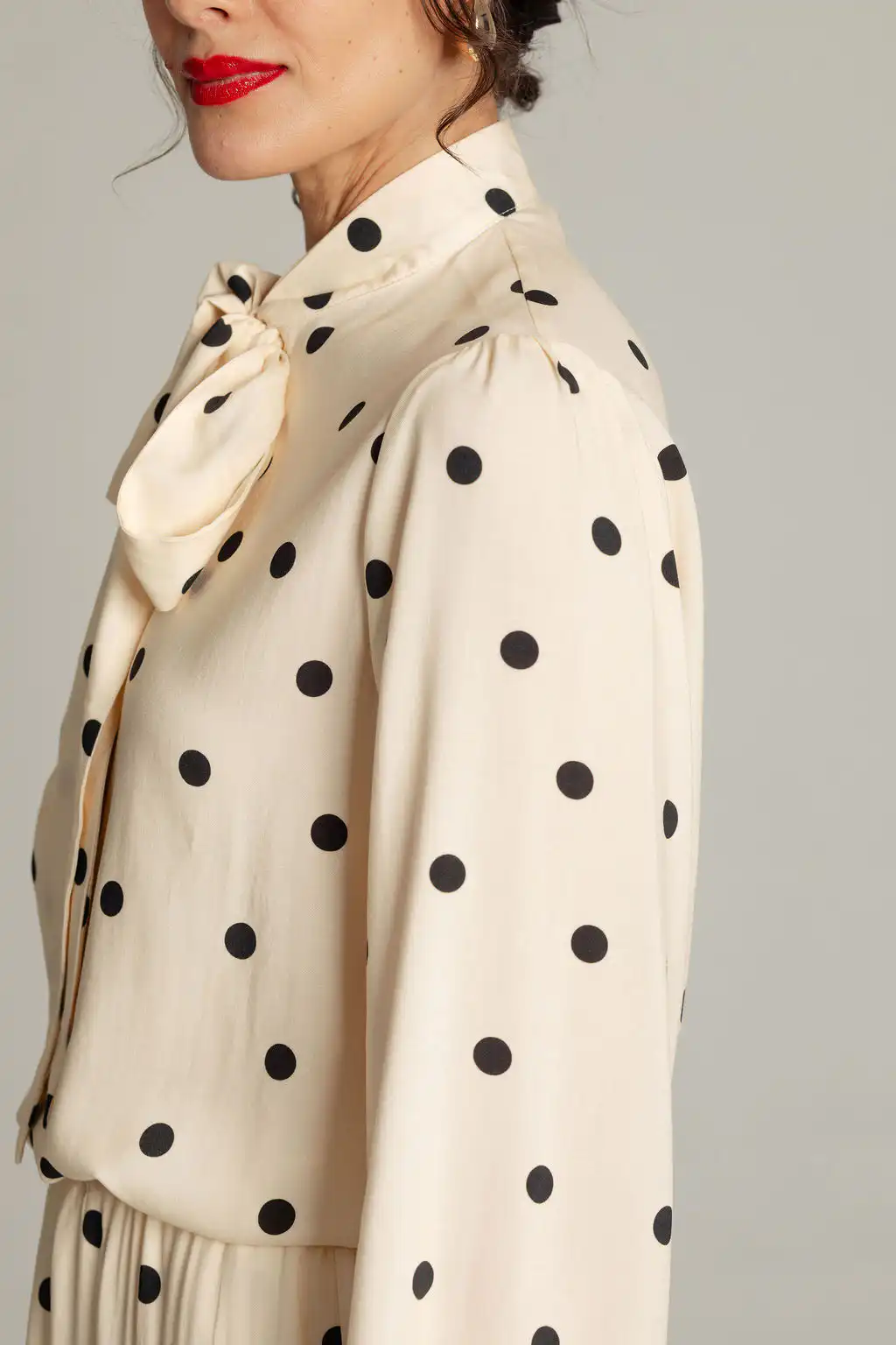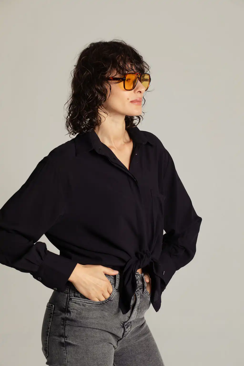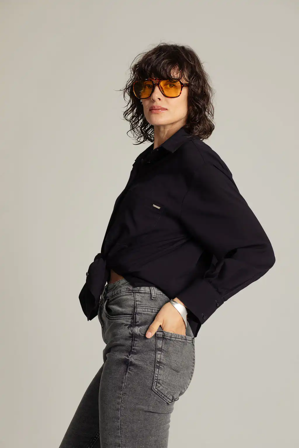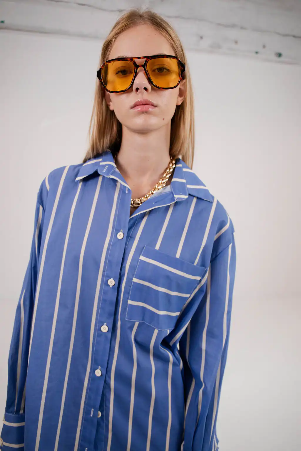 Oversized i dugačka košulja sa špicastom kragnom, kopčanjem skroz do gore, velikim džepom na prednjem delu i lajsnom duž linije dugmića koja joj daje elegantniji i sveden izgled. Ramena su spuštena, i rukavi su dugački.