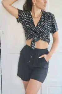 Laganini šorcevi su pravi must-have ovog leta. Dostupni su u raznim bojama, a prvu kombinaciju za danas baziramo na crnom šorcu, dok se na sajtu mogu pronaći i ostale boje. Napravljeni su od 100% viskoze, što ih čini izuzetno udobnim i prozračnim, savršenim za vrele letnje dane.