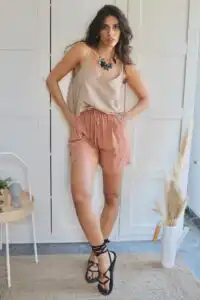 Druga kombinacija koristi isti šorc u boji clay, ali sa majicom u boji sand. Svetle boje doprinose letnjem raspoloženju i čine da se osećate osveženo tokom celog dana. Uz ovu kombinaciju, cipele u neutralnoj boji i minimalistički nakit doprinose sofisticiranom izgledu. Ova kombinacija je savršena za sve prilike – od jutarnje kafe do večernjih izlazaka, a prirodni materijali osiguravaju udobnost i održivost.