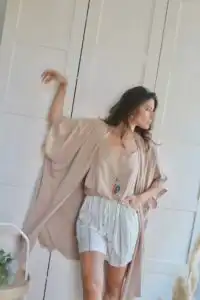 Pogledajte kombinaciju sa Clay šorcem i majicom u istoj boji, koja sama po sebi deluje elegantno i svedeno. Dodavanjem kimona sa floralnim printom, ceo outfit dobija potpuno novu dimenziju – floralni dezen unosi dozu razigranosti i svežine, stvarajući savršeni spoj jednostavnosti i sofisticiranosti.