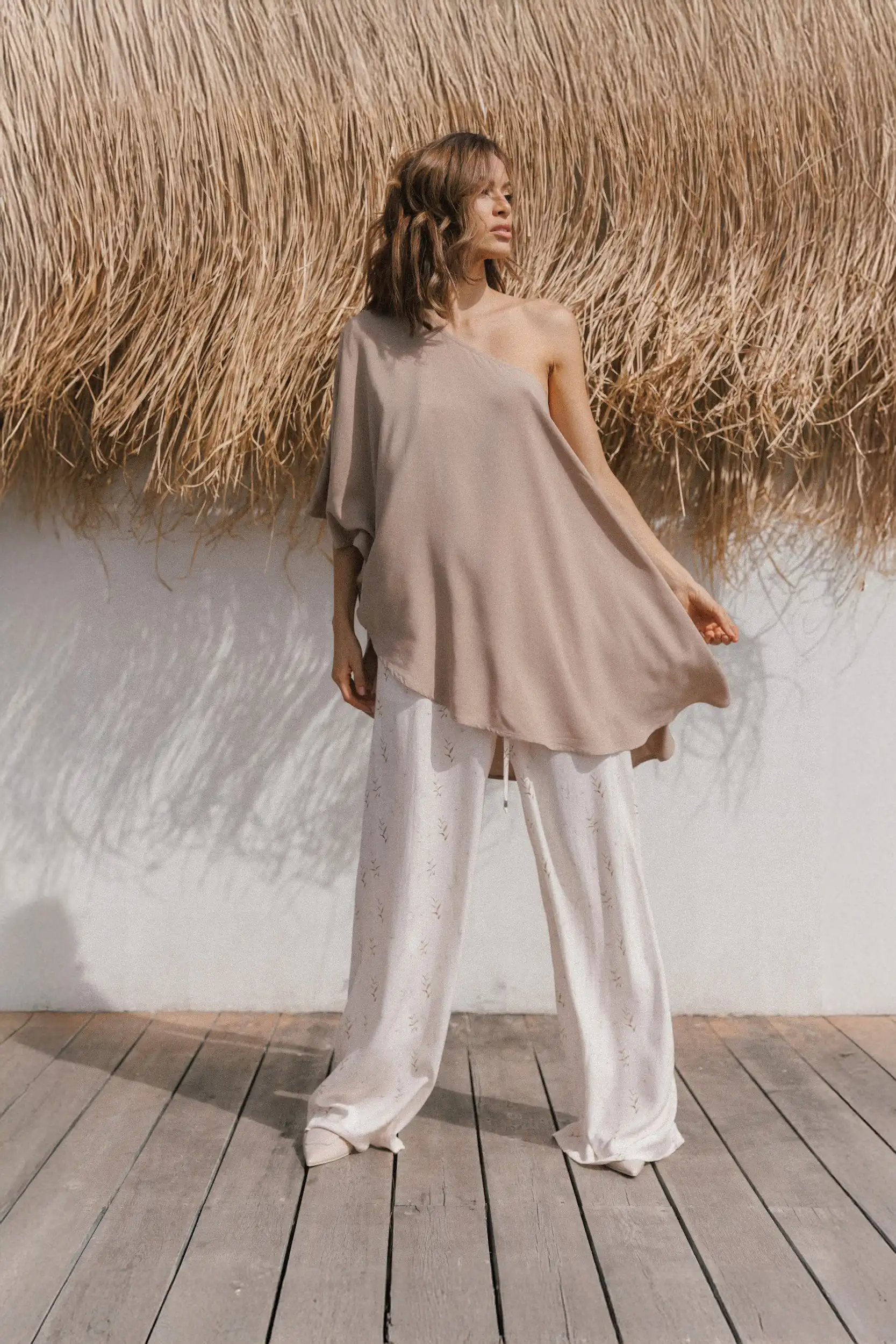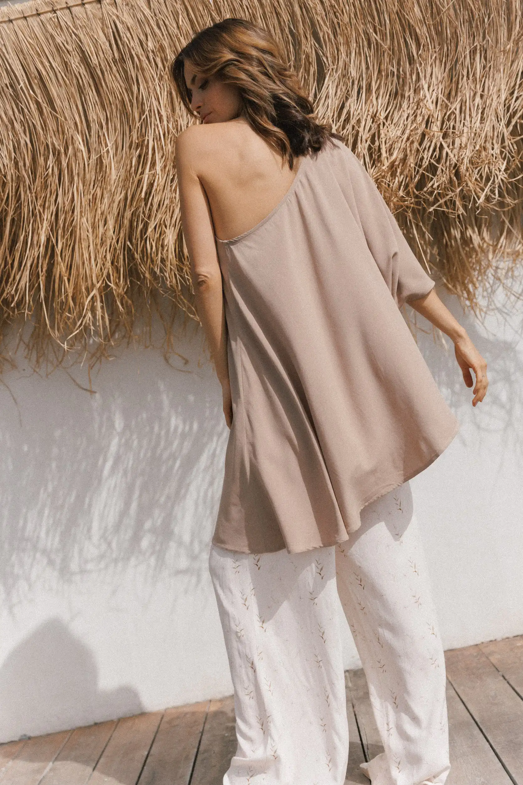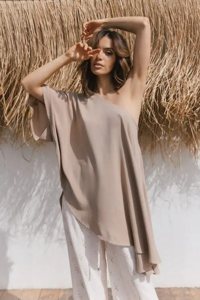 Majica Aura na jedno rame, široka je, lepršava i izrađena od lagane viskoze. Asimetričnog je kroja, idealna za tople dane. Stvorena za žene koje vole jednostavnost s karakterom, koje se najbolje osećaju kad im je udobno — i kad to udobno izgleda sjajno.