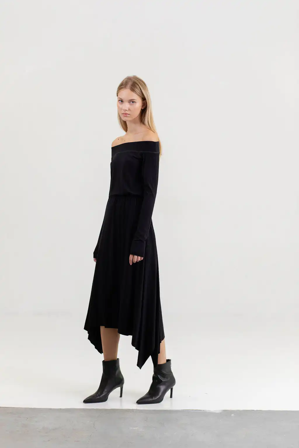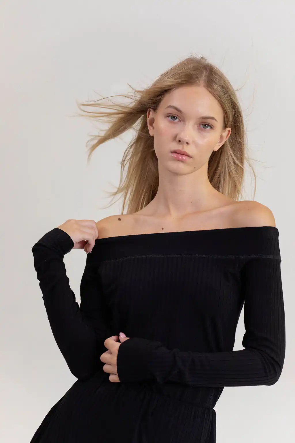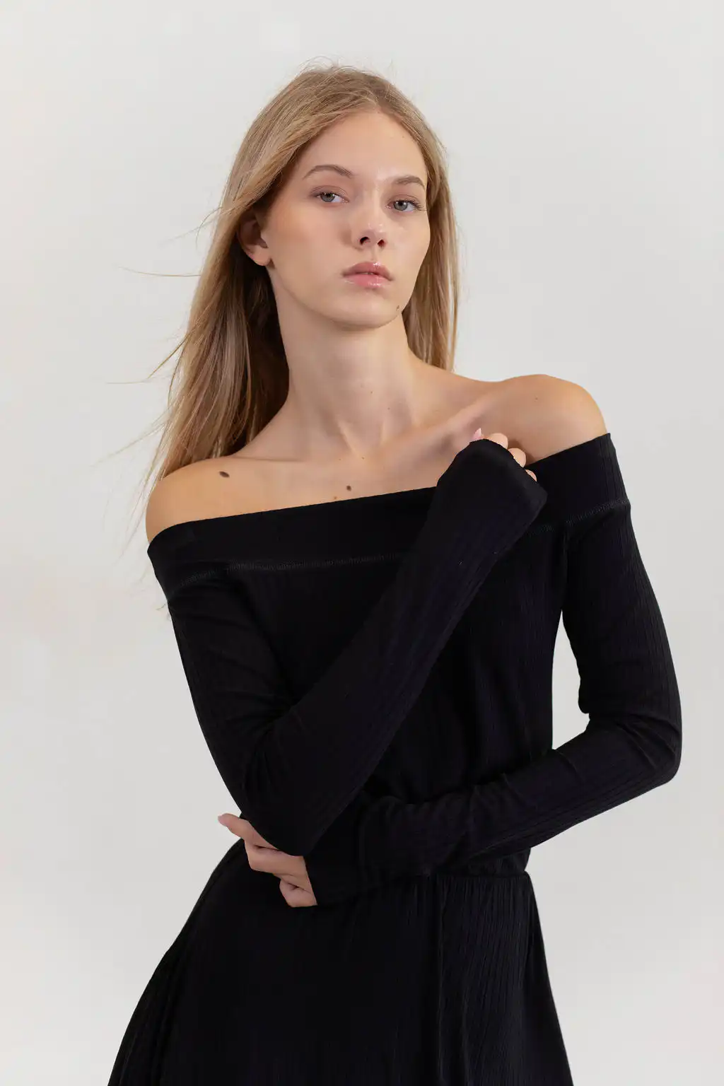 Majica Eloise off shoulder model od pletene viskoze, sa dugim rukavima i ženstvenim krojem koji spaja udobnost i sofisticiranost.