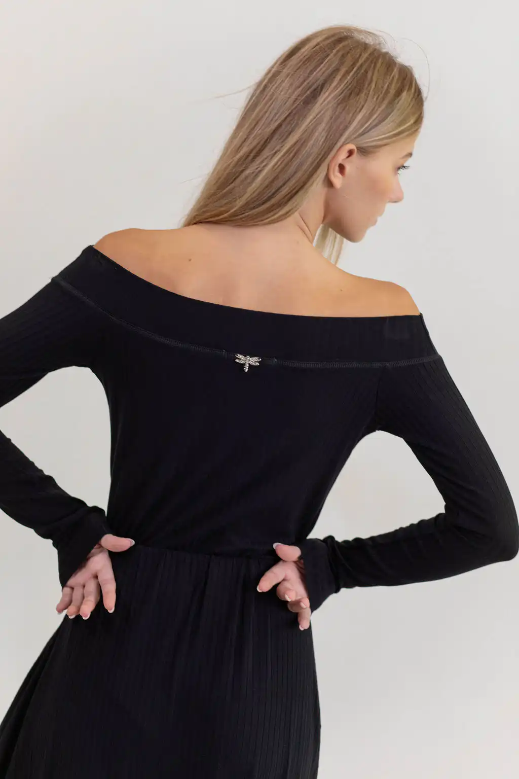 Majica Eloise izrađena je od 100% pletene viskoze koja pruža mekoću, udobnost i laganu elastičnost. Dizajnirana u off shoulder kroju, sa dugim rukavima, diskretnom rebrastom teksturom i prepoznatljivim dragonfly ukrasom na leđima, ova majica naglašava ramena i pruža elegantan izgled. Savršen je izbor za večernje izlaske, posebne prilike ili kao statement komad u svakodnevnim kombinacijama. Lako se kombinuje sa suknjom Eloise za kompletan set, i čizmama za urbaniji stil, ili sa pantalonama Derby.