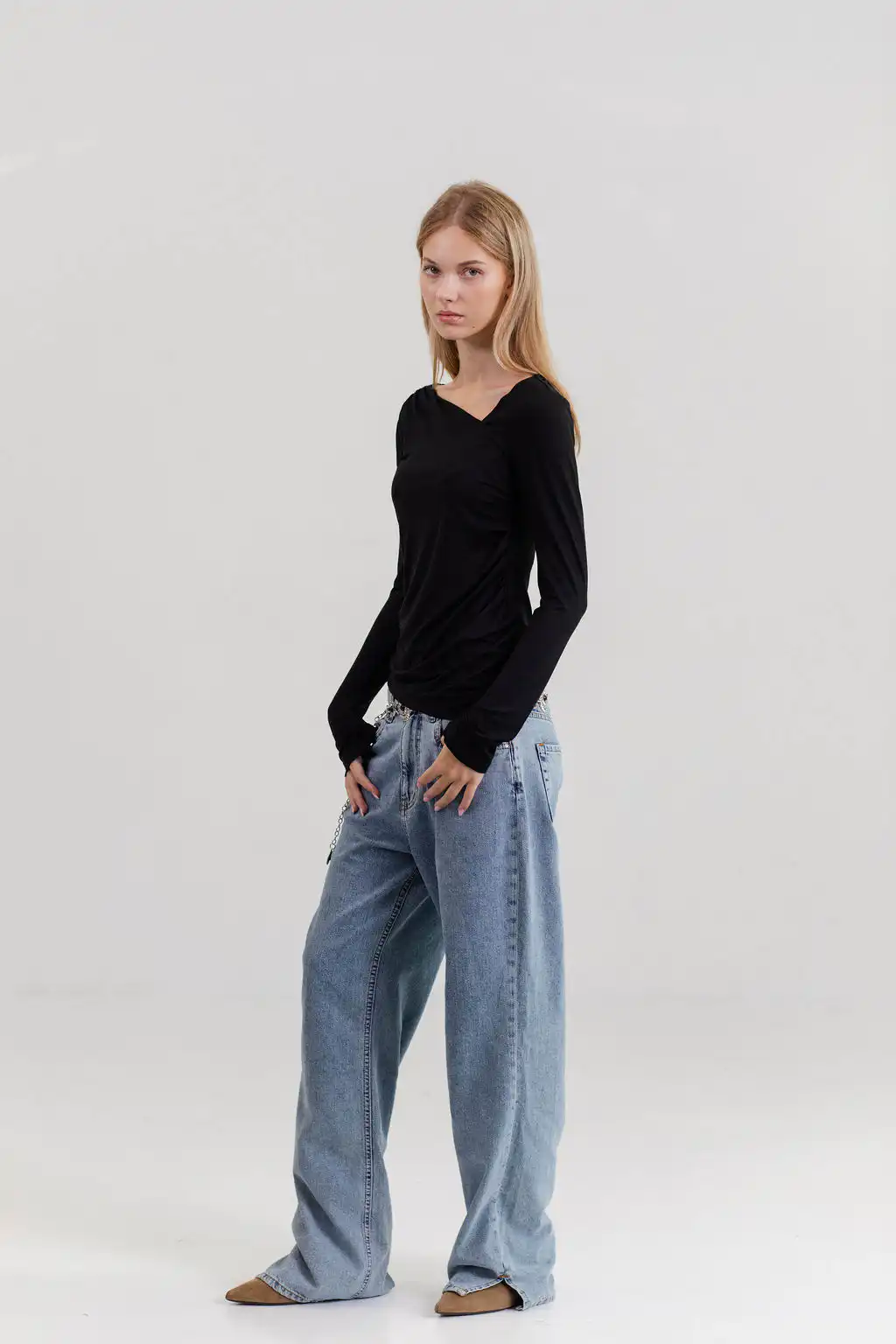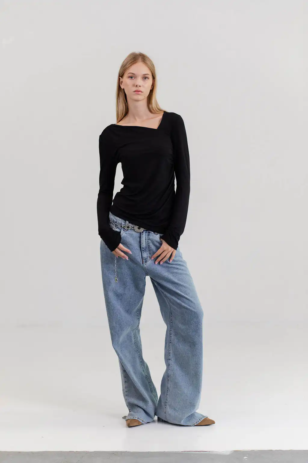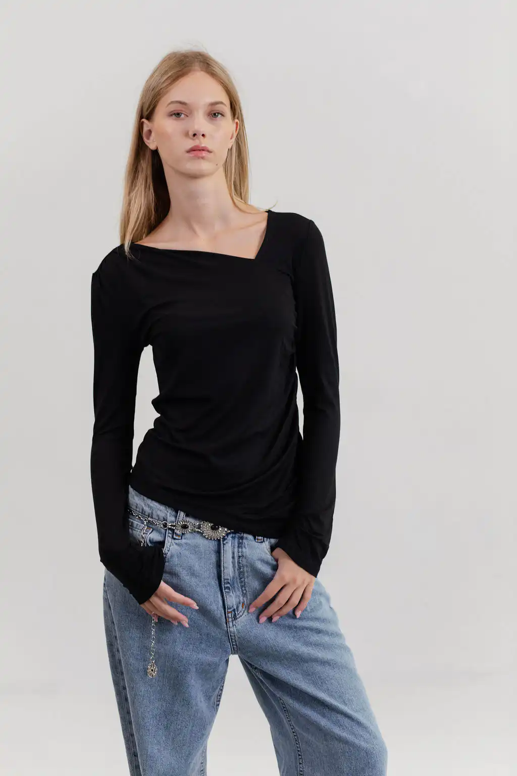 Majica Essence sa asimetričnim izrezom diskretno otkriva liniju ramena, dok blago drapiranje prati siluetu tela i daje ženstven, profinjen izgled – suptilna, a upečatljiva.