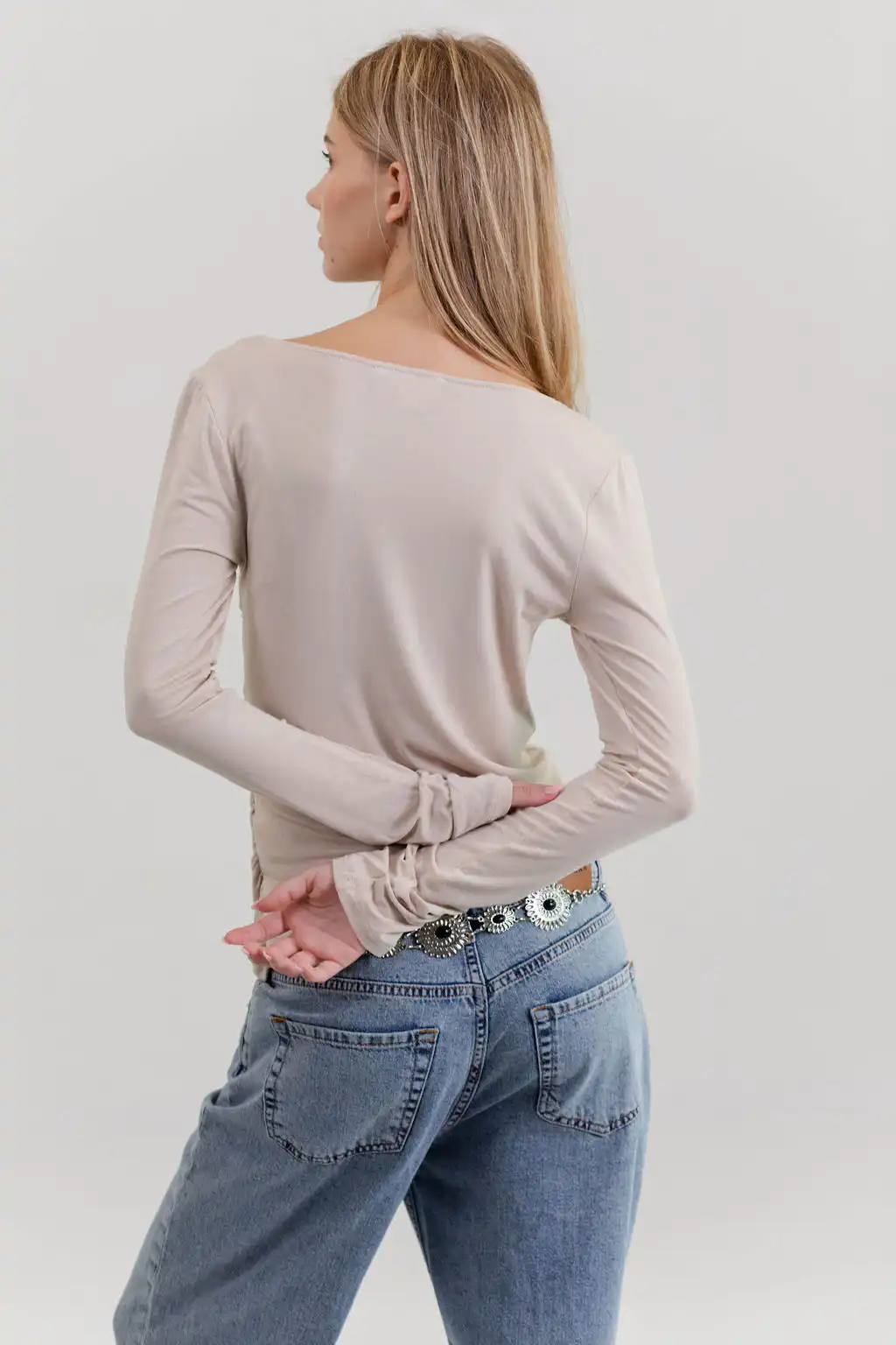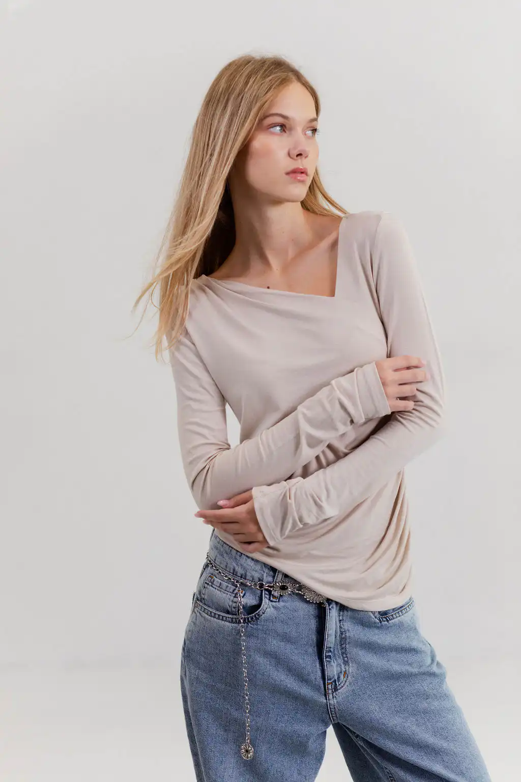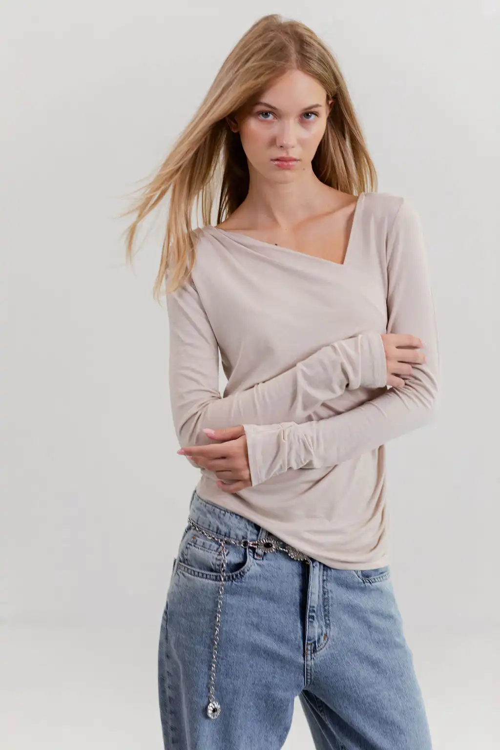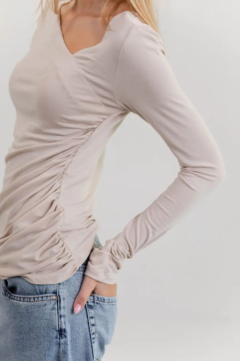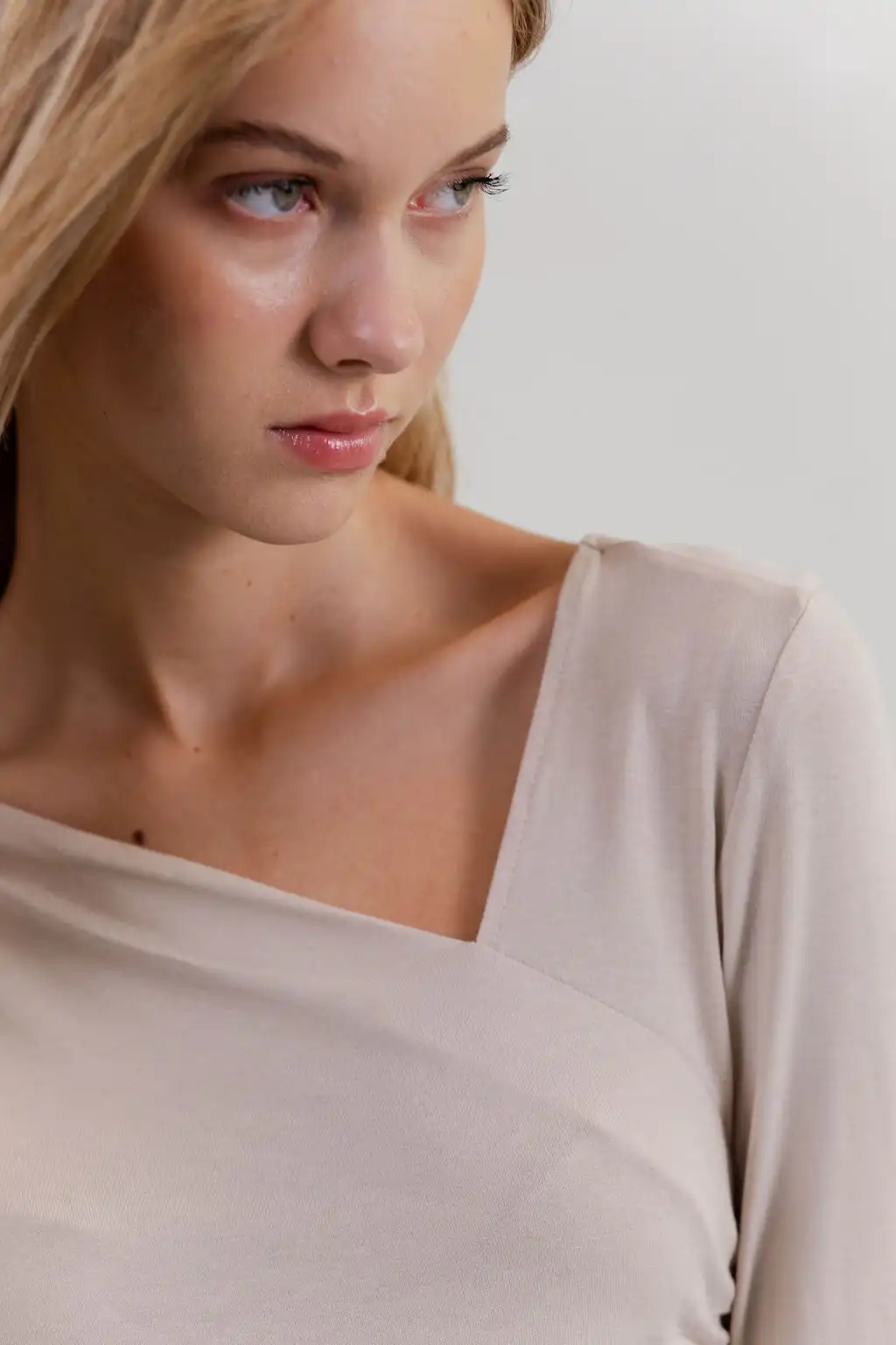 Majica Essence sa asimetričnim izrezom diskretno otkriva liniju ramena, dok blago drapiranje prati siluetu tela i daje ženstven, profinjen izgled – suptilna, a upečatljiva.
