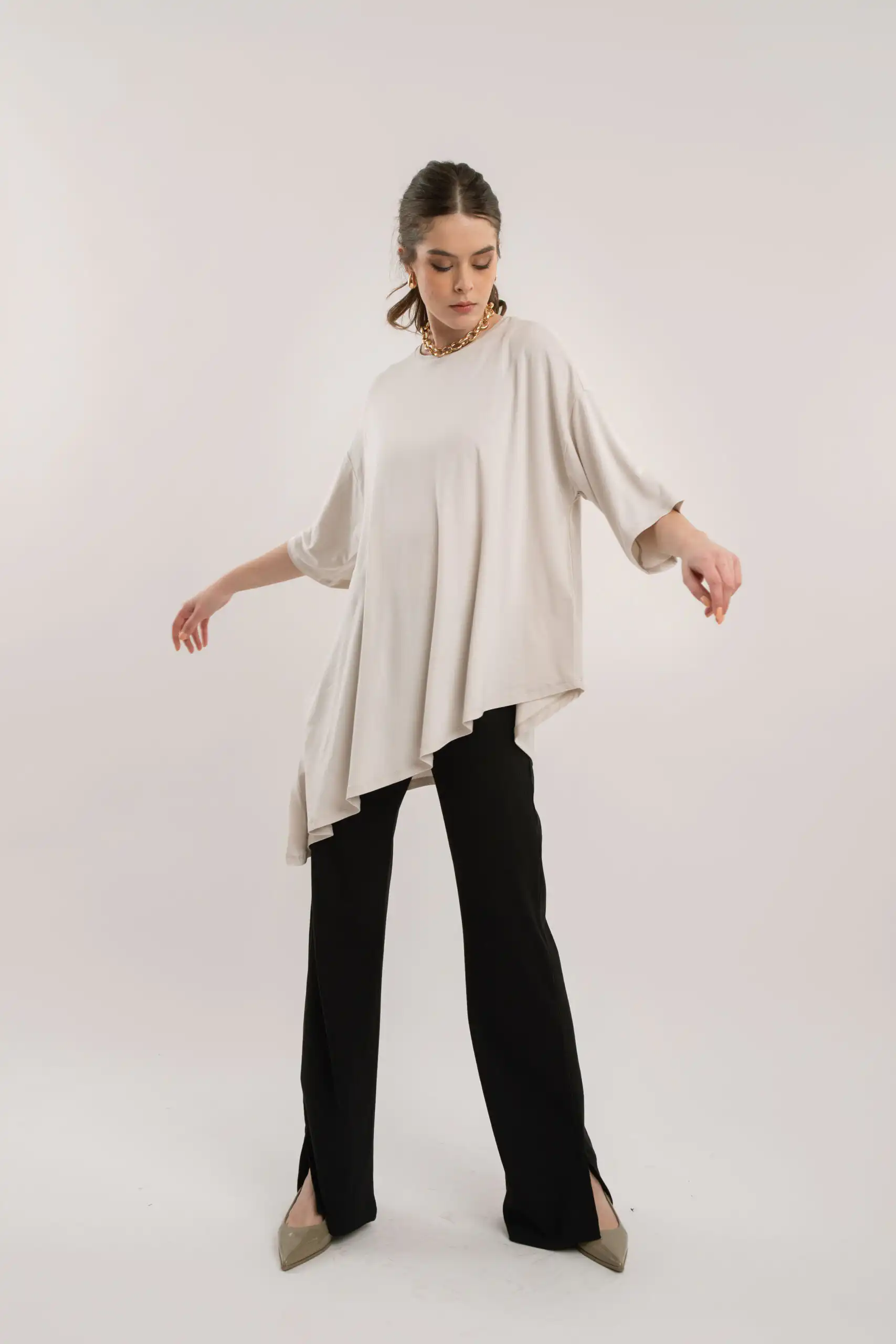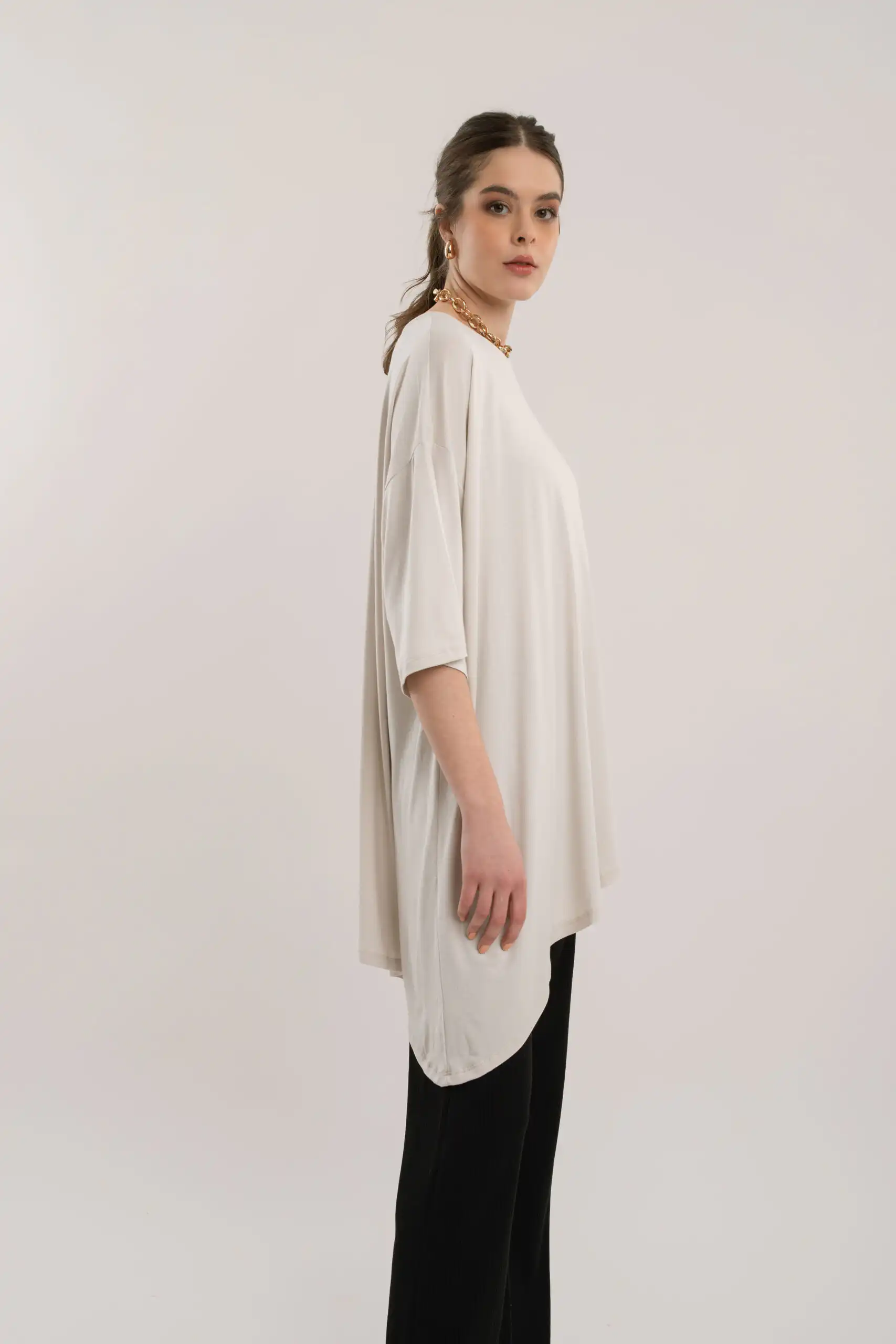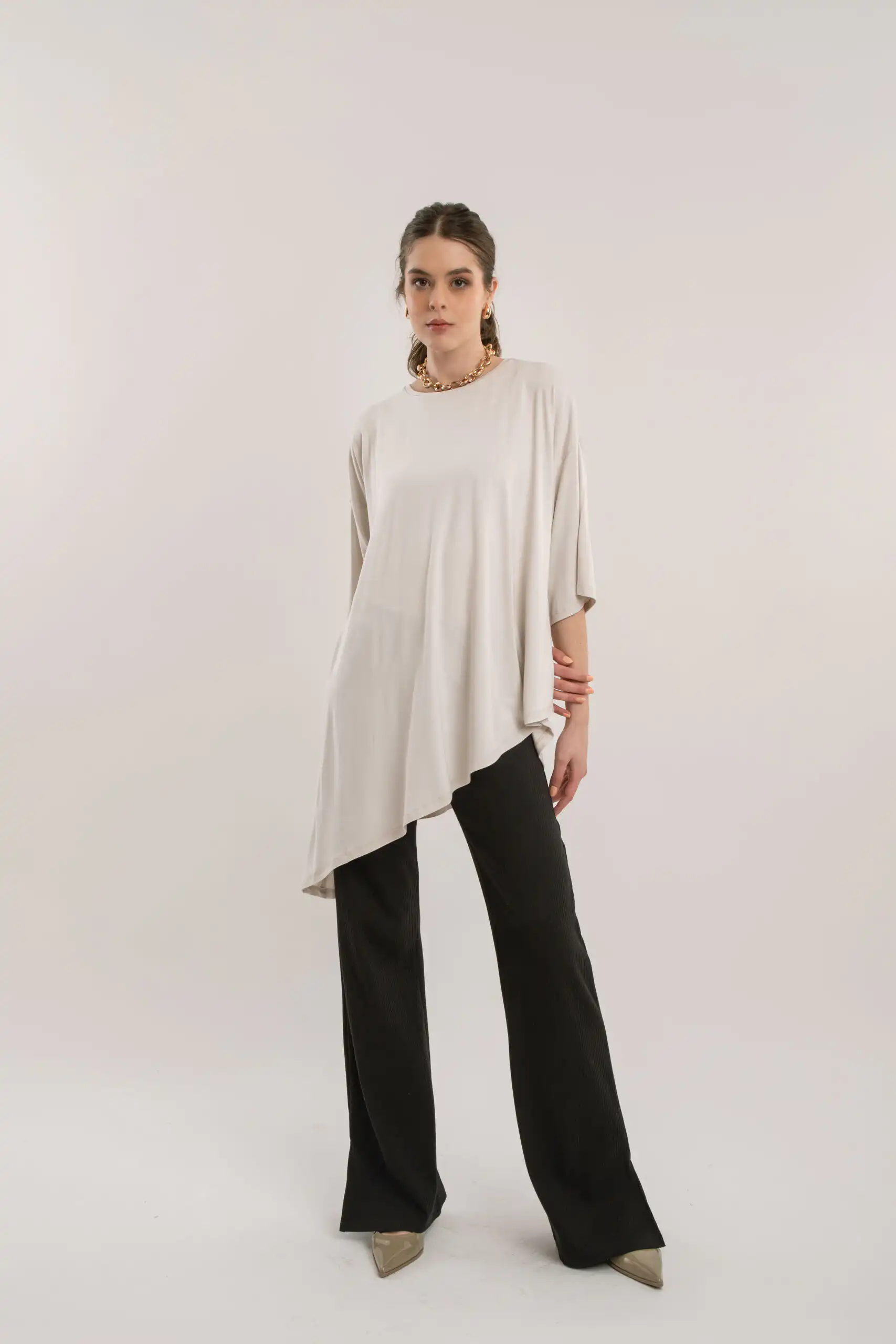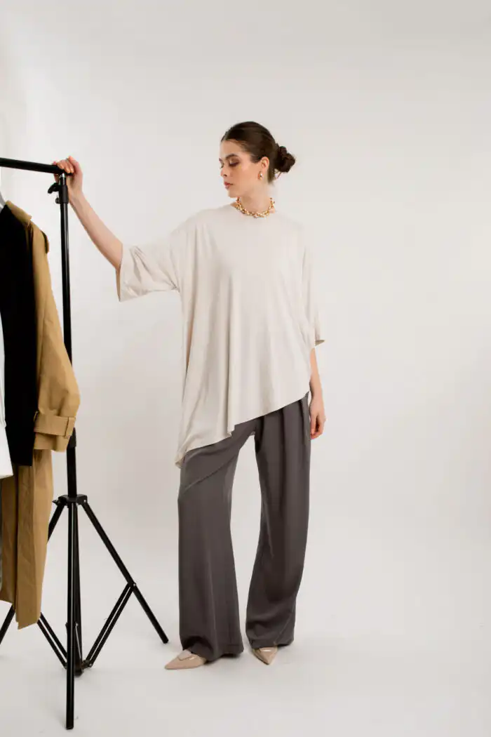 Izrađena od mekog i prozračnog materijala, pruža iznimnu udobnost pri nošenju, dok asimetrični kroj naglašava moderan izgled.