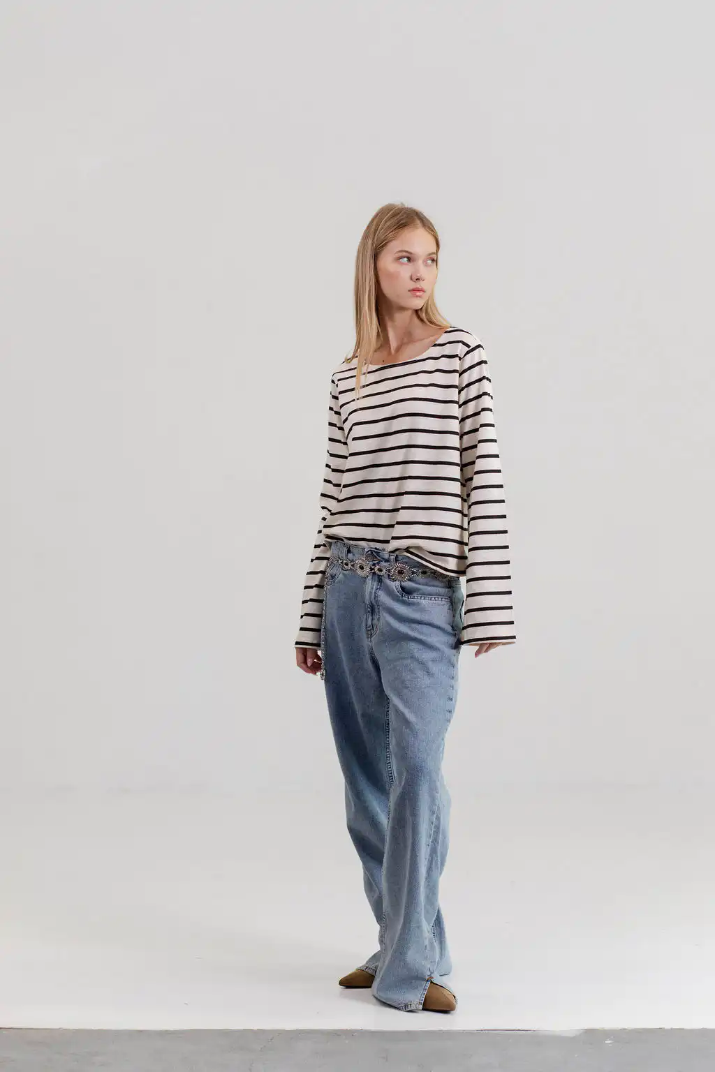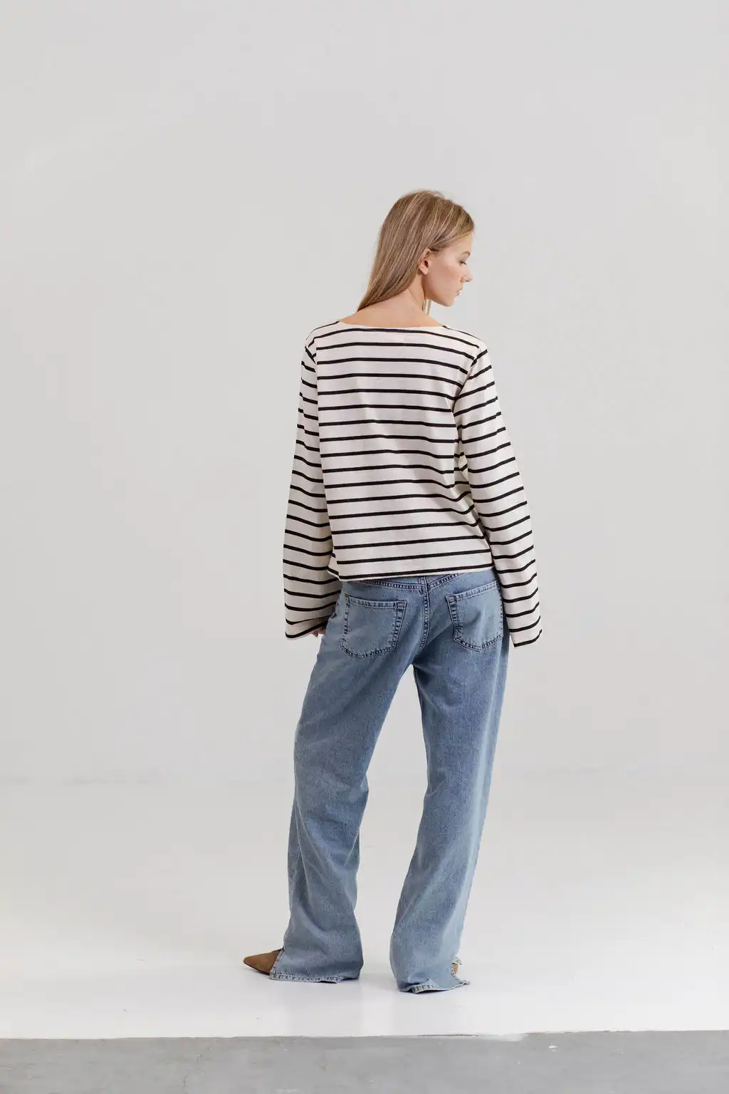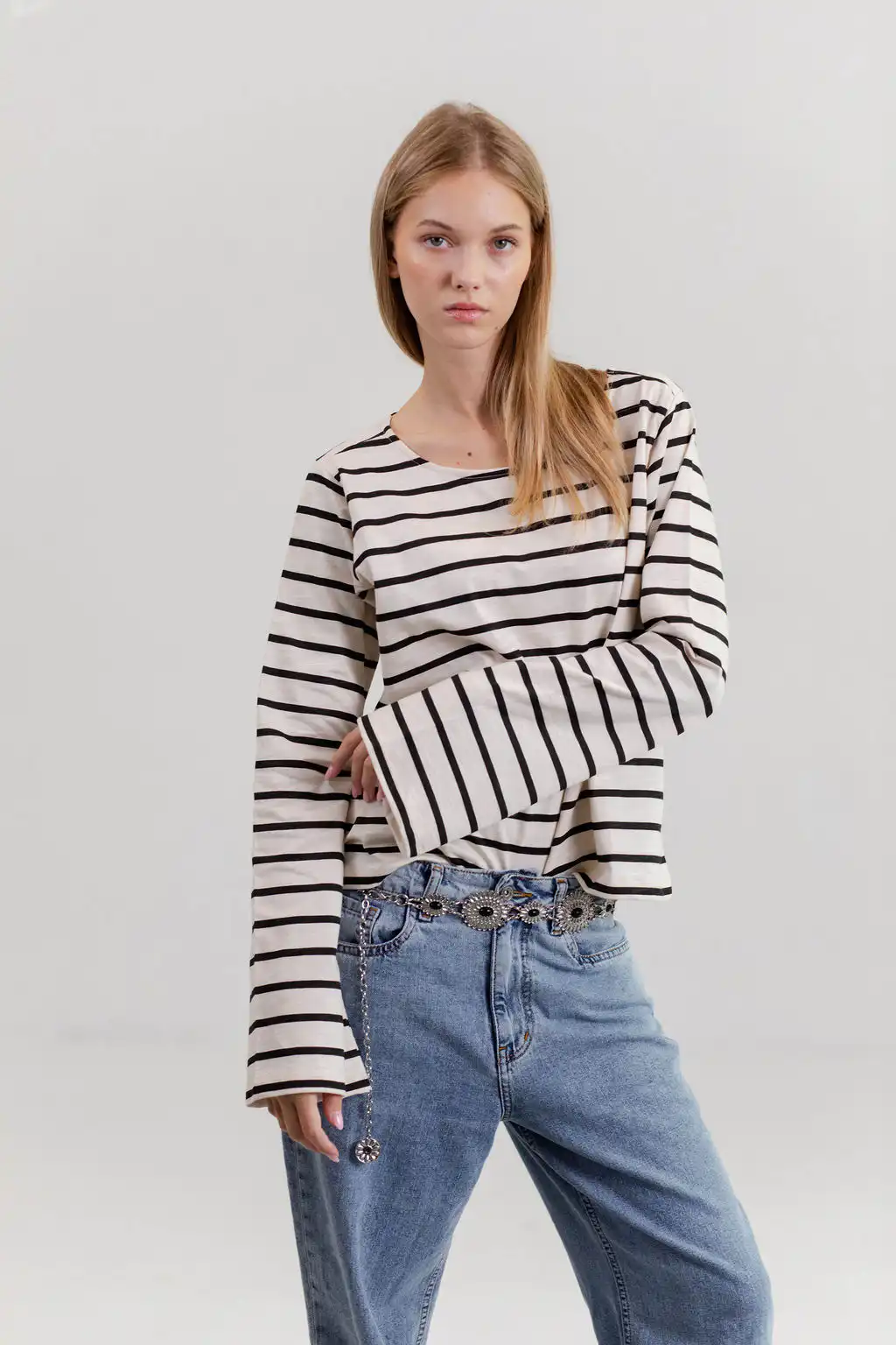Majica Belle stripes – romantična majica dugih zvonastih rukava i blago prosirena sa dužinom da taman savršeno odgovara tvom dubokom zvonastom džinsu, nateraće te da sedneš na bajs sa korpom i odeš na pijacu po cveće i baget. Tvoj novi basic izbor kad je dug rukav u pitanju.