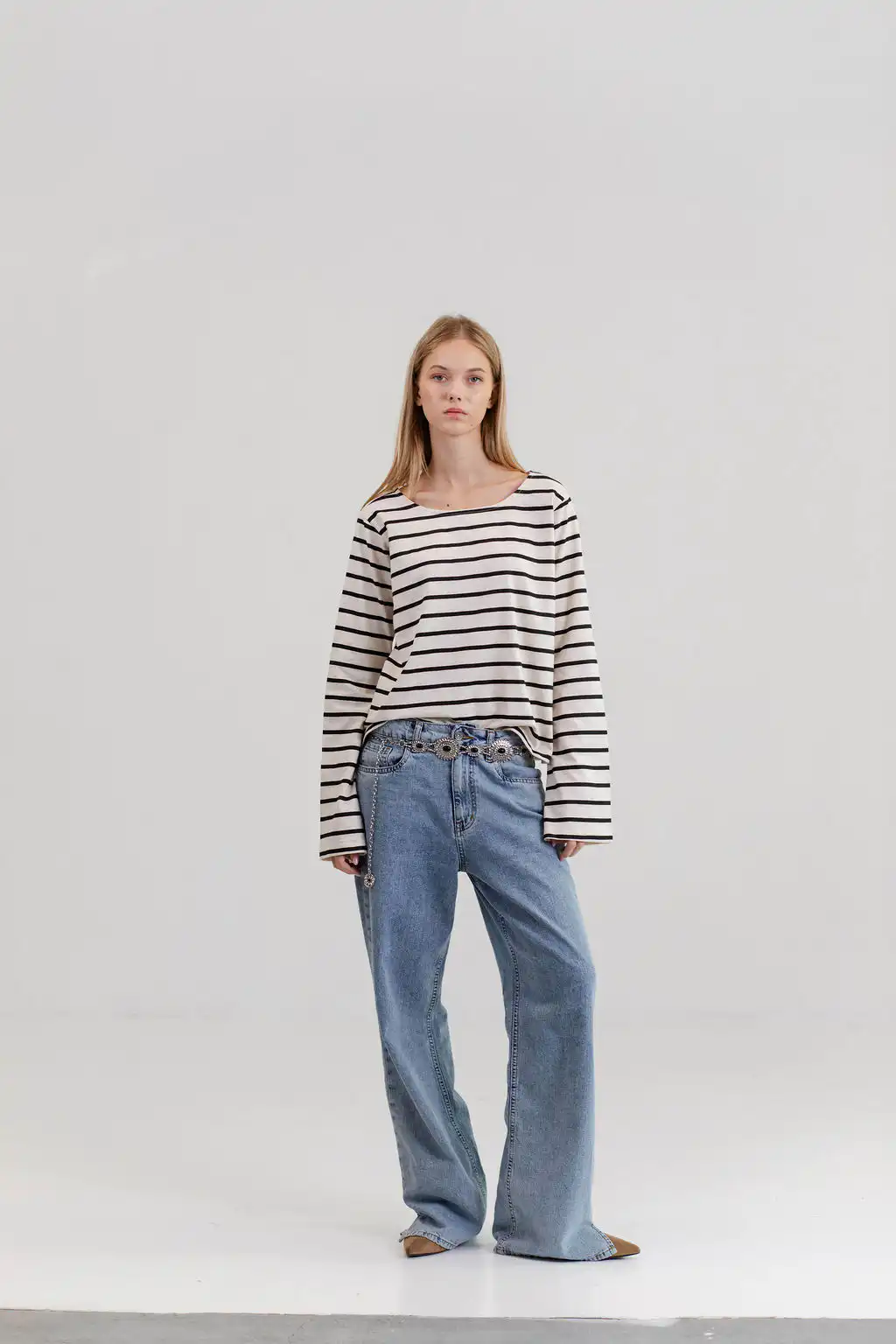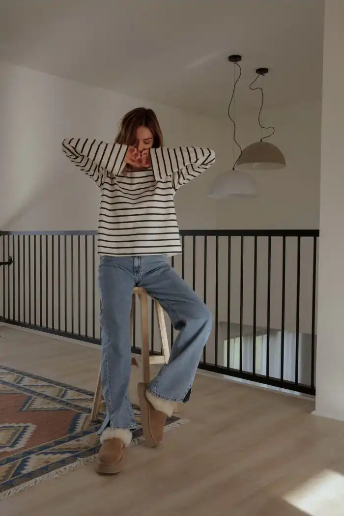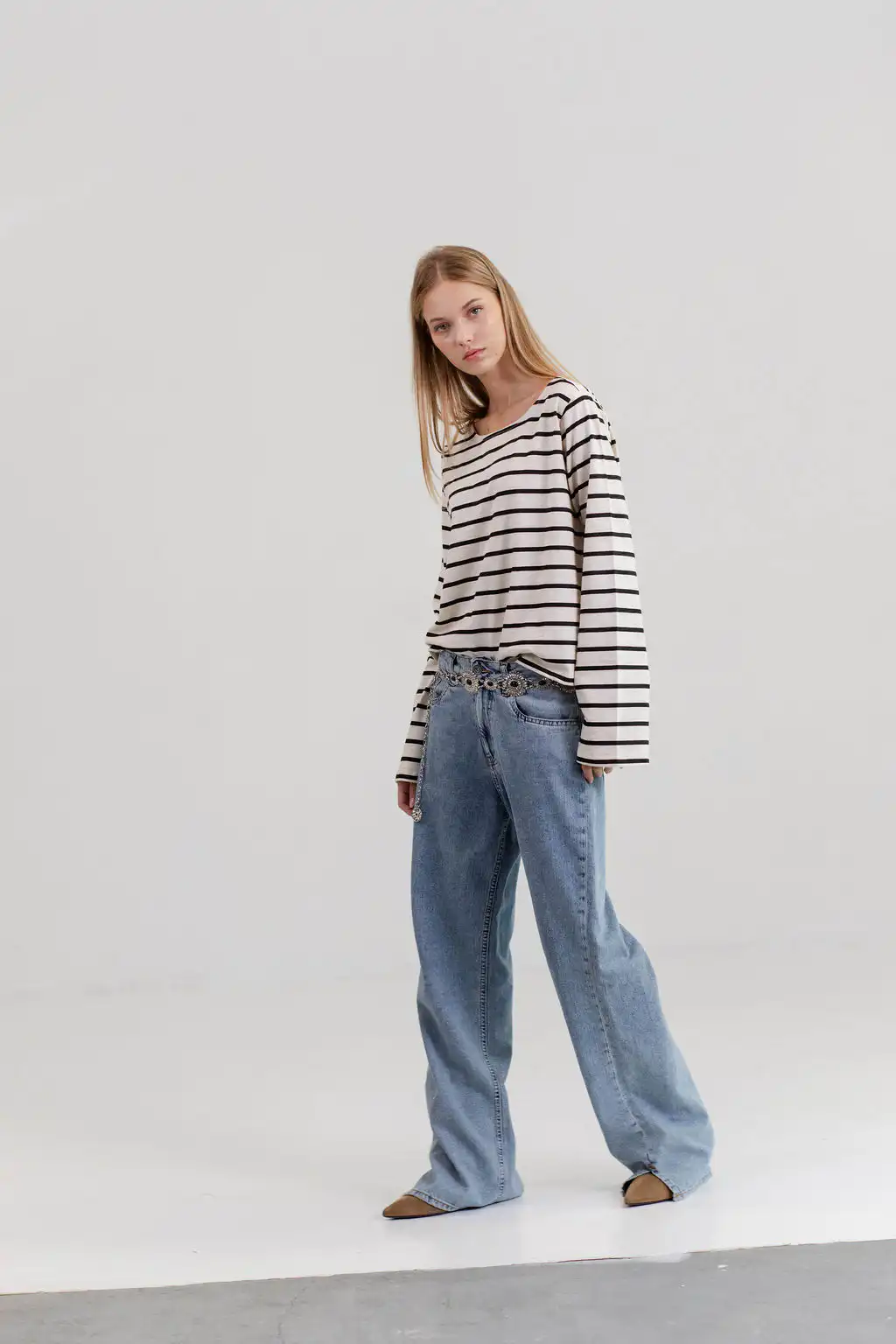 Majica Belle stripes – romantična majica dugih zvonastih rukava i blago prosirena sa dužinom da taman savršeno odgovara tvom dubokom zvonastom džinsu, nateraće te da sedneš na bajs sa korpom i odeš na pijacu po cveće i baget. Tvoj novi basic izbor kad je dug rukav u pitanju.