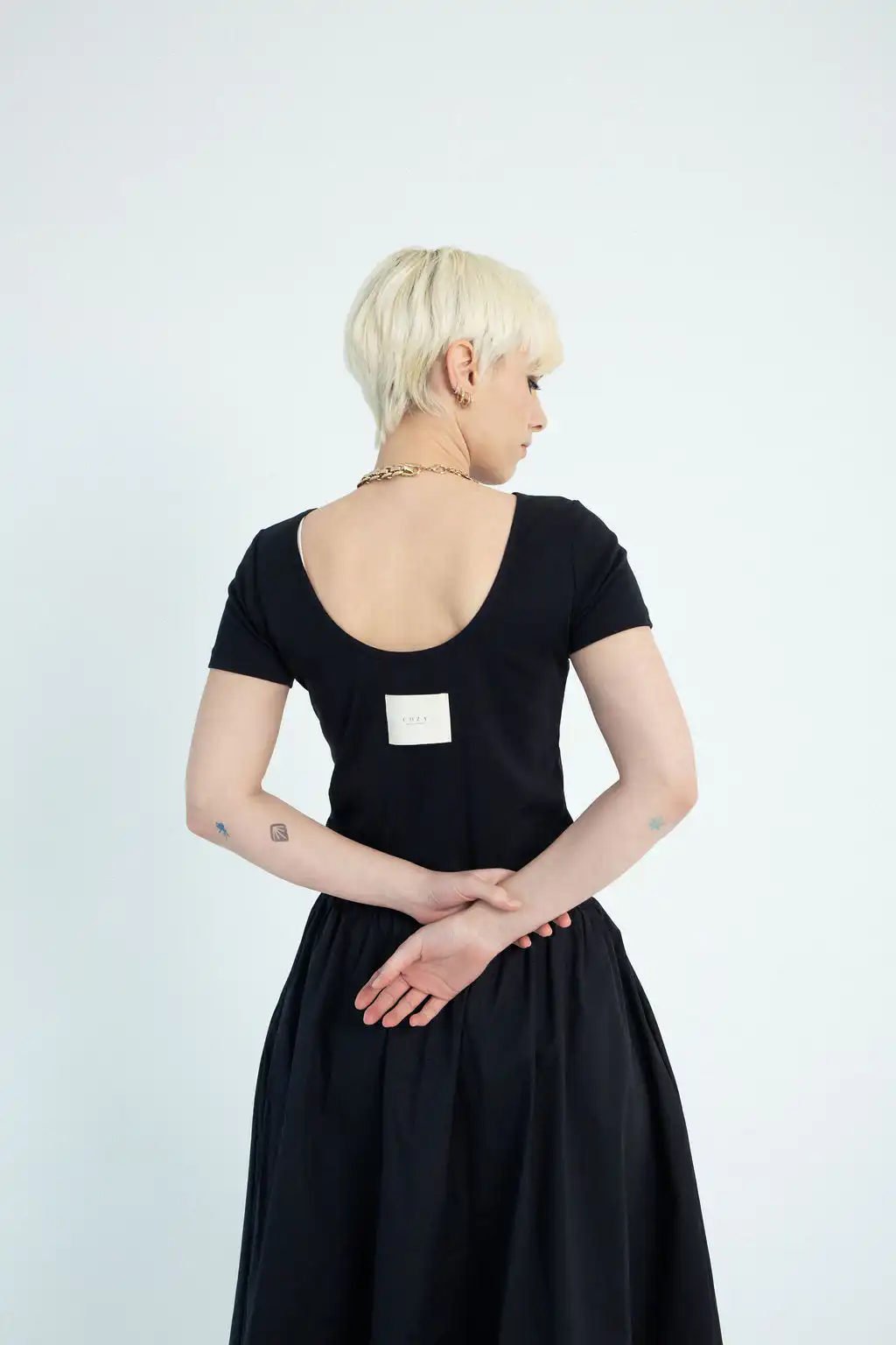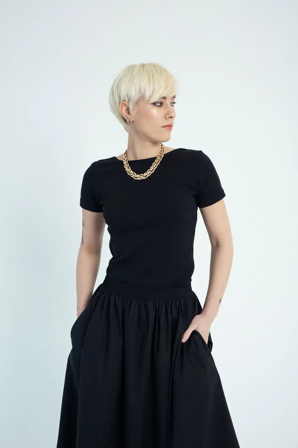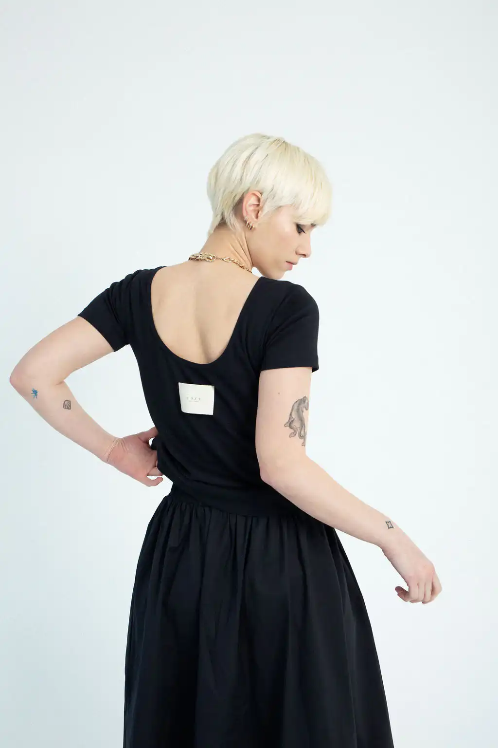 Majica Neo je nova, kratka verzija naše prepoznatljive majice Noa. Isti kroj koji volite, sada prilagođen toplijim danima. Izrađena od 100% organskog pamuka, zadržava usku siluetu i ženstveni, blago zaobljeni izrez nazad koji lepo prati liniju tela.