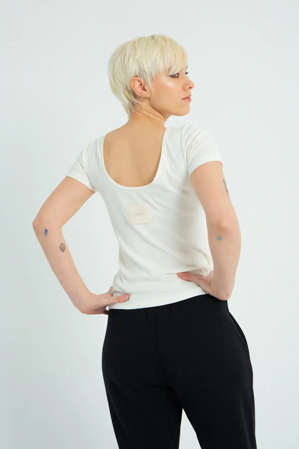 Majica Neo je nova, kratka verzija naše prepoznatljive majice Noa. Isti kroj koji volite, sada prilagođen toplijim danima. Izrađena od 100% organskog pamuka, zadržava usku siluetu i ženstveni, blago zaobljeni izrez nazad koji lepo prati liniju tela.