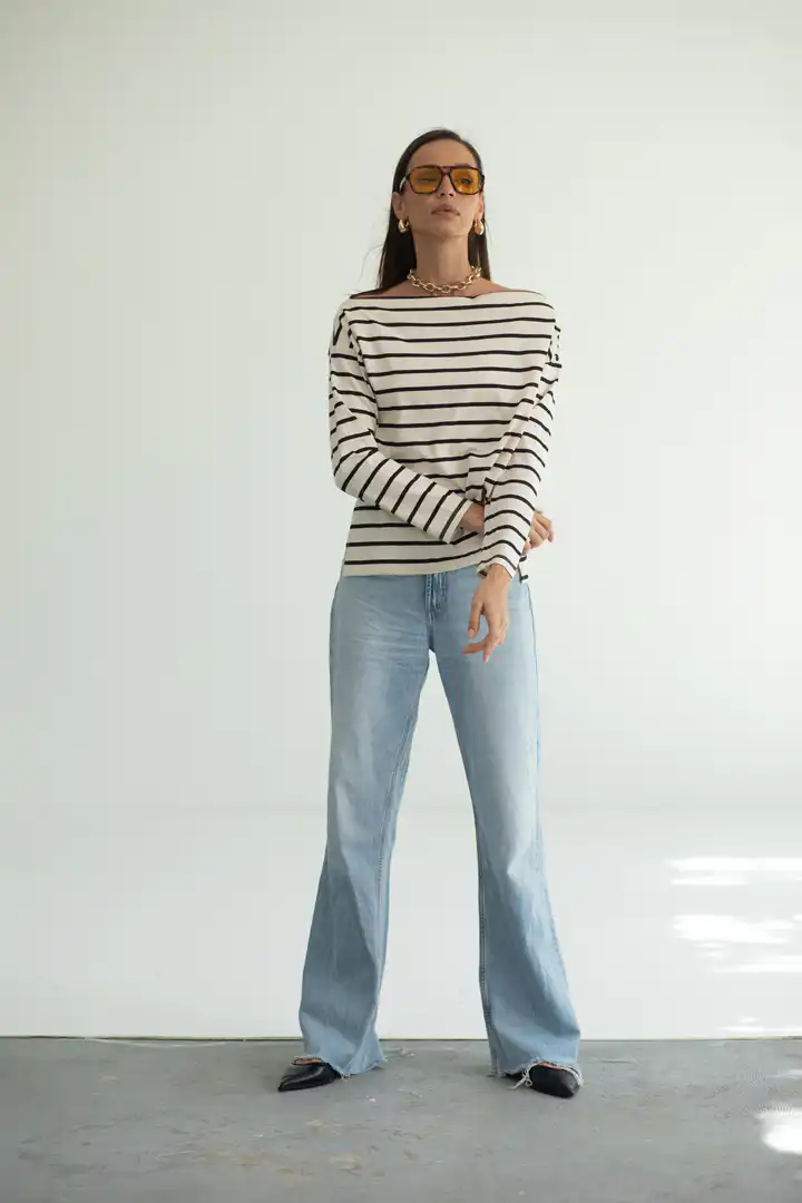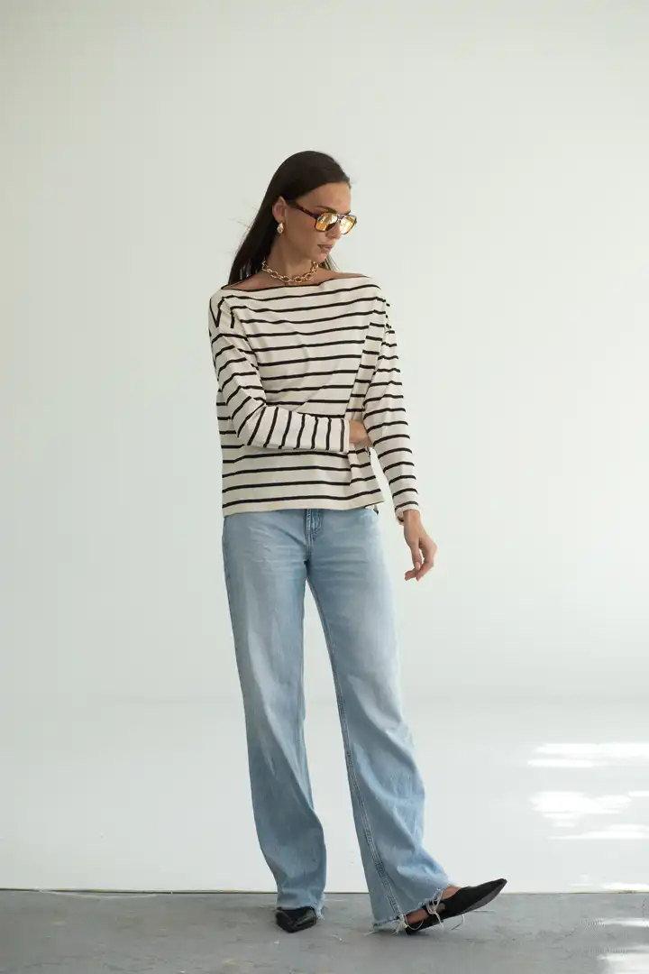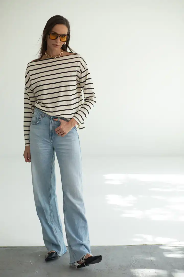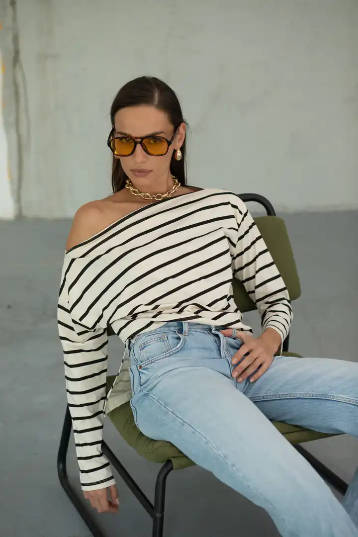 Prugasta majica sa čamac izrezom spaja udobnost i sofisticiranost u jednom klasičnom komadu. Inspirisana bezvremenskim pariškim stilom, ova majica je stvorena za trenutke kada želite da izgledate elegantno, a da se i dalje osećate potpuno opušteno. Ova majica je savršen izbor kako za ležerne dnevne kombinacije, tako i za večernje šetnje gradom. Možete je upariti sa farmerkama za nonšalantan izgled, ili sa elegantnim pantalonama i nakitom za sofisticiraniji stil.
