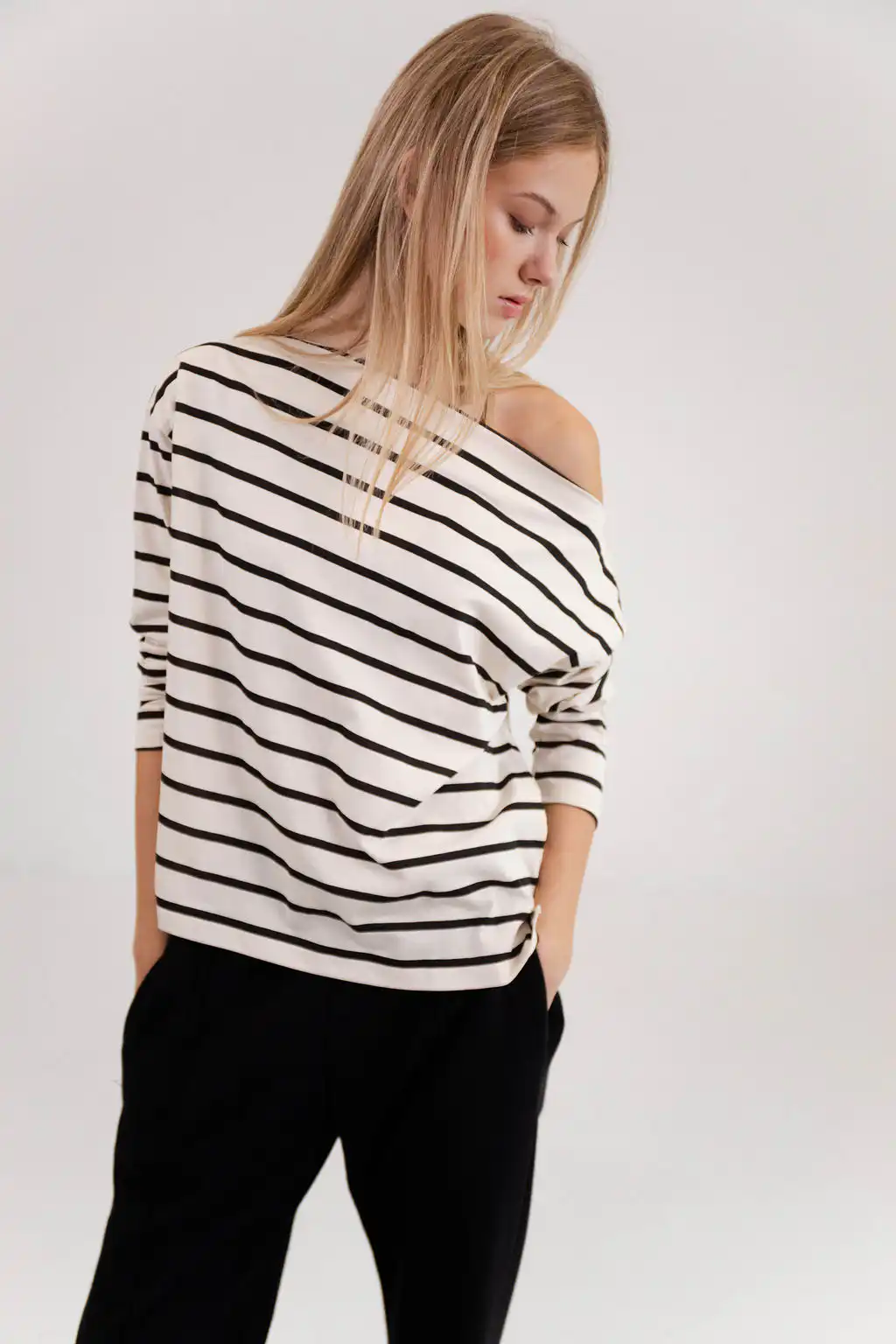 Prugasta majica od pamuka, sa čamac izrezom, elegantna i komforna u isto vreme. Napravljena za vožnju biciklom sa pletenom korpicom u kojoj se nalazi baget i cveće.