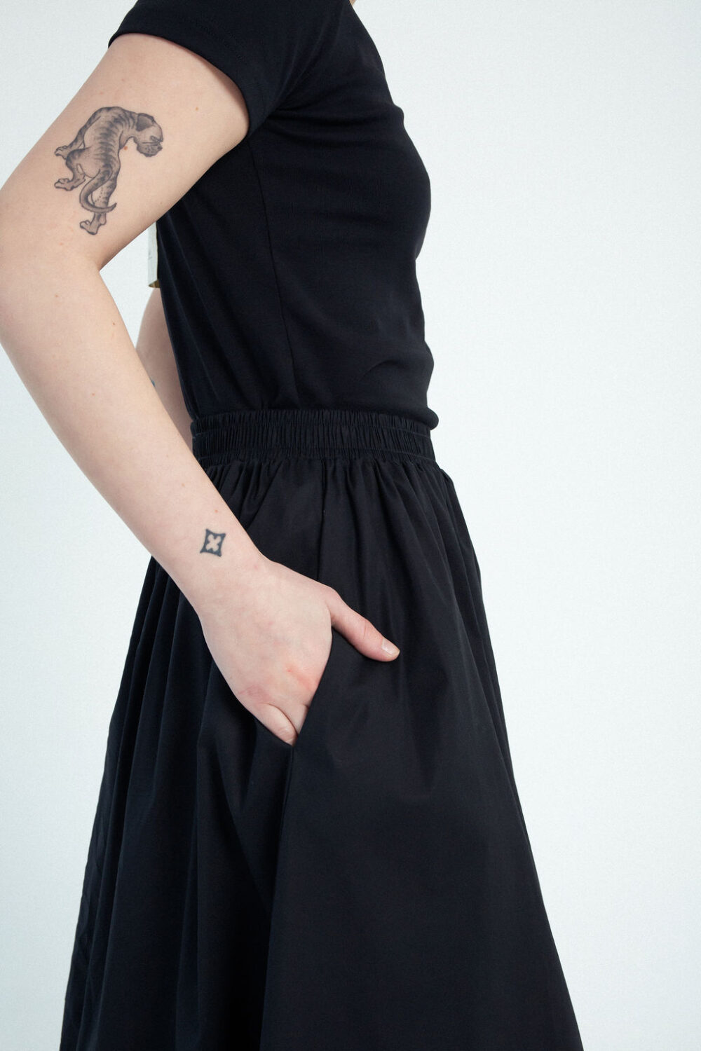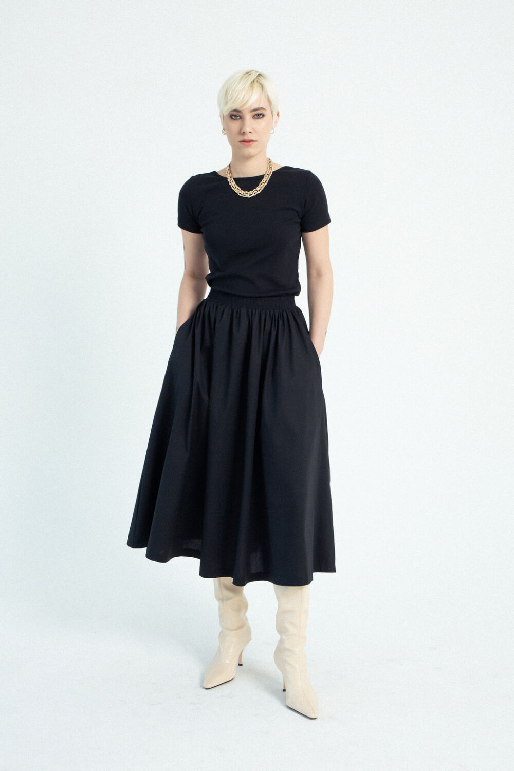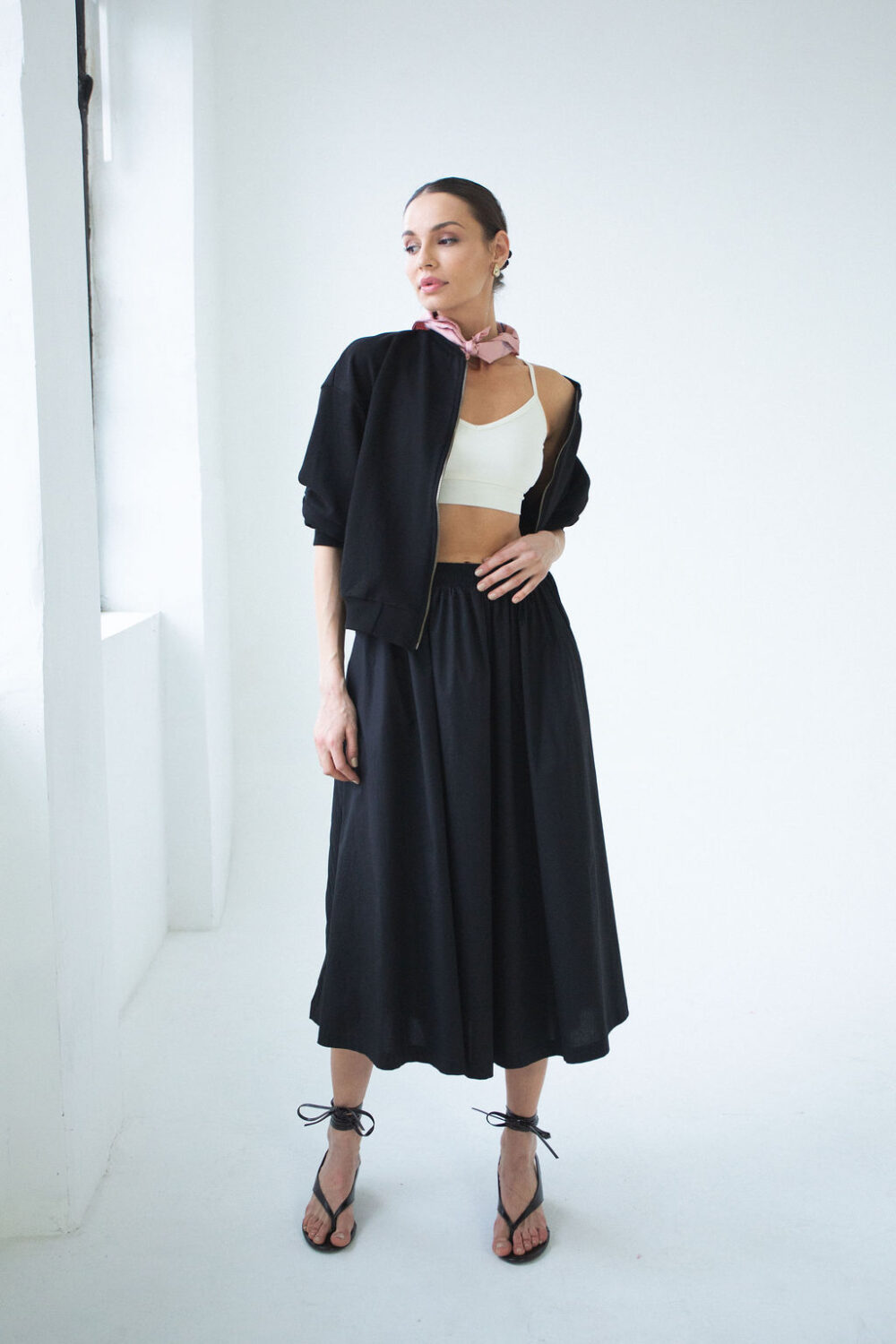Suknja Lunar je savršen izbor za sve koji žele da unesu dašak elegancije u svoj garderober, a pritom uživaju u udobnosti i praktičnosti. Ova suknja srednje dužine izrađena je od visokokvalitetne pamuk likre, što joj daje mekoću i prijatan osećaj na koži. Njen široki kroj i elastični lastis u pojasu omogućavaju slobodu pokreta. Bilo da je nosite uz majicu, top ili košulju, suknja Lunar će vam pružiti savršen balans između komfora i stila.
