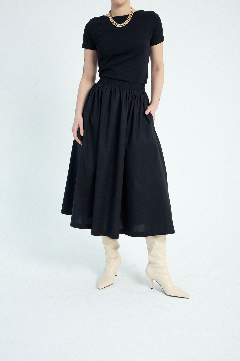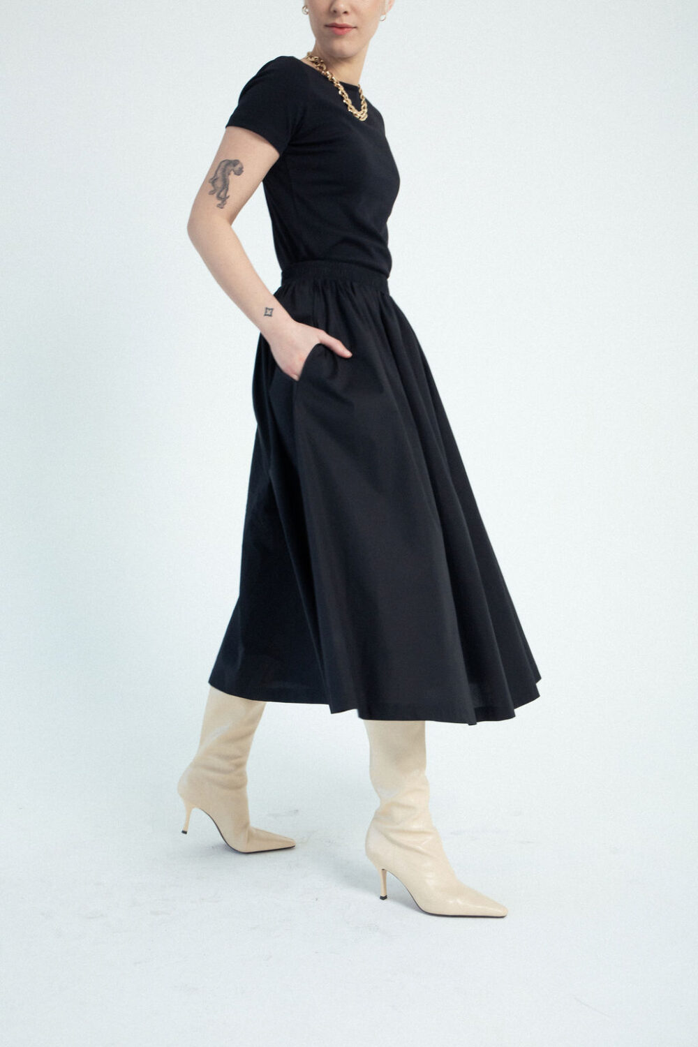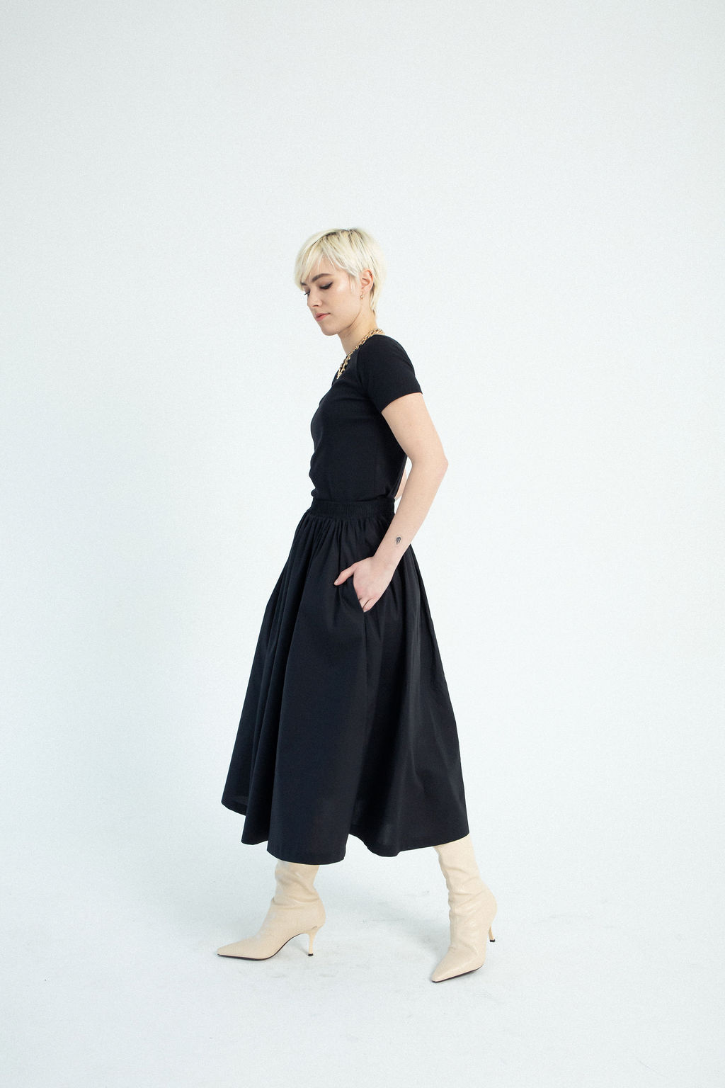 Suknja Lunar je savršen izbor za sve koji žele da unesu dašak elegancije u svoj garderober, a pritom uživaju u udobnosti i praktičnosti. Ova suknja srednje dužine izrađena je od visokokvalitetne pamuk likre, što joj daje mekoću i prijatan osećaj na koži. Njen široki kroj i elastični lastis u pojasu omogućavaju slobodu pokreta. Bilo da je nosite uz majicu, top ili košulju, suknja Lunar će vam pružiti savršen balans između komfora i stila.