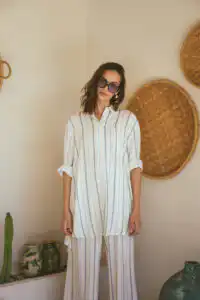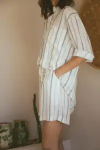 Za opuštene večeri na putovanju, kombinujte prugasti šorts i košulju sa crnim brushalter topićem. Ovaj outfit je savršen za večernje šetnje ili opuštene večere na terasi. Lagani materijali će vam omogućiti da se osećate sveže, dok prugasti dezen donosi dašak retro stila.