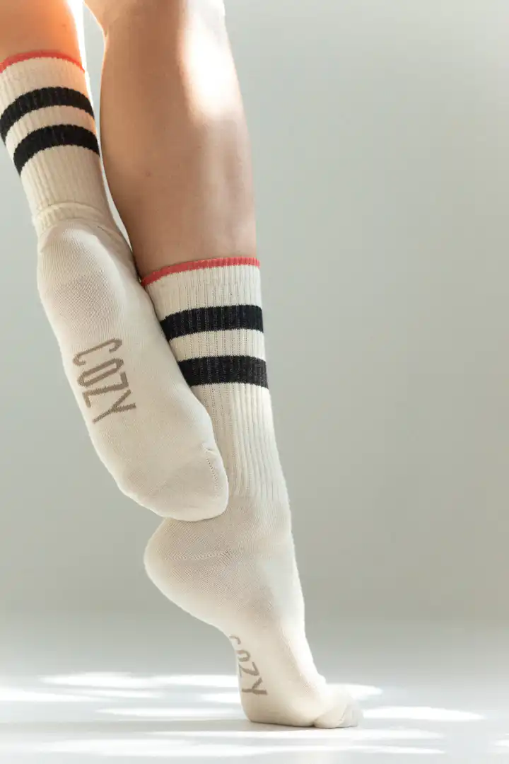 Sportske čarape od organskog pamuka, ni tanke ni debele, idealne za sve vremenske uslove i sve kombinacije. Mogu da se nose u svim godišnjim dobima. Čarape su napravljene u jednoj univerzalnoj veličini 38-41. Sa ljubavlju proizvedene pri humanim uslovima rada, i sa velikom pažnjom posvećenom detaljima, kroju i kvalitetu proizvoda. Sadrže izuzetno visoki procenat sertifikovanog organskog pamuka*, poliamid (on se koristi pri pletenju pete i prstiju da bi mogao da drži pamuk da se čarape ne raspadnu, i pravi se kod domaćeg proizvođača), i elastina. *Organski pamuk je proizveden na tradicionalan način koji je, kad se uporedi sa konvencionalnim, mnogo više prijateljski nastrojen prema globalnom eko sistemu i ljudskom zdravlju. On je daleko bolji izbor za kožu, naročito osetljivu i sklonu alergijama jer se za njegovu proizvodnju ne koriste hemikalije, herbicidi, pesticidi ili insekticidi, a samim tim ne šteti radnicima koji se bave njegovom proizvodnjom. Takođe, za proizvodnju organskog pamuka koristi se 70% manje vode i 60% manje energije nego za proizvodnju standardnog pamuka.
