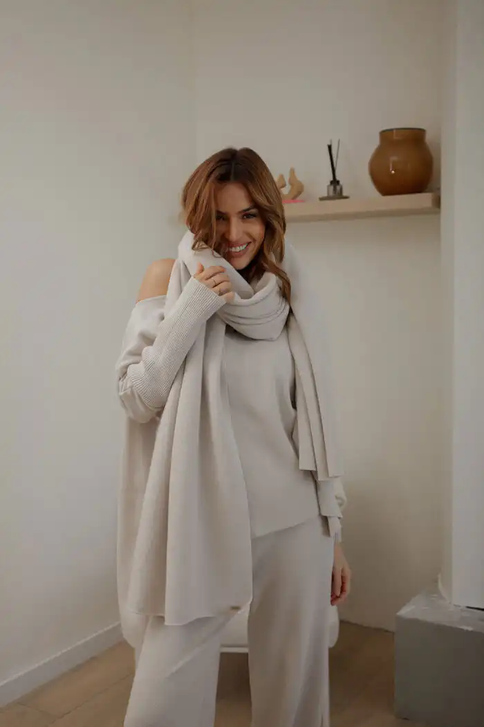 Šal-ogrtač Knitted je onaj komad koji svaki zimski i jesenji outfit podigne na viši nivo. Dimenzije šala su prilagođene tako da ga možeš nositi na više načina – prebačen preko ramena kao ogrtač, kao klasičan pal oko vrata ili kao upečatljiv modni akcenat preko kaputa. Meka struktura i čist dizajn čine ga idealnim za svaki dan, putovanja ili šetnje.