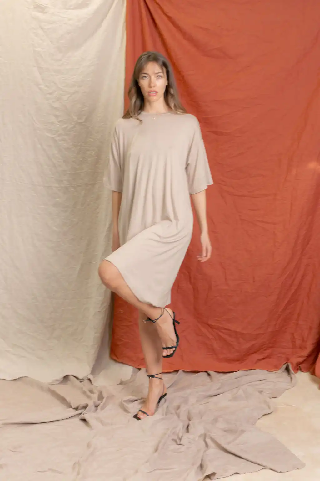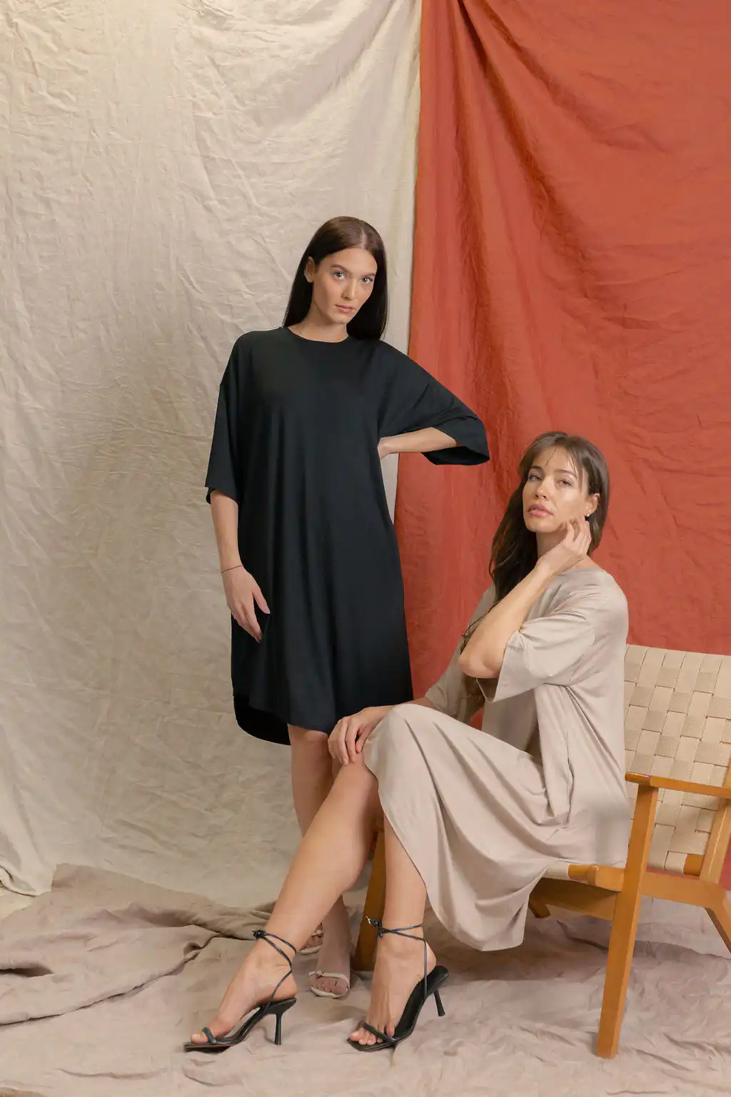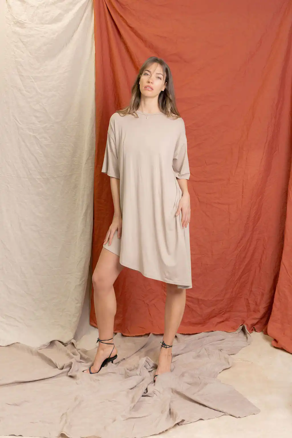 Haljina Ava zadržava prepoznatljiv opušteni kroj majice Ava i asimetričnu formu koja joj daje moderan, nenametljiv karakter. Džepovi donose dozu praktičnosti i čine je idealnim izborom za svakodnevno nošenje. Lagana i prijatna, nežno prati pokret tela bez osećaja stezanja, pa se lako nosi kroz ceo dan – uz patike, sandale ili u slojevitim kombinacijama, uvek izgledajući podjednako dobro.