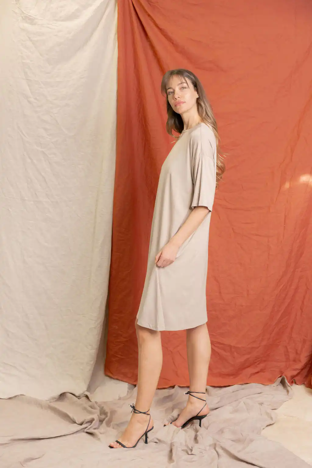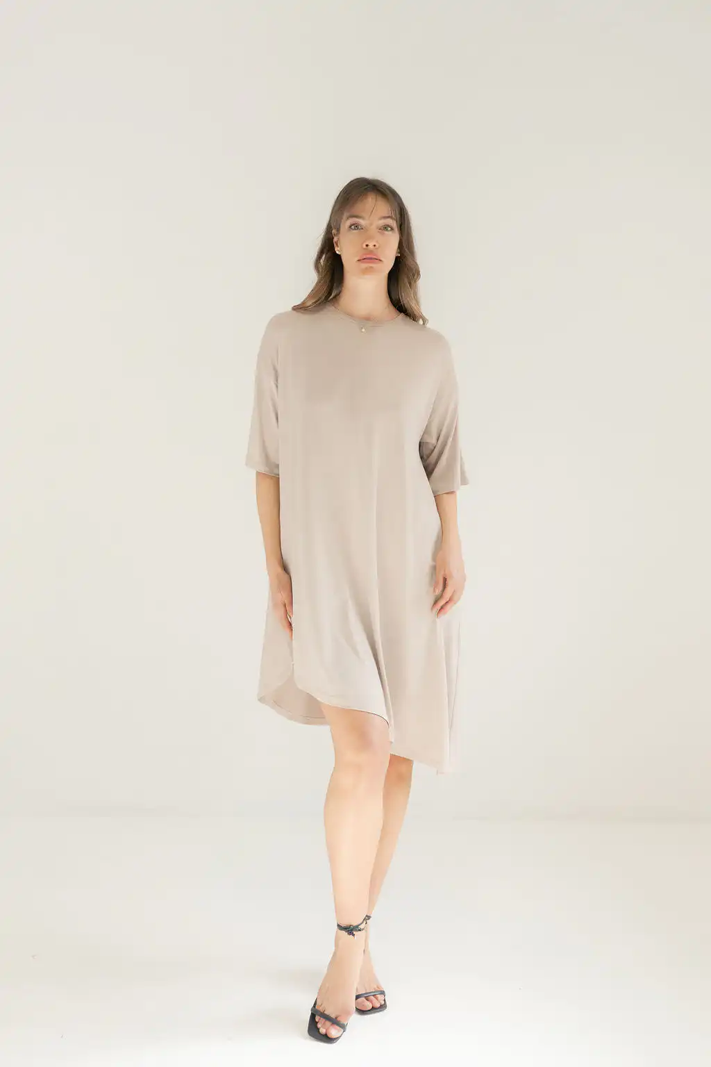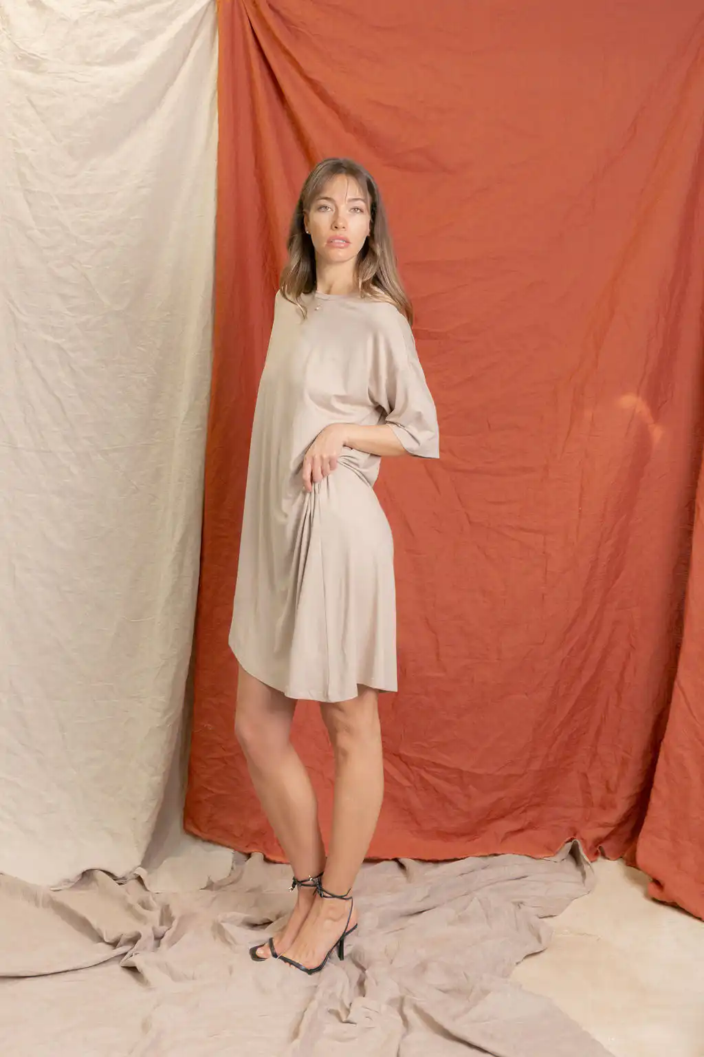 Haljina Ava zadržava prepoznatljiv opušteni kroj majice Ava i asimetričnu formu koja joj daje moderan, nenametljiv karakter. Džepovi donose dozu praktičnosti i čine je idealnim izborom za svakodnevno nošenje. Lagana i prijatna, nežno prati pokret tela bez osećaja stezanja, pa se lako nosi kroz ceo dan – uz patike, sandale ili u slojevitim kombinacijama, uvek izgledajući podjednako dobro.