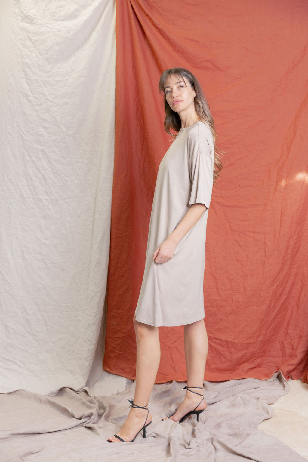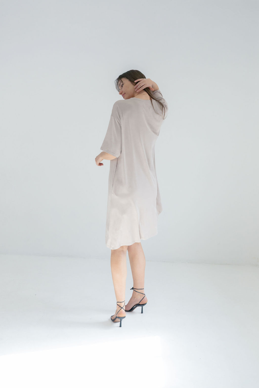 Haljina Ava zadržava prepoznatljiv opušteni kroj majice Ava i asimetričnu formu koja joj daje moderan, nenametljiv karakter. Džepovi donose dozu praktičnosti i čine je idealnim izborom za svakodnevno nošenje. Lagana i prijatna, nežno prati pokret tela bez osećaja stezanja, pa se lako nosi kroz ceo dan – uz patike, sandale ili u slojevitim kombinacijama, uvek izgledajući podjednako dobro.