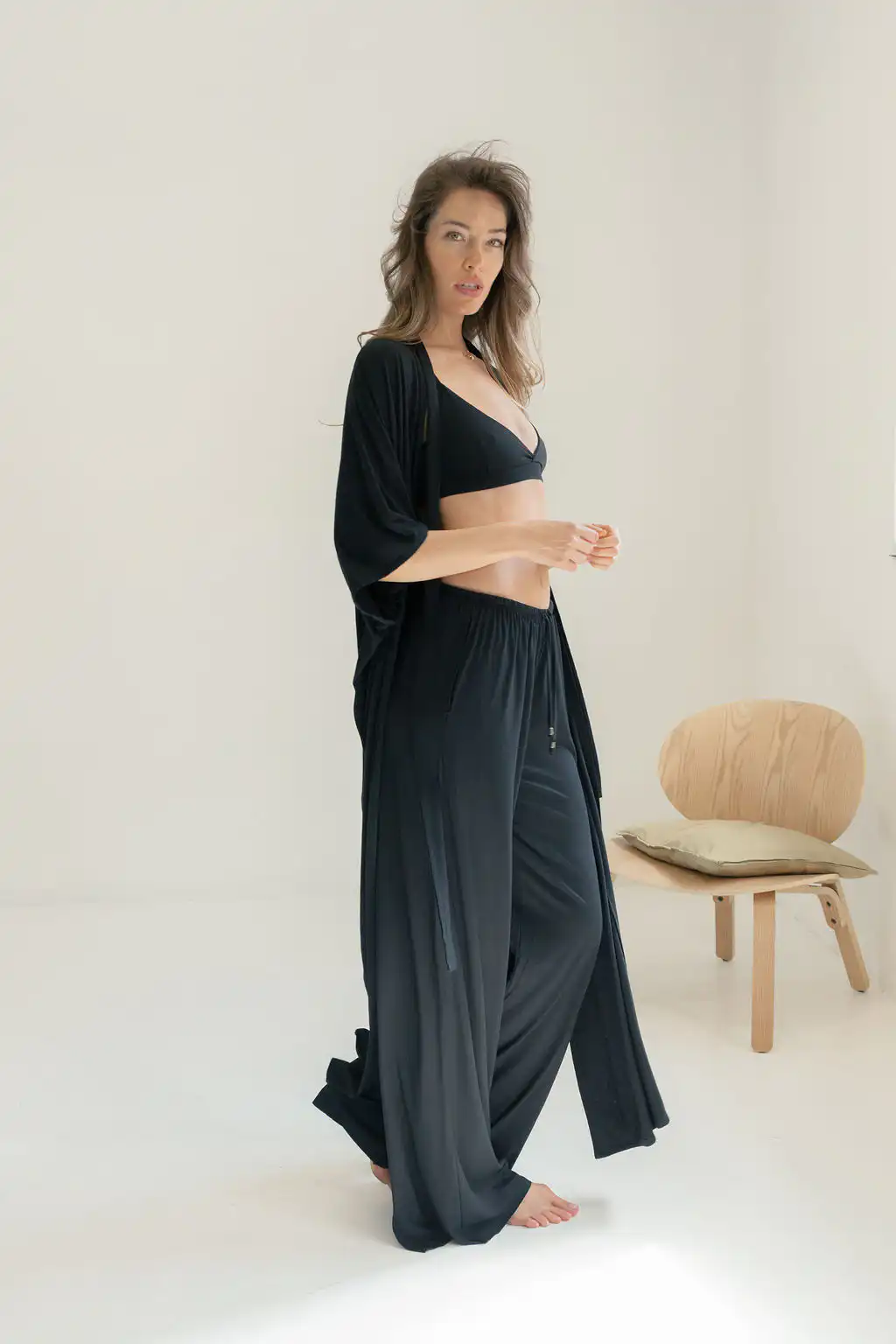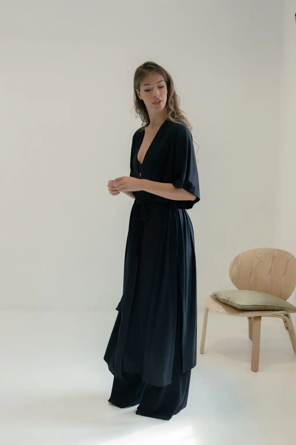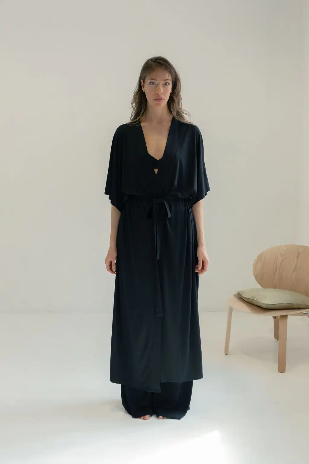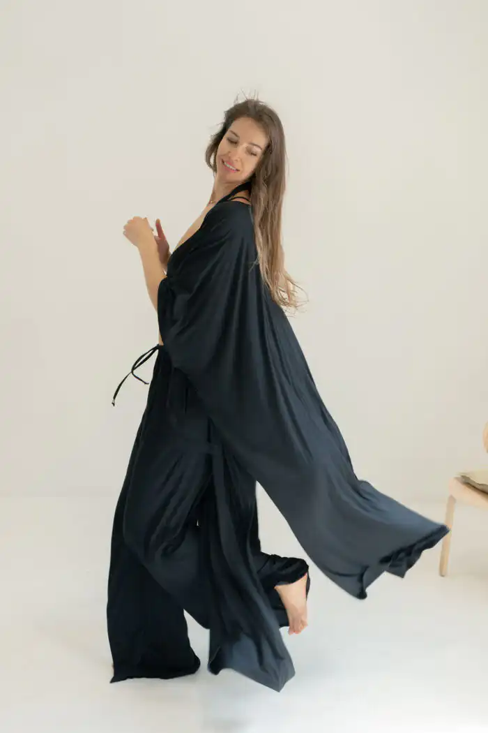 Kimono Long donosi novu dimenziju poznatog modela kimona Laganini – duži, fluidniji i izrađen od pletene viskoze koja mu daje poseban pad i mekoću, sa džepovima i dubokim šlicevima sa strane. Opušten kroj prati pokret tela, stvarajući osećaj lakoće i elegancije bez napora.