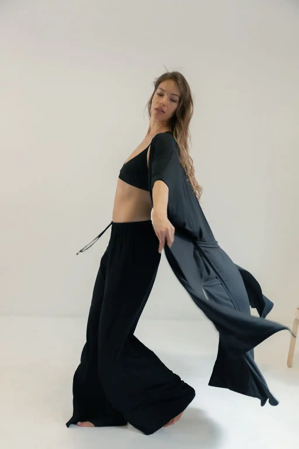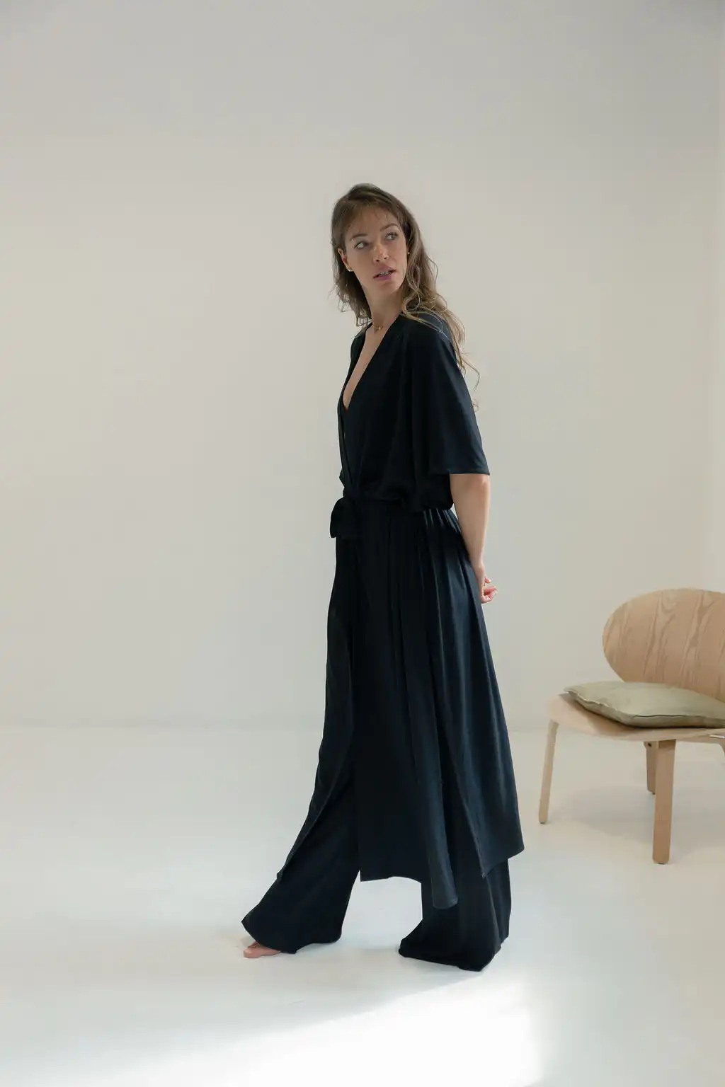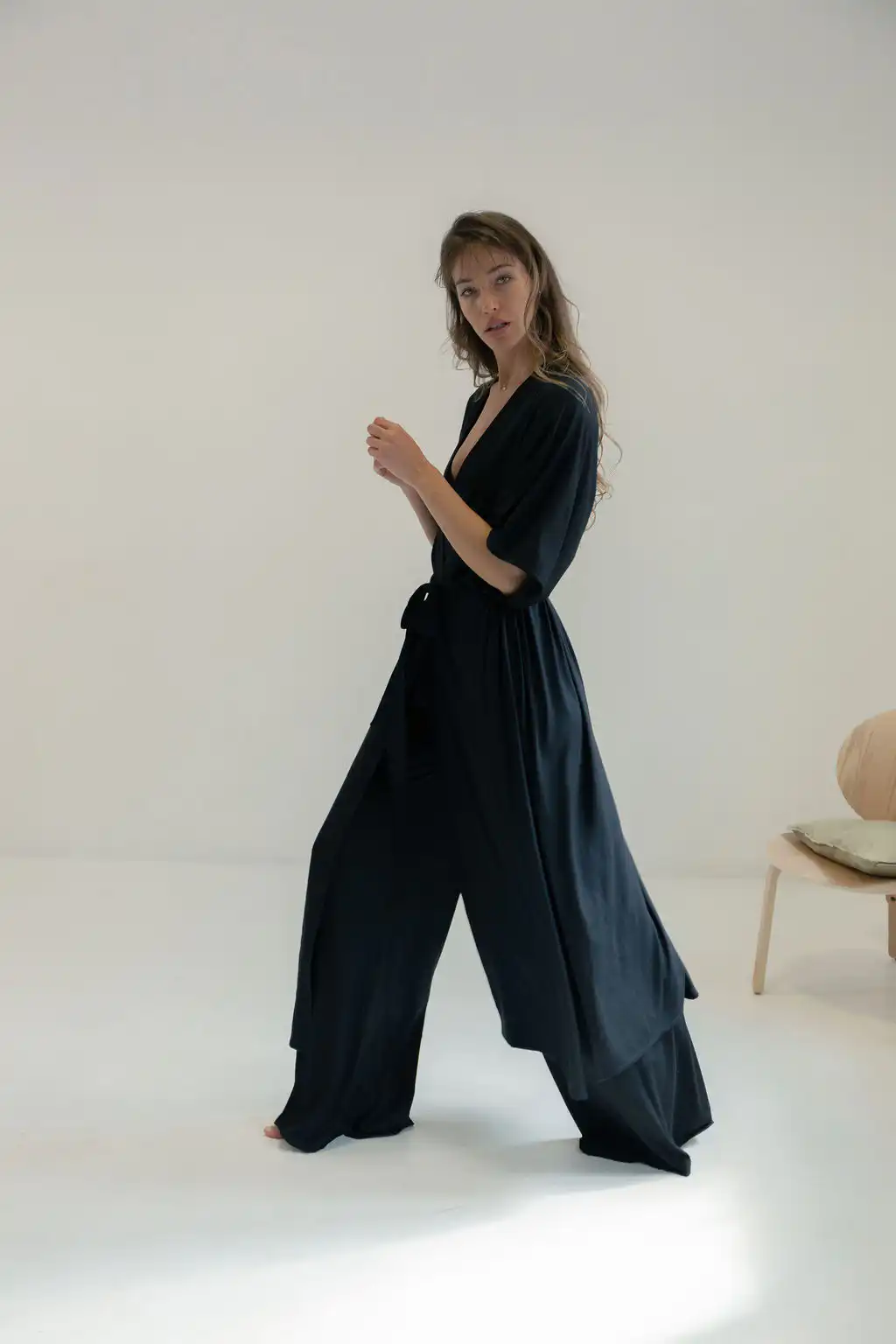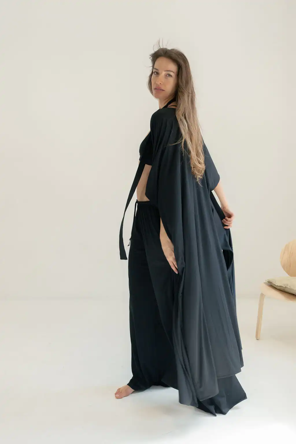 Kimono Long donosi novu dimenziju poznatog modela kimona Laganini – duži, fluidniji i izrađen od pletene viskoze koja mu daje poseban pad i mekoću, sa džepovima i dubokim šlicevima sa strane. Opušten kroj prati pokret tela, stvarajući osećaj lakoće i elegancije bez napora.