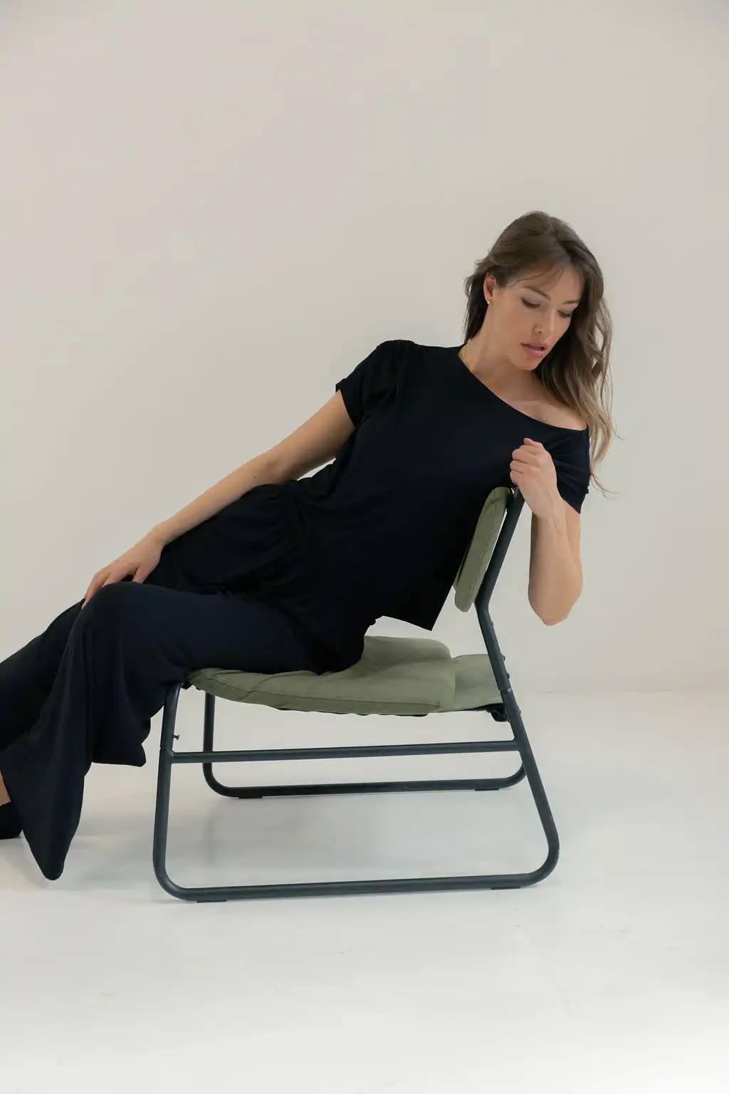Majica Ari je on majica koja na prvi pogled deluje jednostavno, a zapravo pravi razliku u celom autfitu. Rukav sa faltama daje joj poseban karakter, dok čamac izrez omogućava da je nosite na više načina – klasično ili spuštenu na jedno rame, za opušteniji i ženstveniji izgled. Lako se kombinuje ali ne izgleda obično.