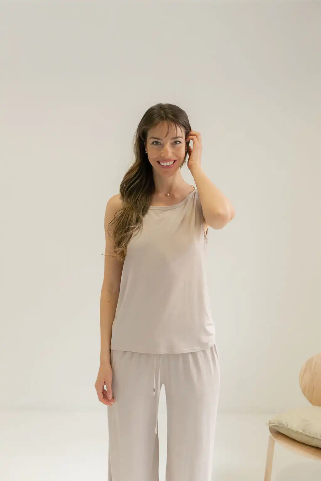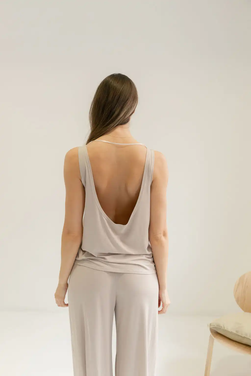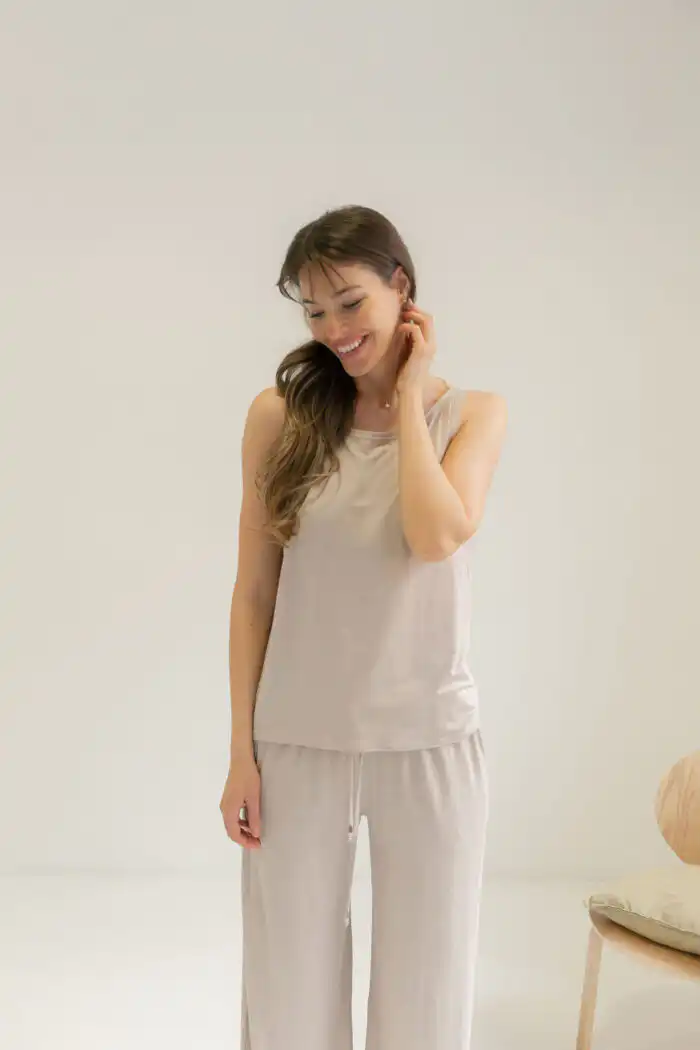 Majica Tank Top na bretele sa otvorenim leđima spaja sveden izgled i suptilnu ženstvenost. Jednostavna napred, a efektna pozadi, lako se prilagođava različitim prilikama – od opuštenih dnevnih do kombinacija uz sako za poslovni stil. U kombinaciji sa Viscose pantalonama daje utisak kompleta, poput laganog, modernog kombinezona koji izgleda sređeno bez mnogo truda.