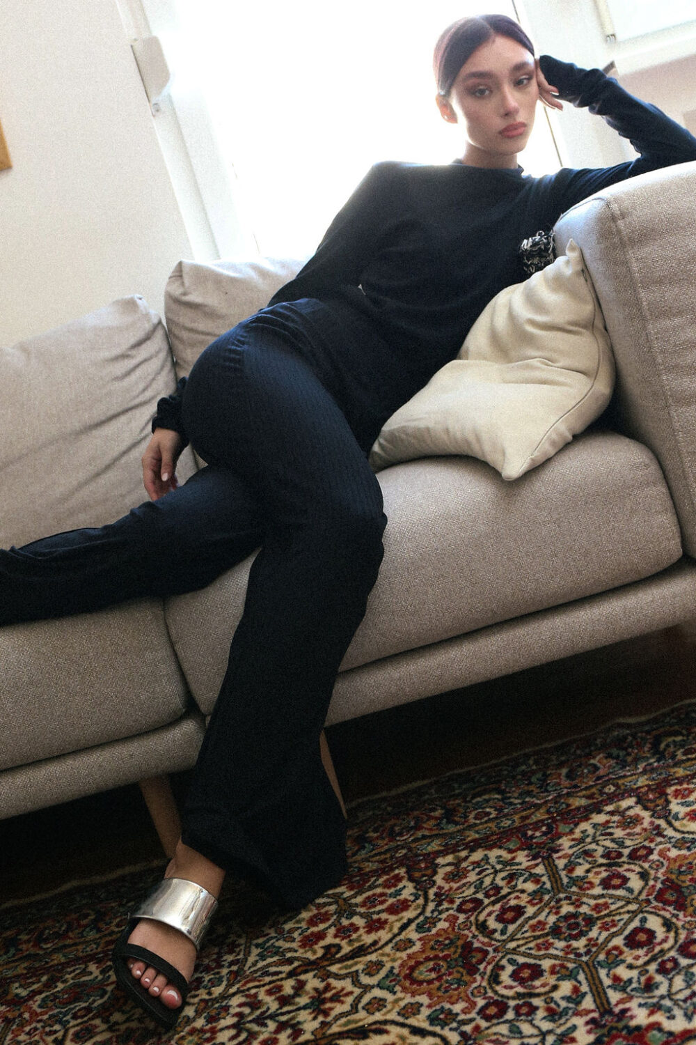 Devojka na fotografiji je visoka 173cm i nosi veličinu 36/38 – za pomoć u odabiru veličina pogledajte dimenzije proizvoda.
