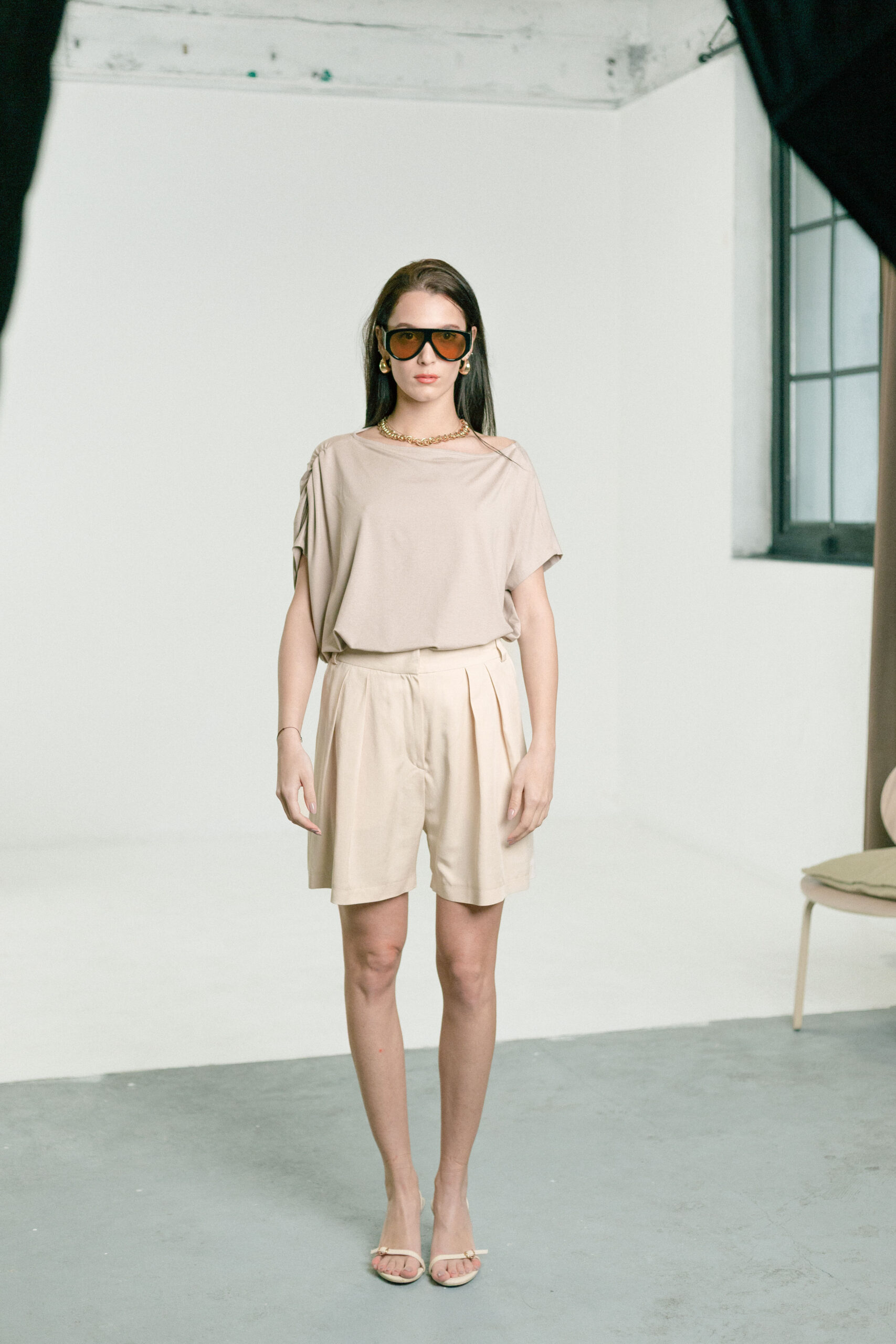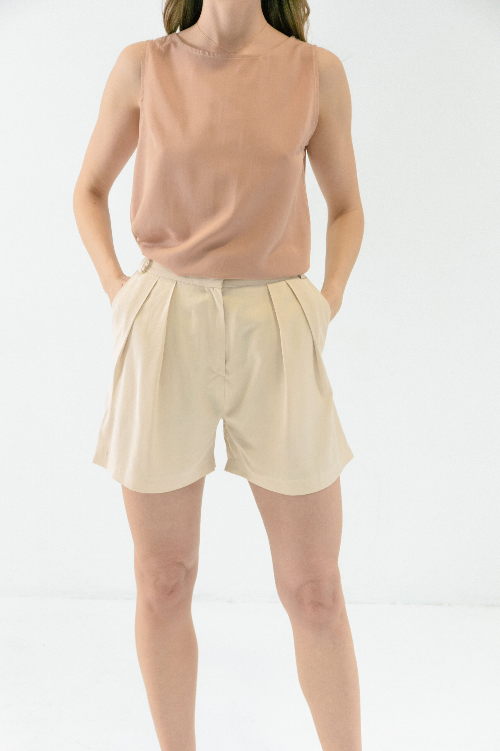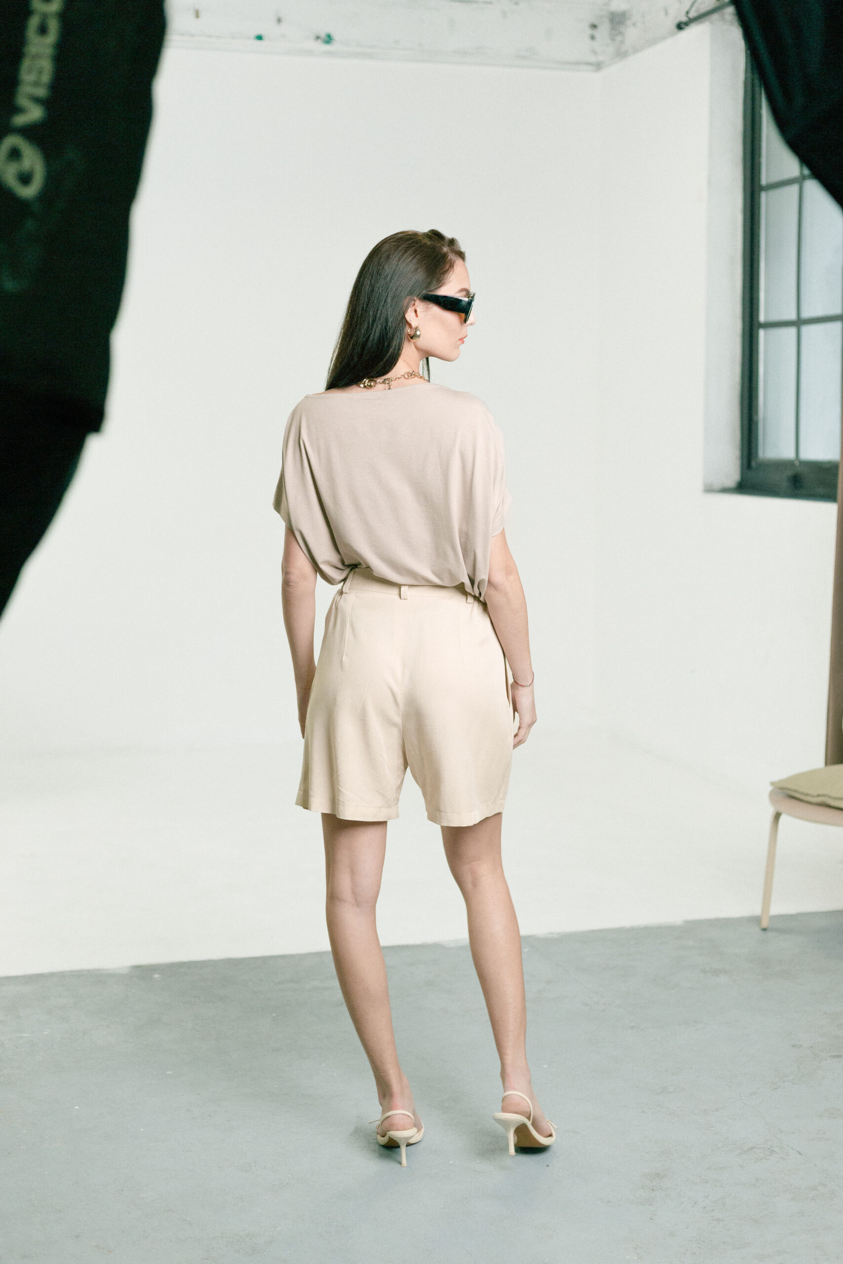 Šorts Hamptons od 50% Lyocella (Tencel®) i 50% Modala, kroj sa visokim strukom i diskretnim faltama, nastaje kao skraćena verzija naših prepoznatljivih Hamptons pantalona, ostavlja osećaj lakoće i prefinjenosti.
