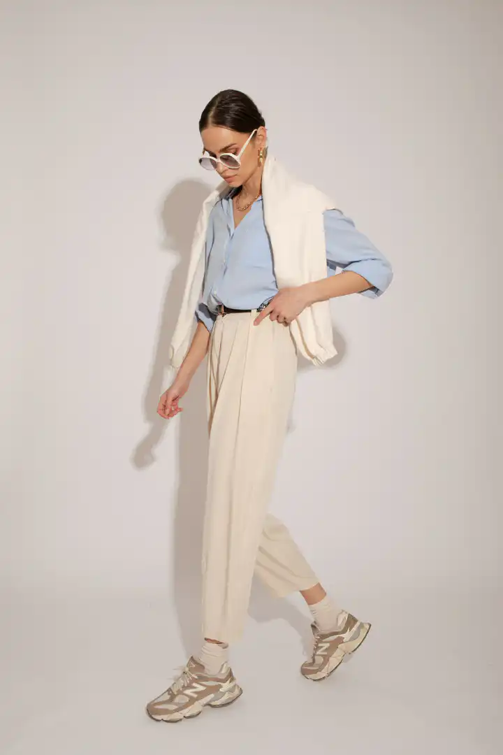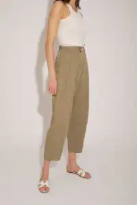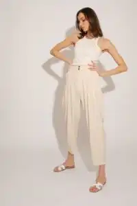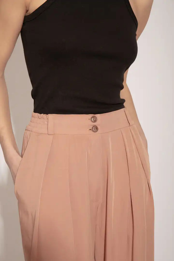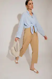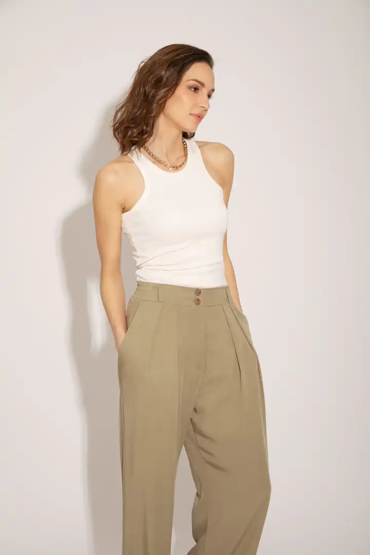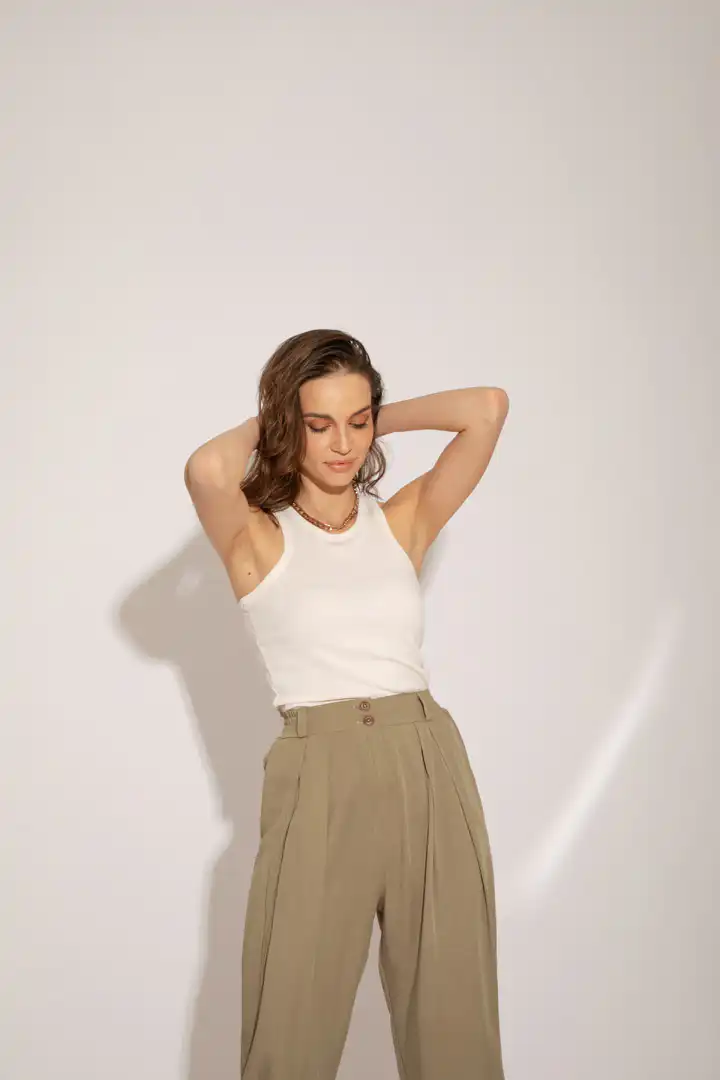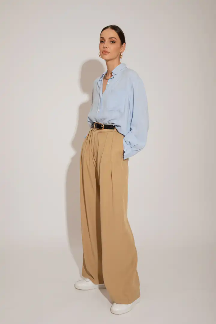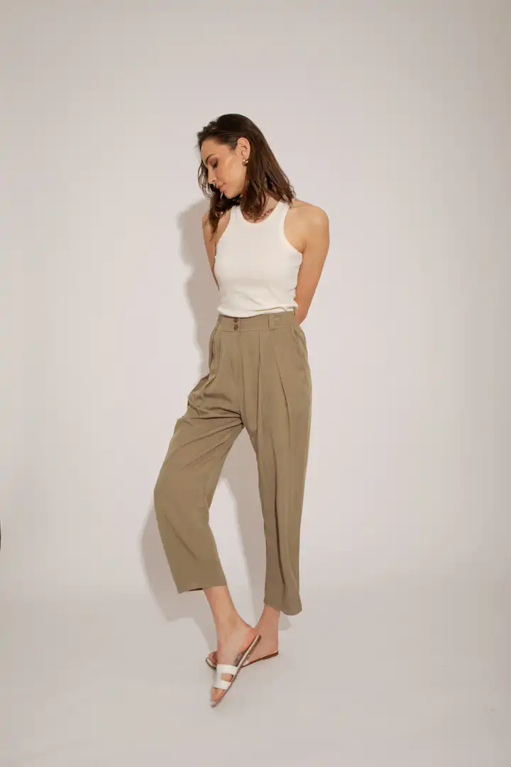Lagane pantalone od Tencela, širokog kroja, sa džepovima sa strane i duplim kopčanjem, idealne su za sve prilike i stilove. Savršeno stoje različitim tipovima građe, dugačke su i ležerne. Boja masline donosi prirodnu eleganciju i lako se kombinuje sa drugim komadima garderobe. Ove pantalone su dostupne u nijansama masline (Olive), peska (Sand), bledo roze (Blush) i slonovače (Ivory). Ne samo da su udobne, već su i trendi izbor za sve ljubitelje opuštenog stila. Bez obzira da li idete na piknik u prirodi ili na neformalni sastanak sa prijateljima, ove pantalone će vam pružiti udobnost i stil u svakoj prilici.