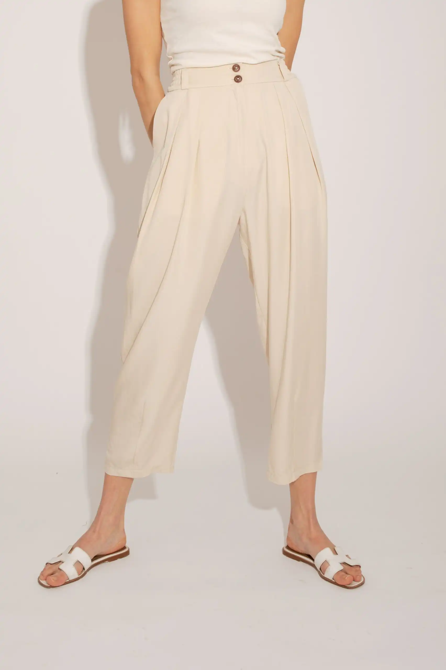 Lagane pantalone od Lyocela (Tencel®), predviđene dužine do malo iznad članaka, carrot kroja sa suptilnim ušitkom na prednjem delu, sa džepovima sa strane i duplim kopčanjem, idealne su za sve prilike i stilove. Savršeno stoje različitim tipovima građe. Pantalone Monaco su dostupne u nijansama masline (Olive), slonovače (Ivory), peska (Sand) i bledo roze (Blush). Ove pantalone pružaju kombinaciju udobnosti i stila, savršeno se uklapajući u svaku priliku, bilo da je reč o opuštenom izlasku sa prijateljima ili poslovnom sastanku. Njihov suptilan dizajn i paleta boja omogućavaju vam da kreirate različite modne kombinacije koje odražavaju vaš jedinstveni stil.